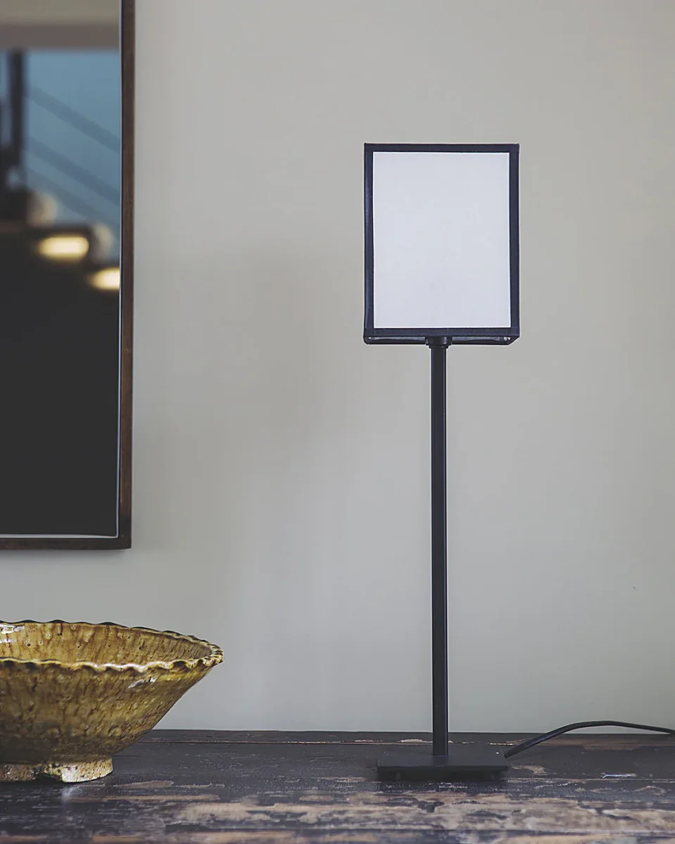 Cousine de Lory, Tara se dresse avec une légèreté étonnante sur son pied en acier fait main, qui lui confère une stature élégante. L’abat-jour aux lignes anguleuses laisse passer la lumière à travers son papier blanc, tandis qu’une bordure noire accentue chaque contour pour plus de caractère.