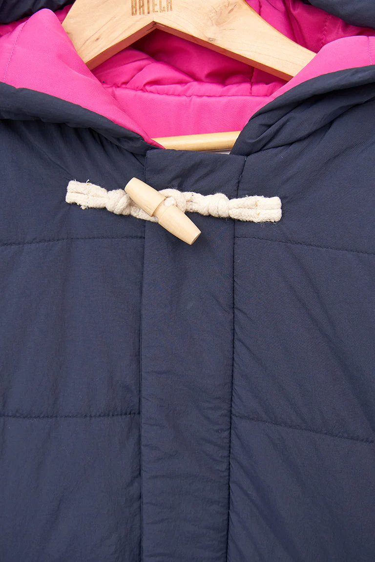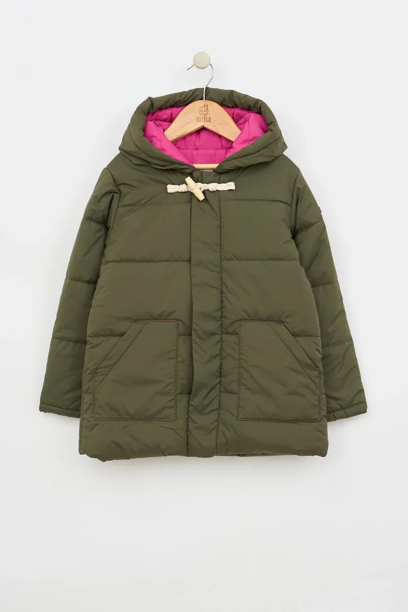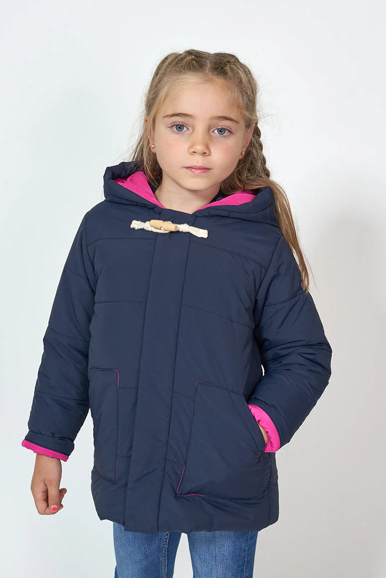 Abrigo acolchado con capucha. Confeccionado en poliéster de alta calidad con un acolchado que proporciona un aislamiento térmico eficaz. Tiene dos bolsillos plastón en el frontal y se cierra con cremallera oculta tras una tapeta y con un botón de madera en la parte superior. El interior lleva un forro rosa haciendo un bonito contraste en la prenda.