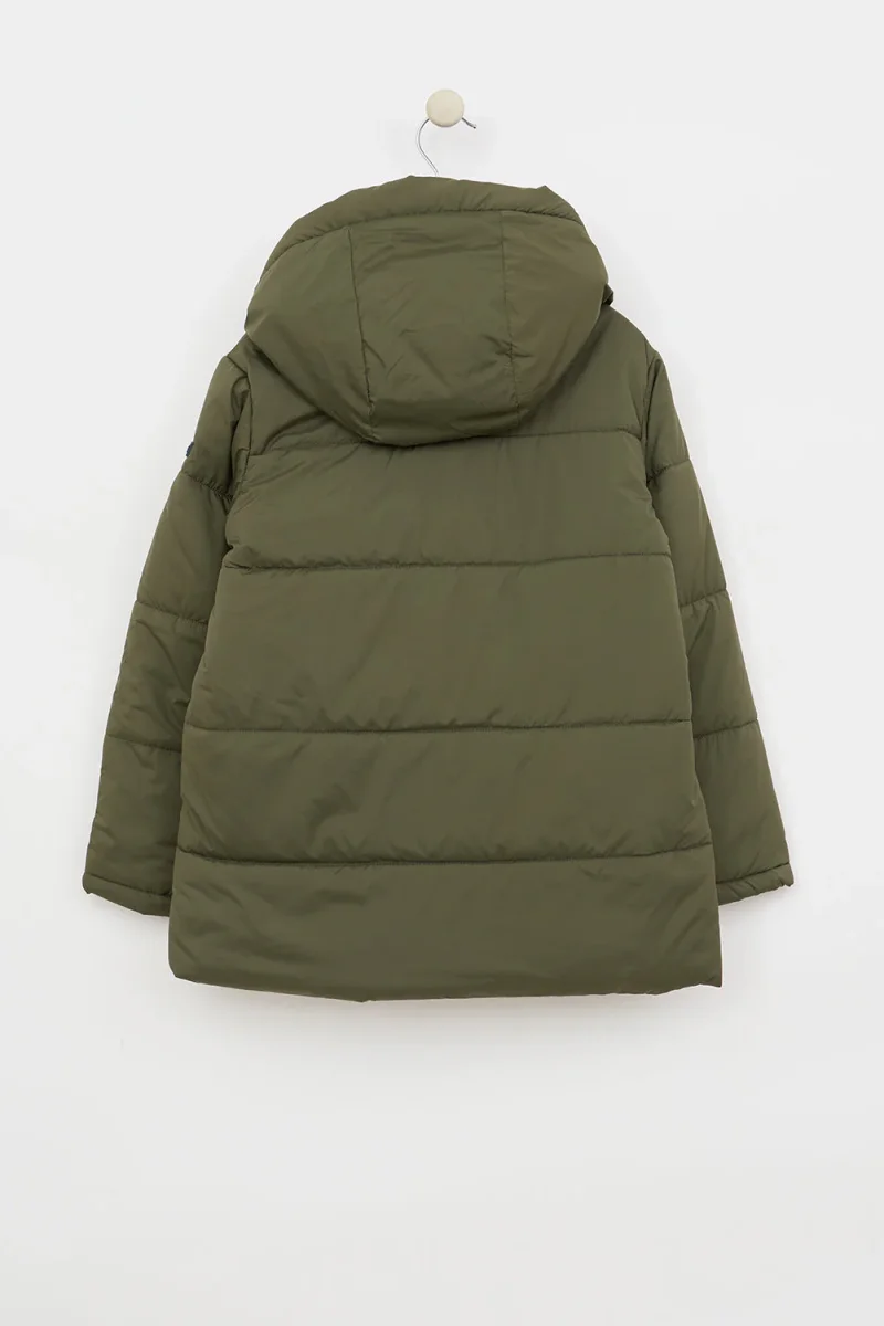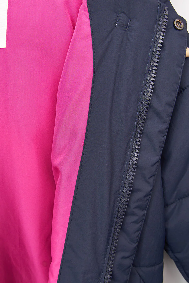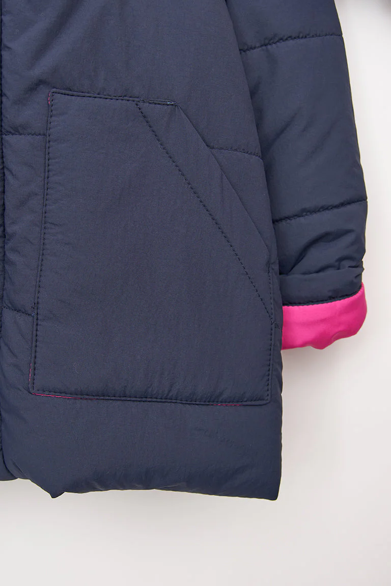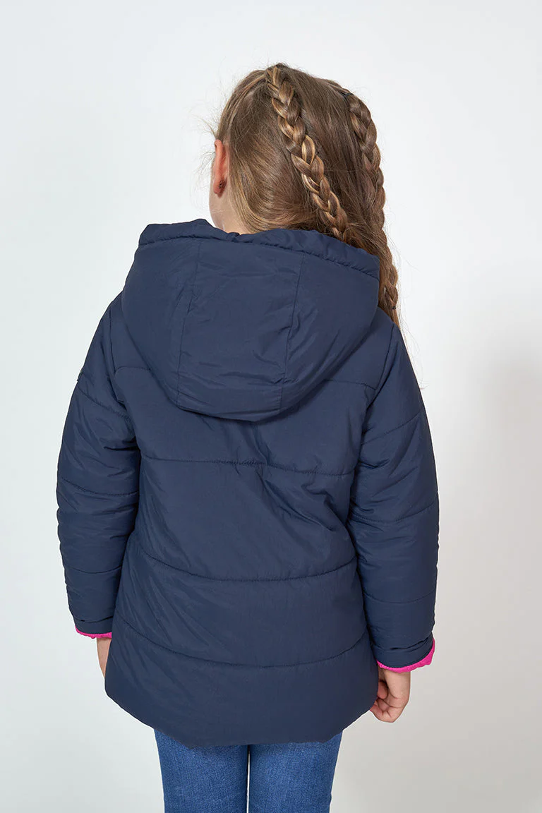 Abrigo acolchado con capucha. Confeccionado en poliéster de alta calidad con un acolchado que proporciona un aislamiento térmico eficaz. Tiene dos bolsillos plastón en el frontal y se cierra con cremallera oculta tras una tapeta y con un botón de madera en la parte superior. El interior lleva un forro rosa haciendo un bonito contraste en la prenda.