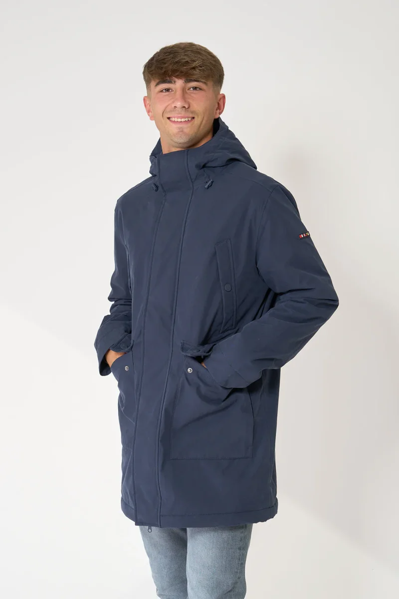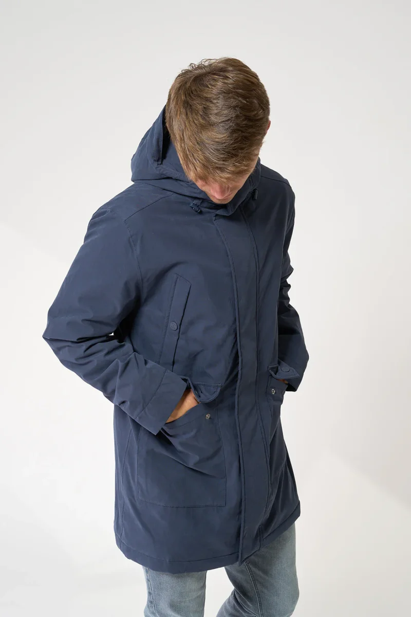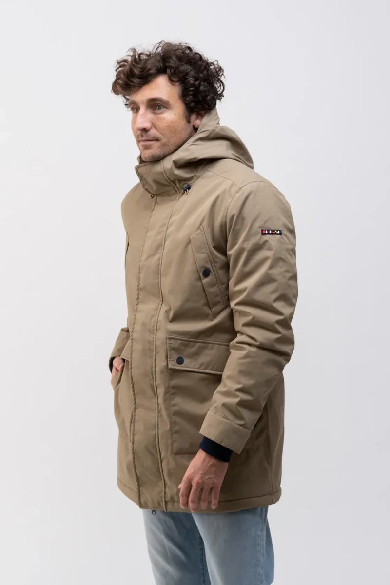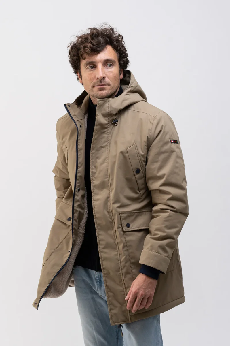 Abrigo de hombre en tejido 100% impermeable con capucha y forro interior de borreguito. Cierre frontal con cremallera de doble cursor, que se oculta con una tapeta cerrada con corchetes. Múltiples bolsillos. Dos bolsillos en el pecho con cierre de corchete, y doble bolsillo en cada costado, uno frontal con tapeta y cierre de corchete, otro en el costado con cierre de cremallera impermeable. Los bolsillos tiene un forro interior para dar mayor abrigo y confort. También tiene puños cortavientos por el interior de las mangas. Esta es una prenda exterior perfecta para usarla tanto como abrigo, como para la lluvia. Waterproof.