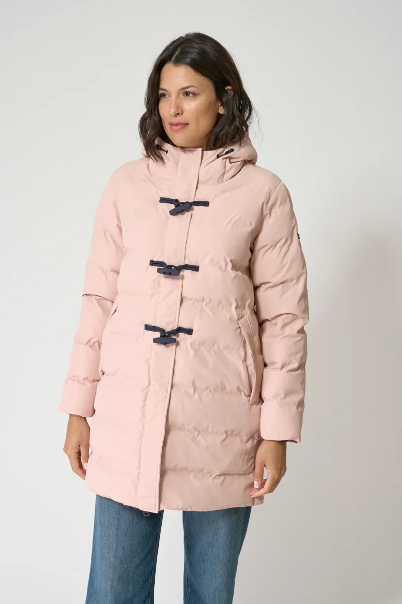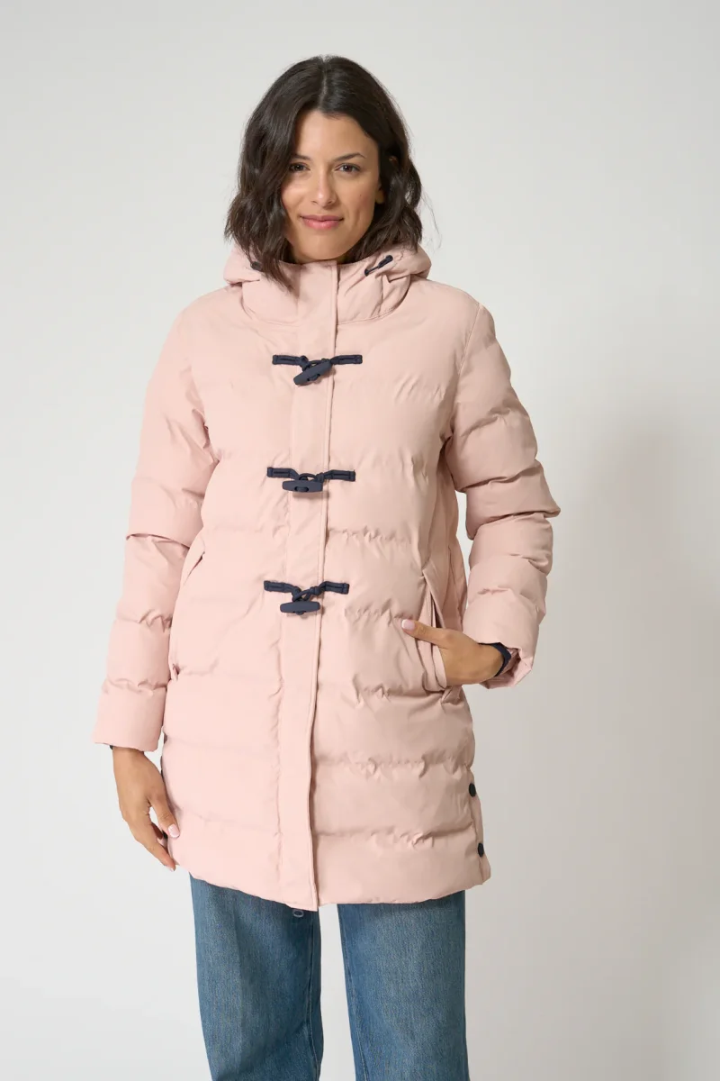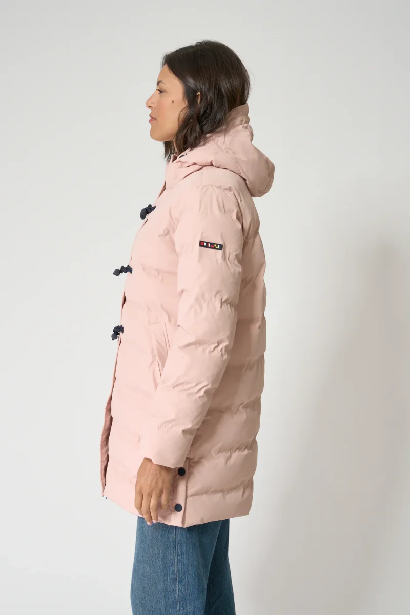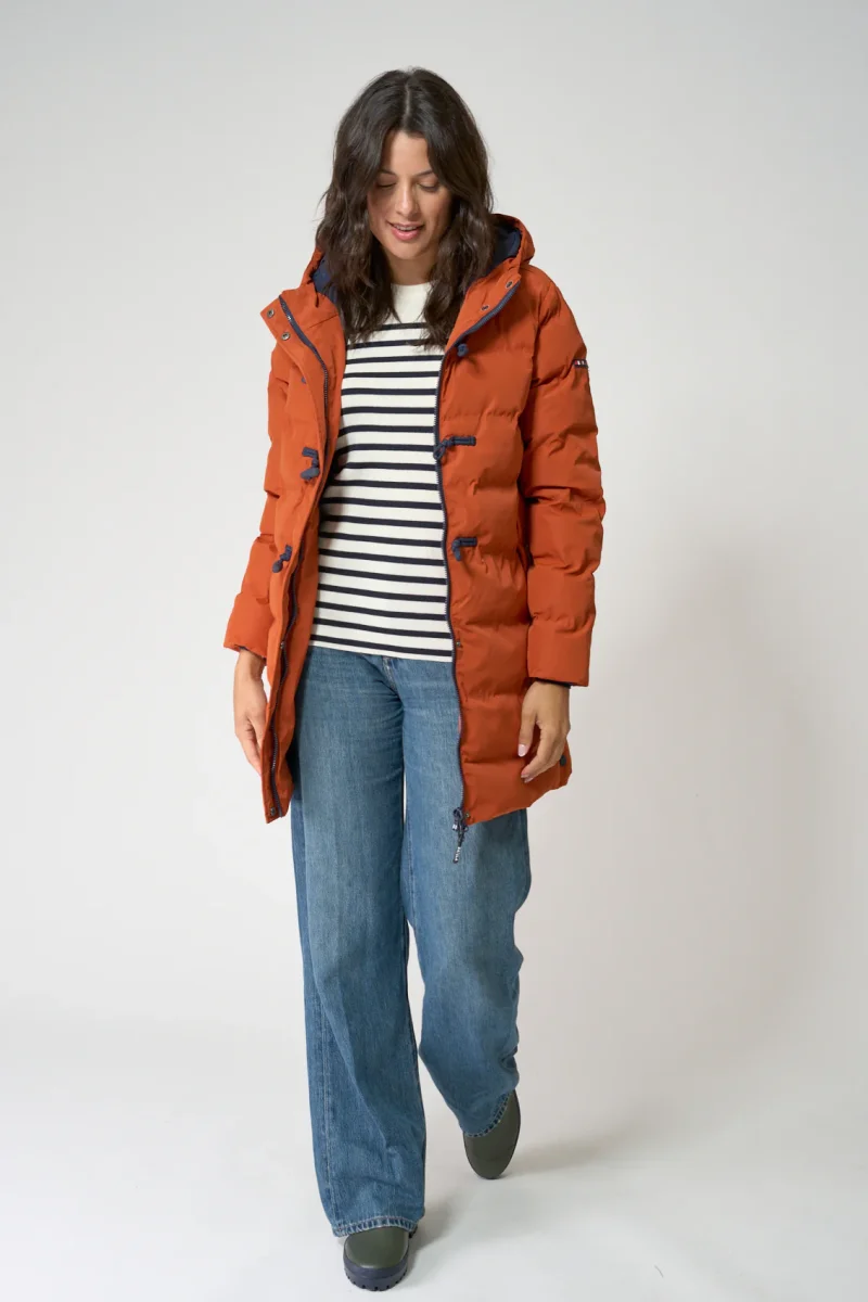 Abrigo marinero acolchado confeccionado en 100% poliéster reciclado. Las costuras van selladas lo que garantiza una impermeabilidad muy alta. Prenda con un inconfundible toque marinero gracias a los 3 botones alamar que lleva encima de la tapeta de la cremallera. Waterproof. La modelo mide 1,72m y lleva una talla 38