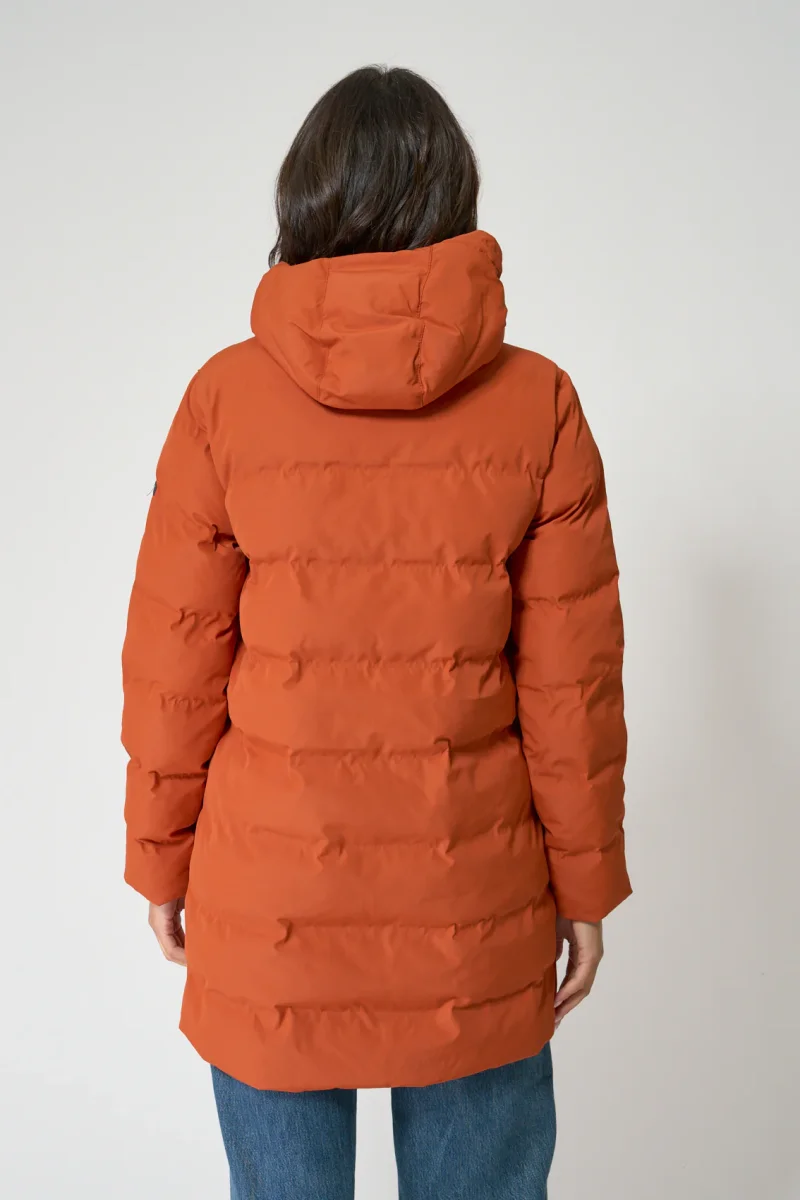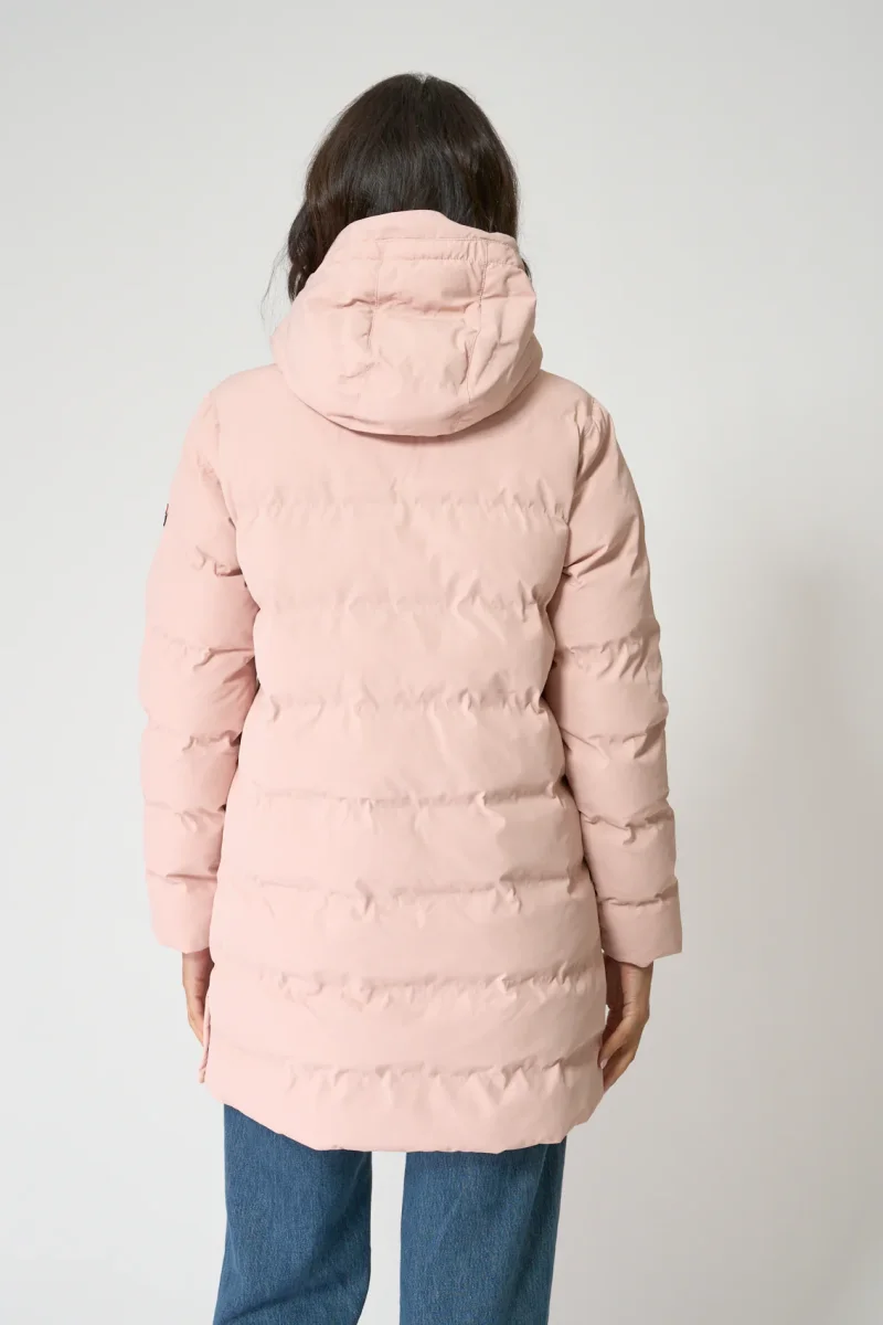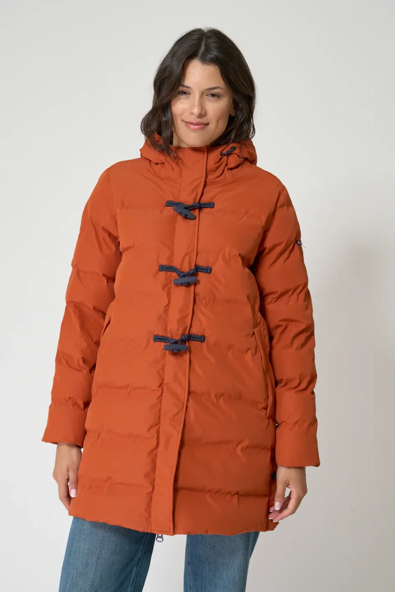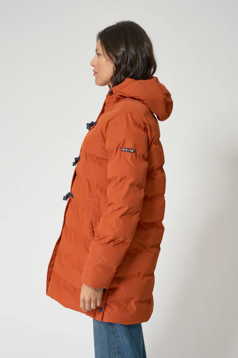 Abrigo marinero acolchado confeccionado en 100% poliéster reciclado. Las costuras van selladas lo que garantiza una impermeabilidad muy alta. Prenda con un inconfundible toque marinero gracias a los 3 botones alamar que lleva encima de la tapeta de la cremallera. Waterproof. La modelo mide 1,72m y lleva una talla 38