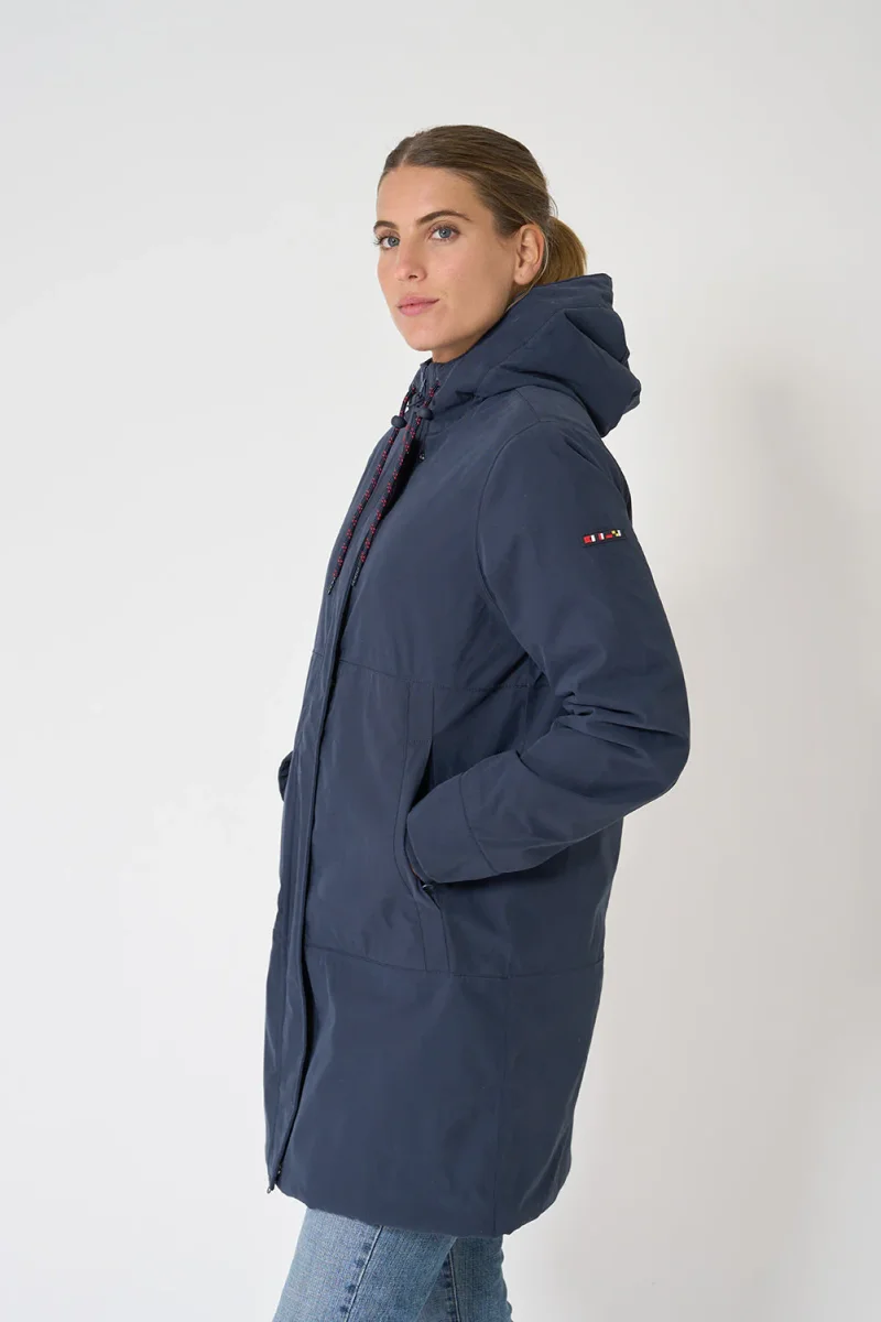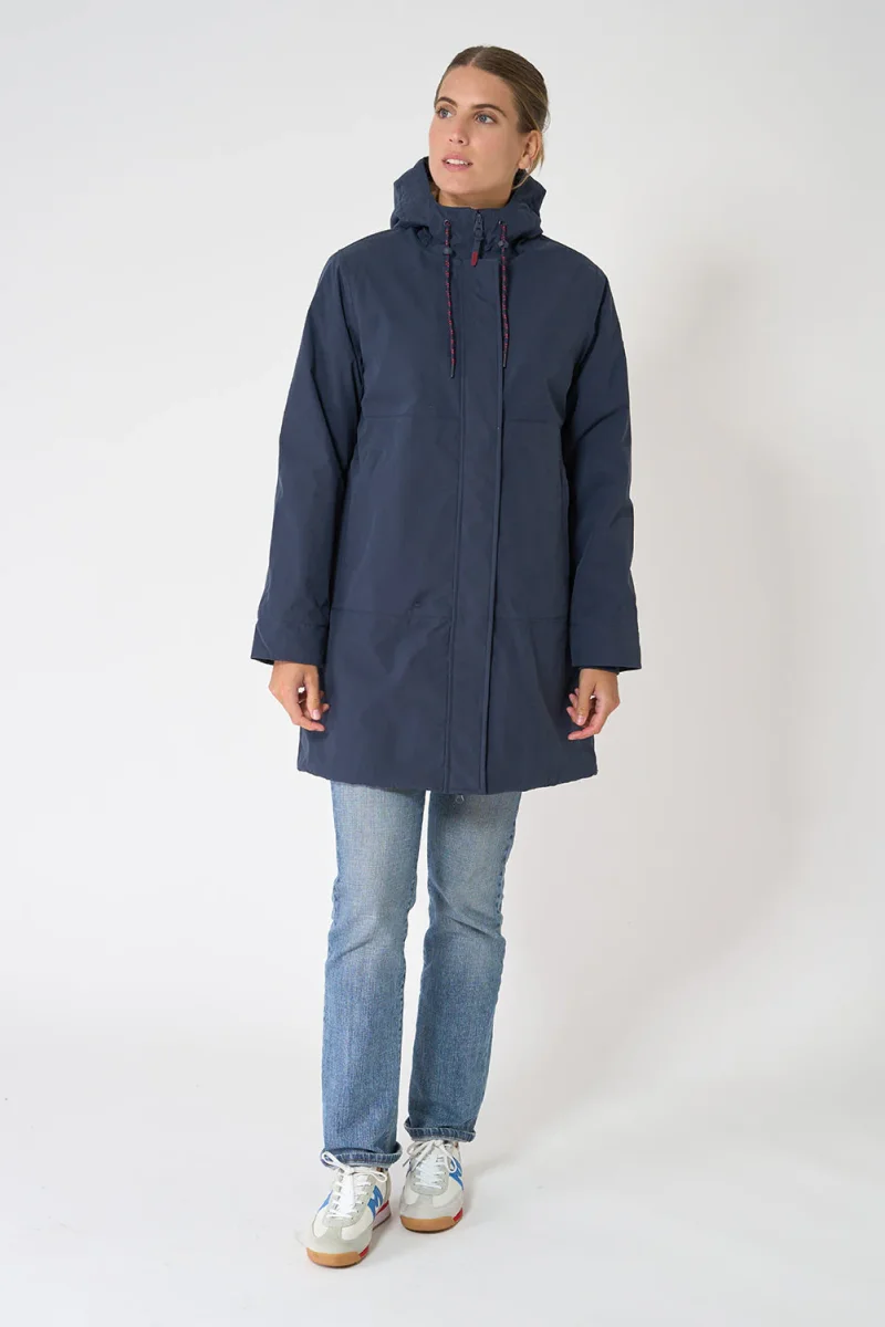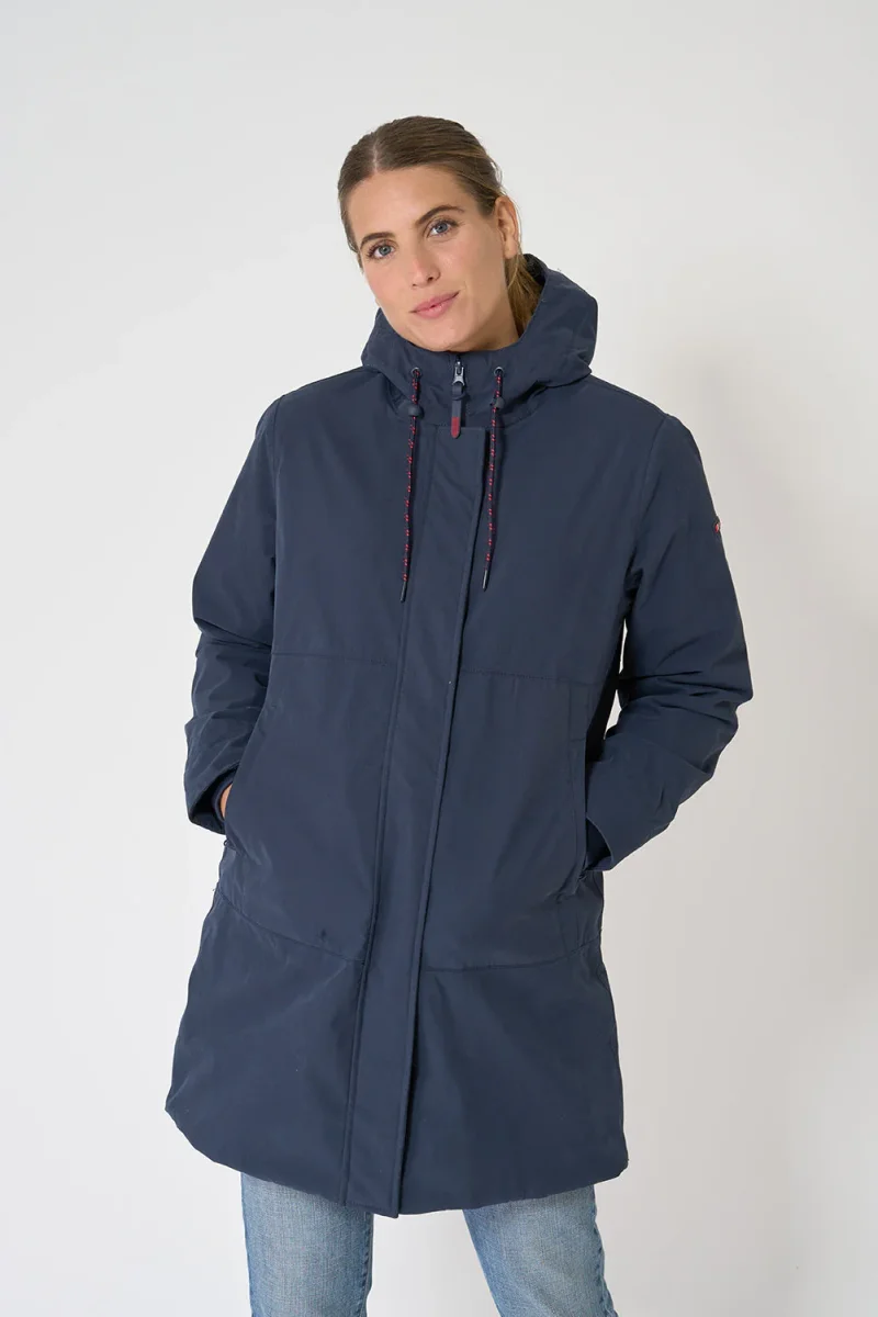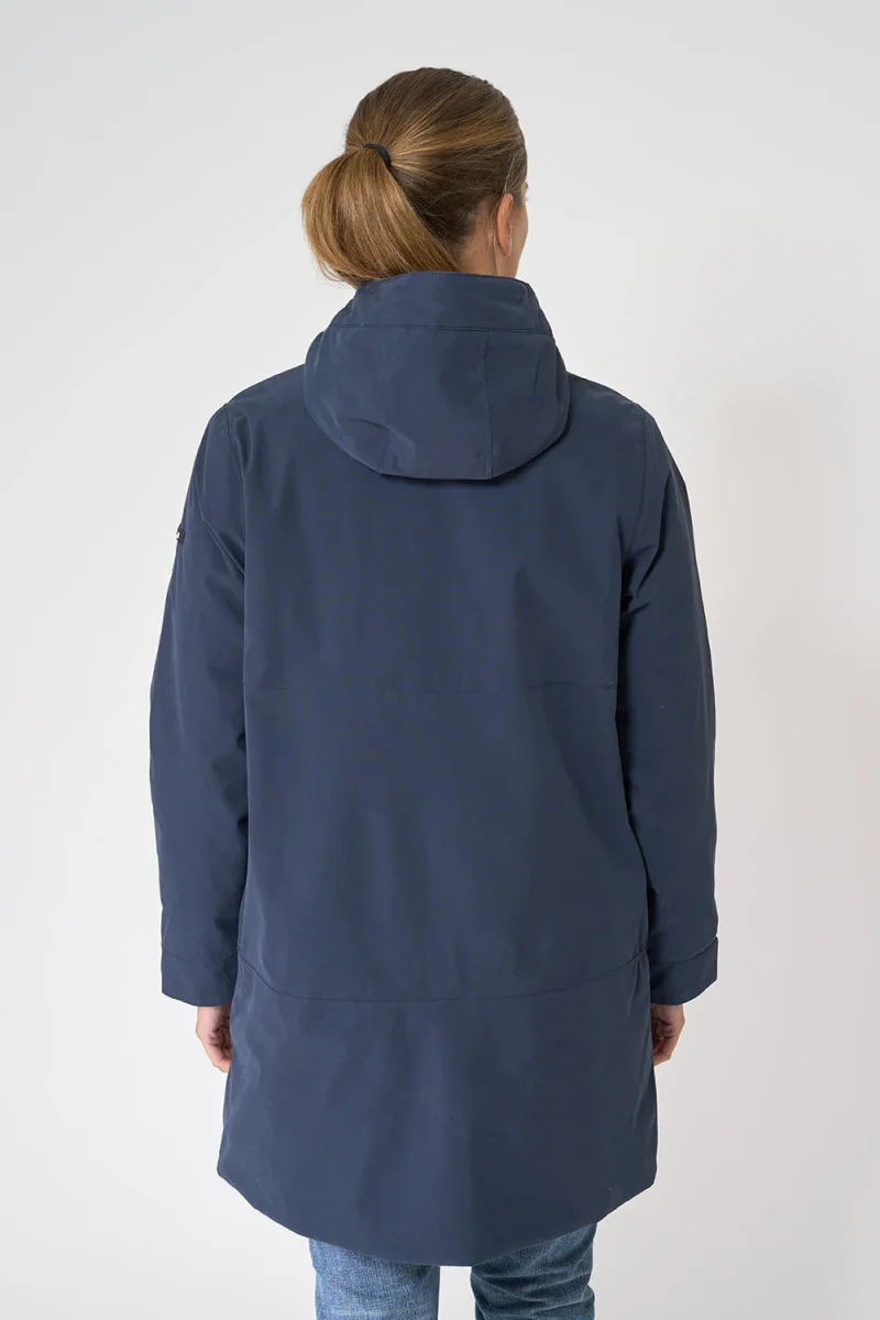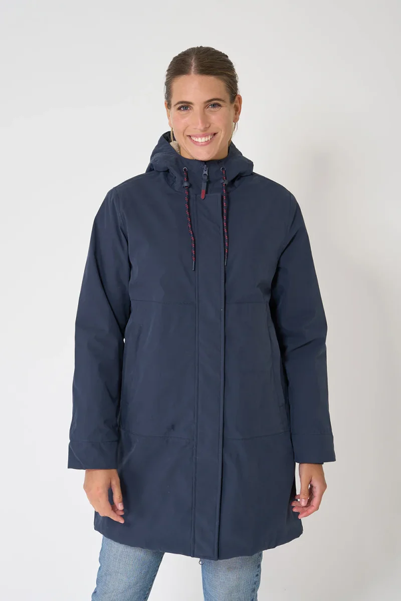 Abrigo de mujer 100% impermeable con capucha y forro interior de borreguito. Cierre frontal con cremallera de doble cursor, que se oculta con una tapeta cerrada con corchetes. Esta es una prenda exterior perfecta para usarla tanto como abrigo, como para la lluvia. La modelo mide 1,72m y lleva una talla 38.