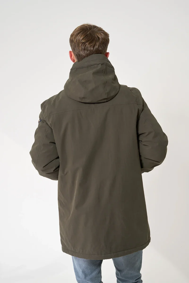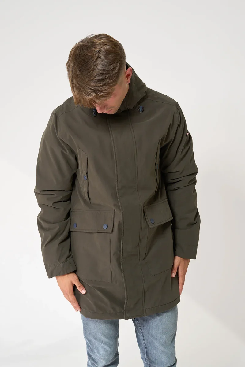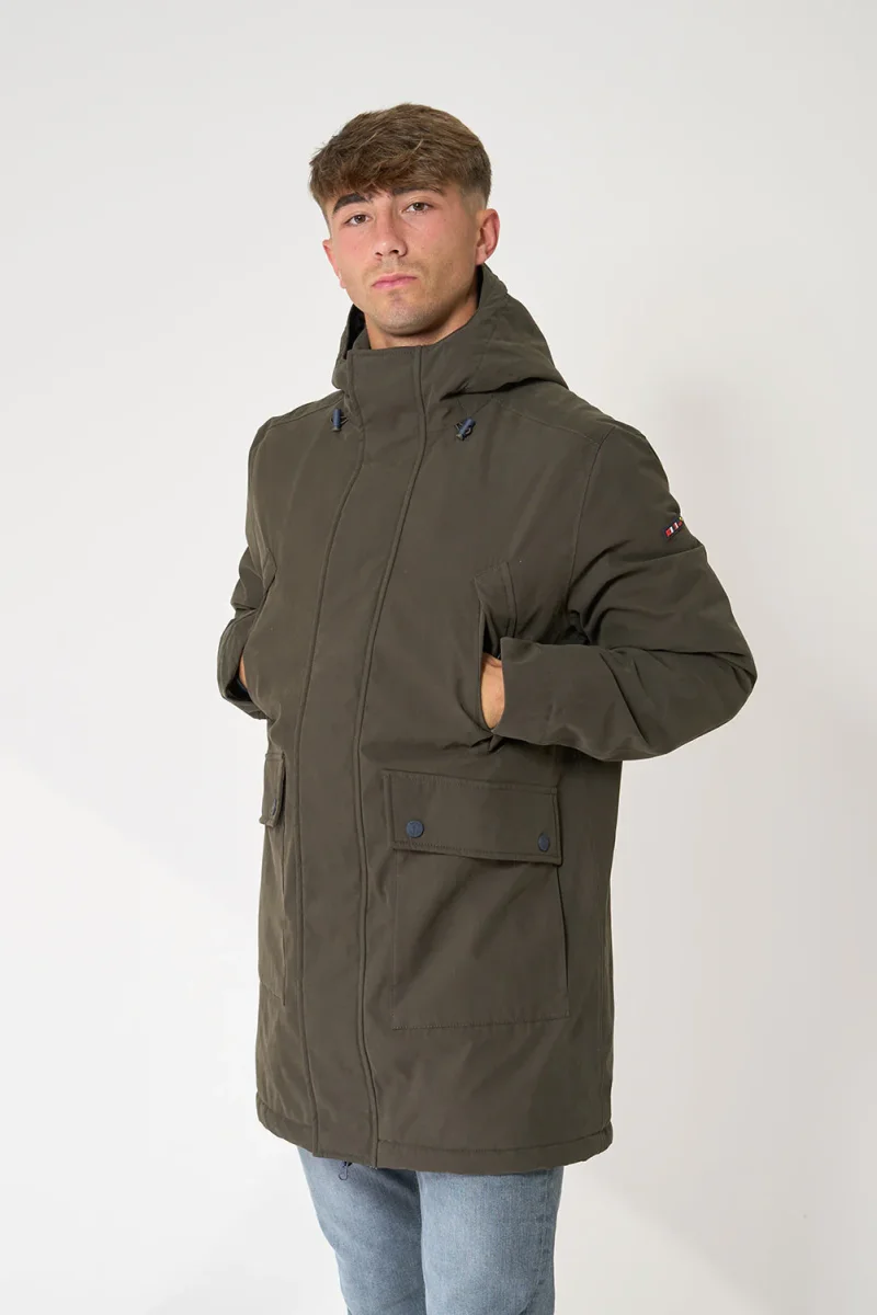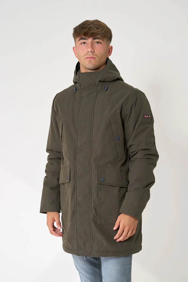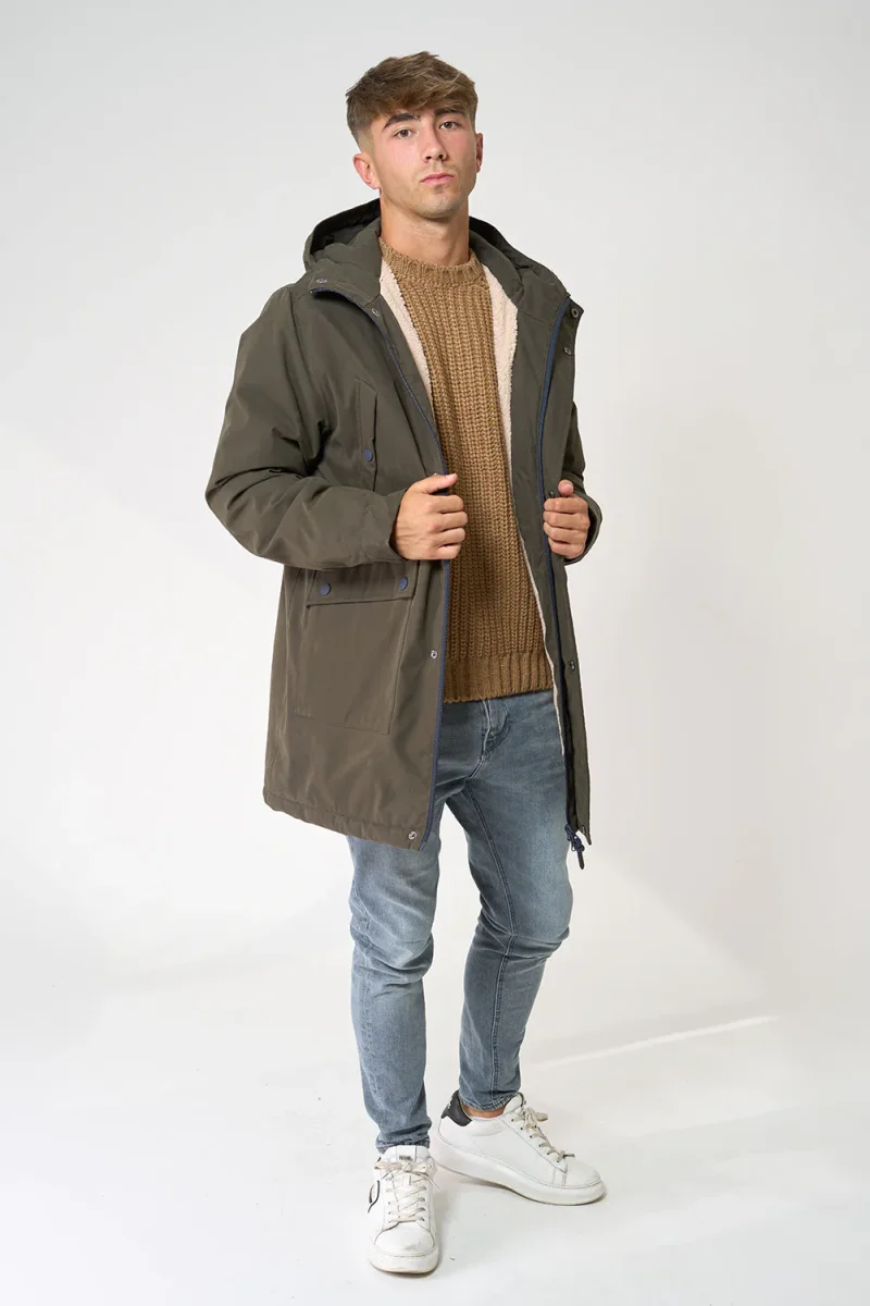 Abrigo de hombre en tejido 100% impermeable con capucha y forro interior de borreguito. Cierre frontal con cremallera de doble cursor, que se oculta con una tapeta cerrada con corchetes. Múltiples bolsillos. Dos bolsillos en el pecho con cierre de corchete, y doble bolsillo en cada costado, uno frontal con tapeta y cierre de corchete, otro en el costado con cierre de cremallera impermeable. Los bolsillos tiene un forro interior para dar mayor abrigo y confort. También tiene puños cortavientos por el interior de las mangas. Esta es una prenda exterior perfecta para usarla tanto como abrigo, como para la lluvia. El modelo mide 1,80m y lleva una talla M