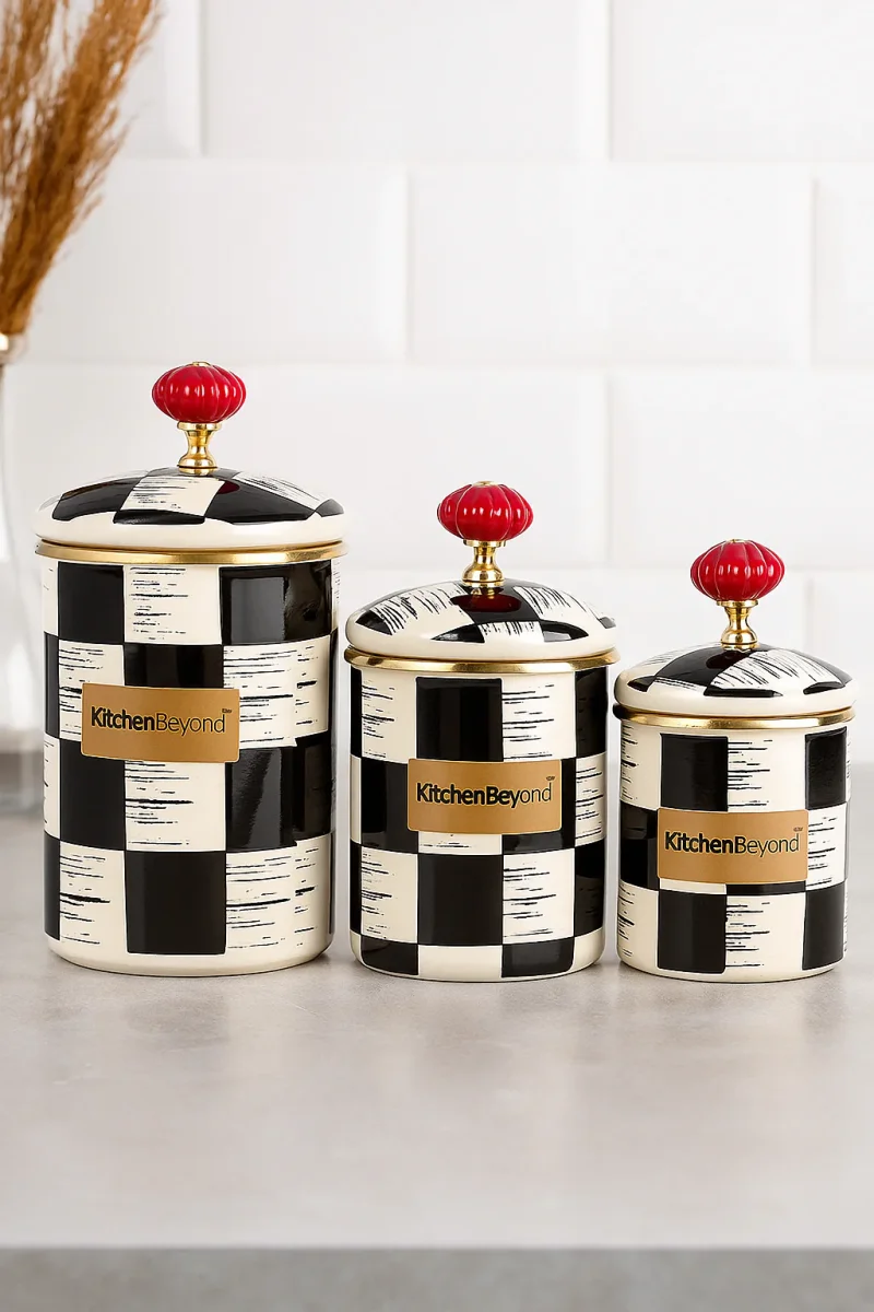 Apportez charme et fonctionnalité à votre cuisine avec ce lot de 3 bocaux en émail au motif damier, parfait pour conserver vos biscuits, gâteaux, café, thé, légumineuses ou épices tout en préservant les qualités nutritionnelles de vos aliments.