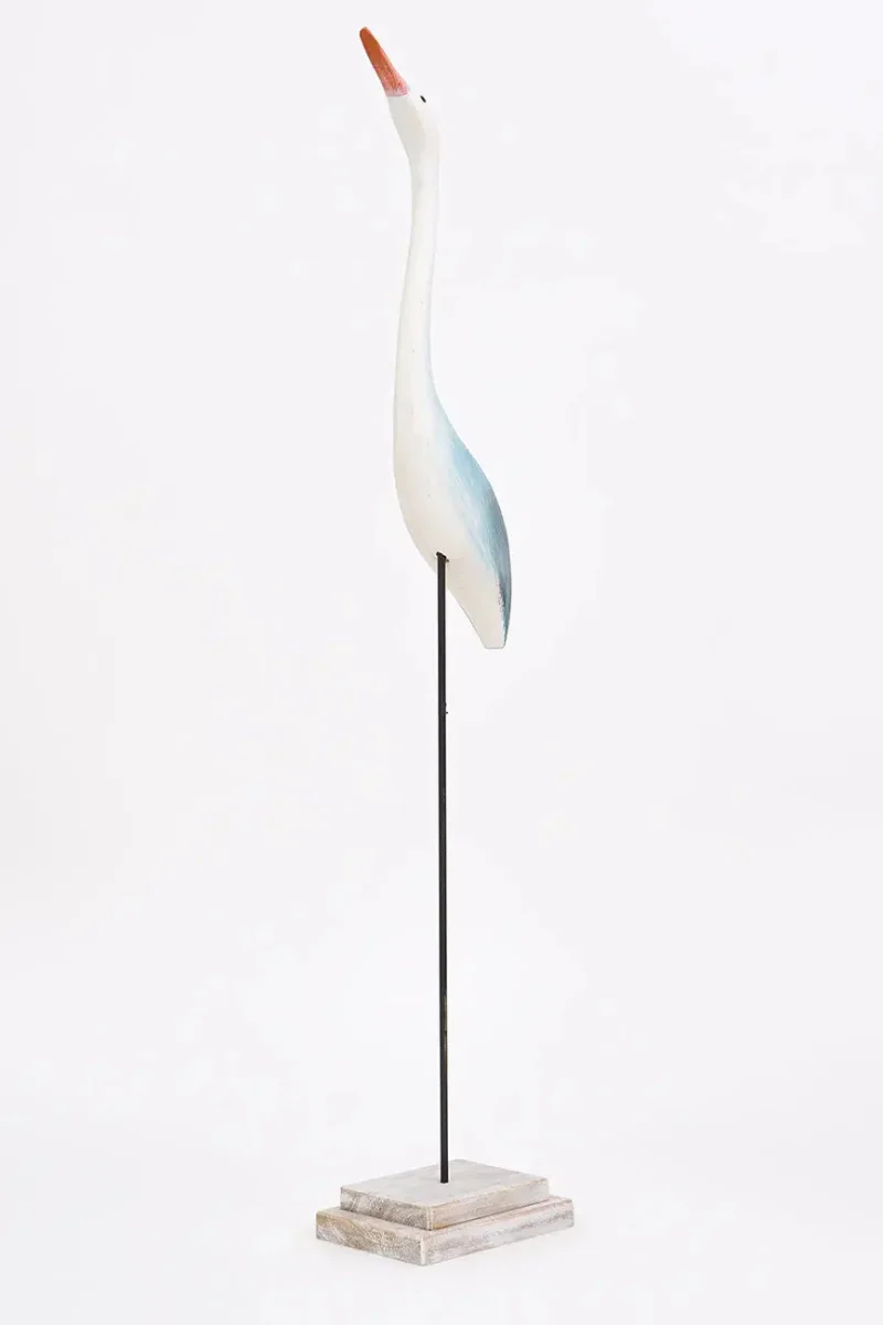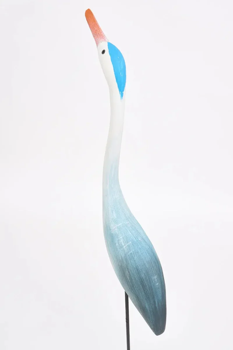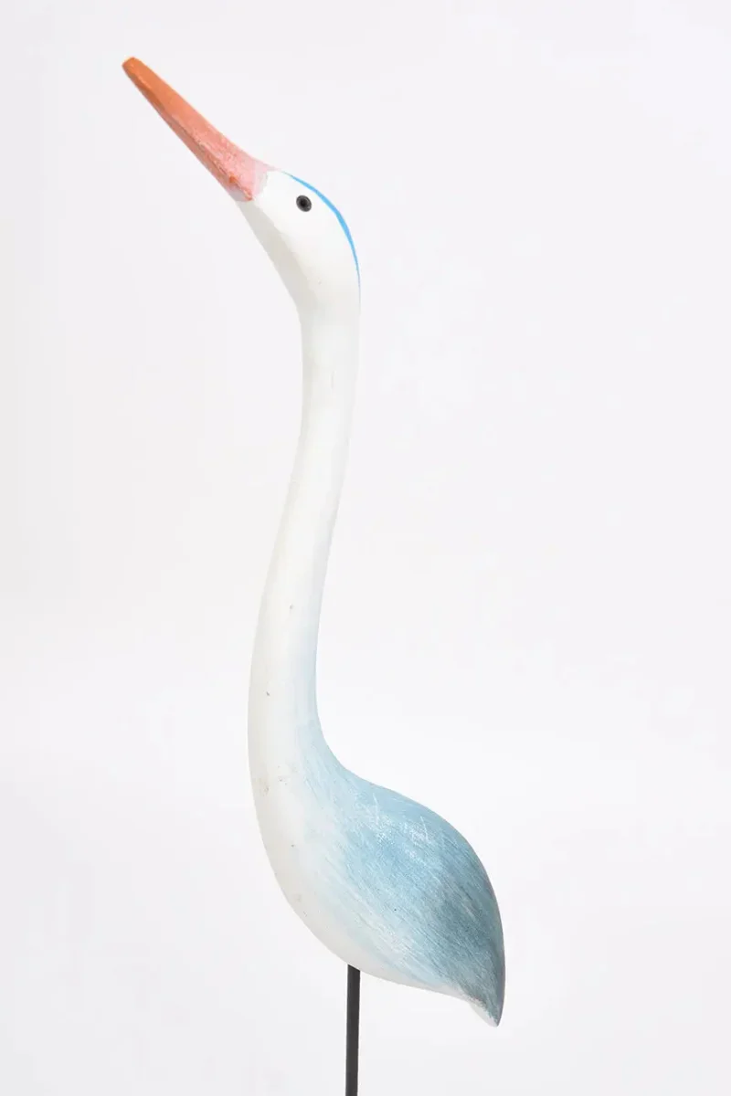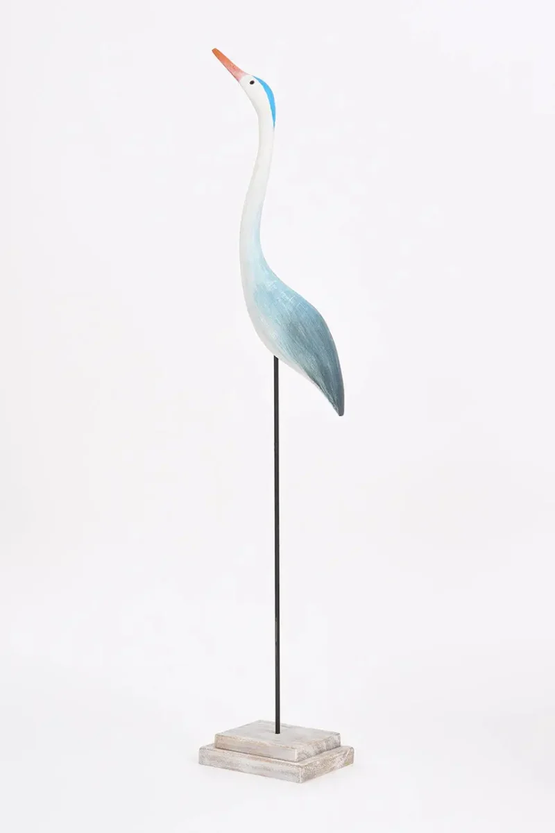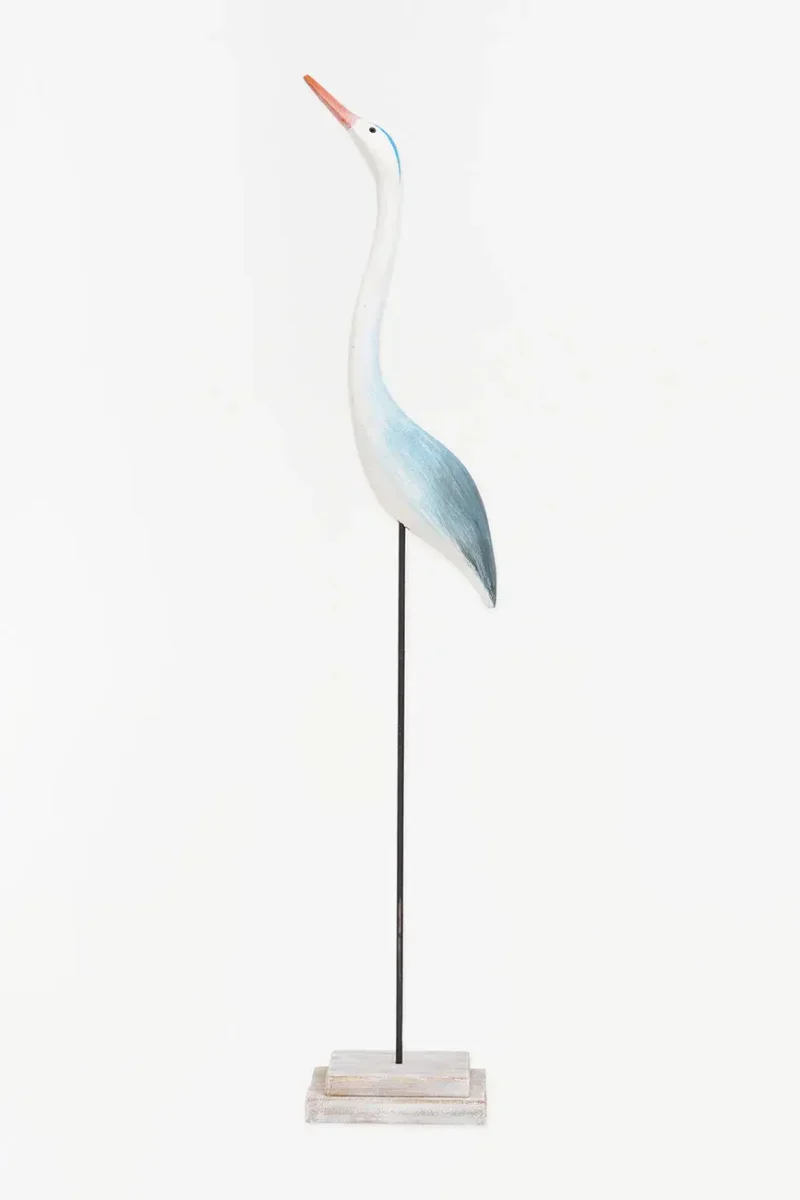 Ave costera decorativa estilizada, similar a la garza, fabricada en madera y pintada en tonos blancos y turquesa. Perfecta para añadir un toque elegante y marino a tu decoración. Evoca la tranquilidad de la costa.