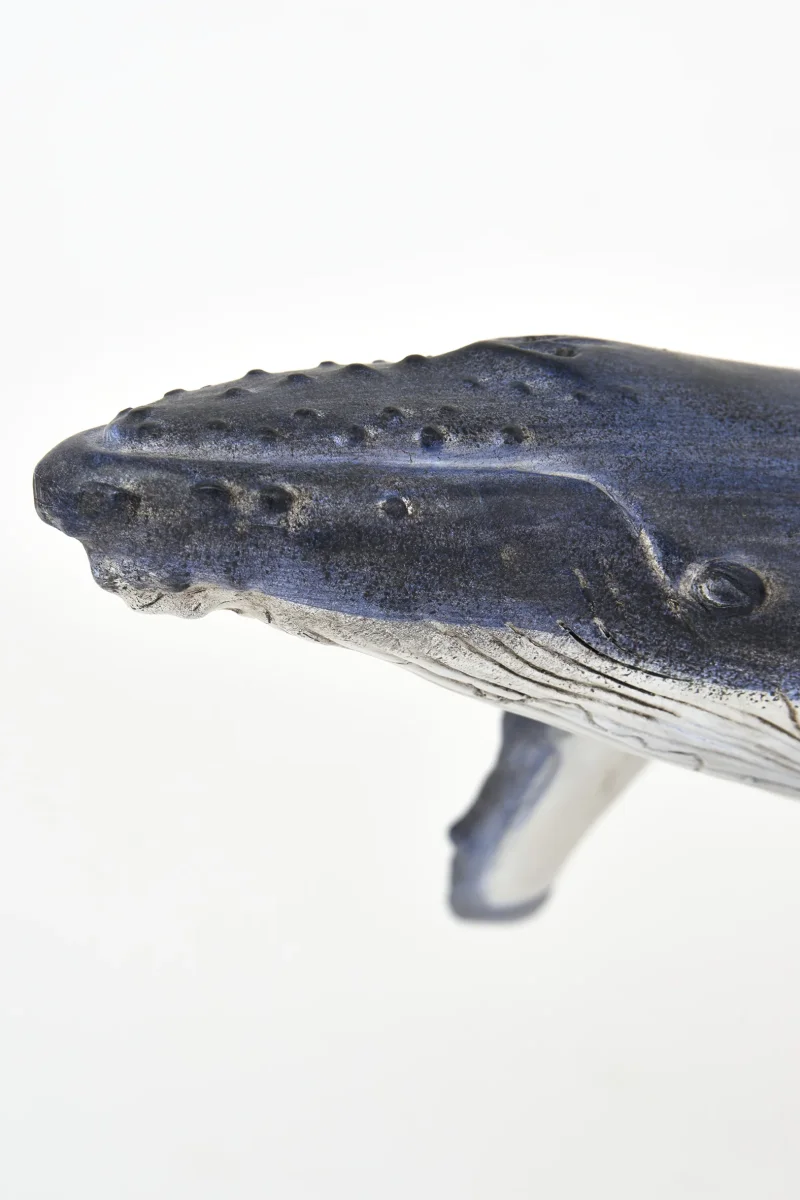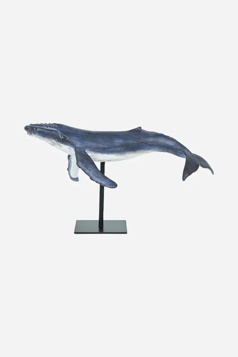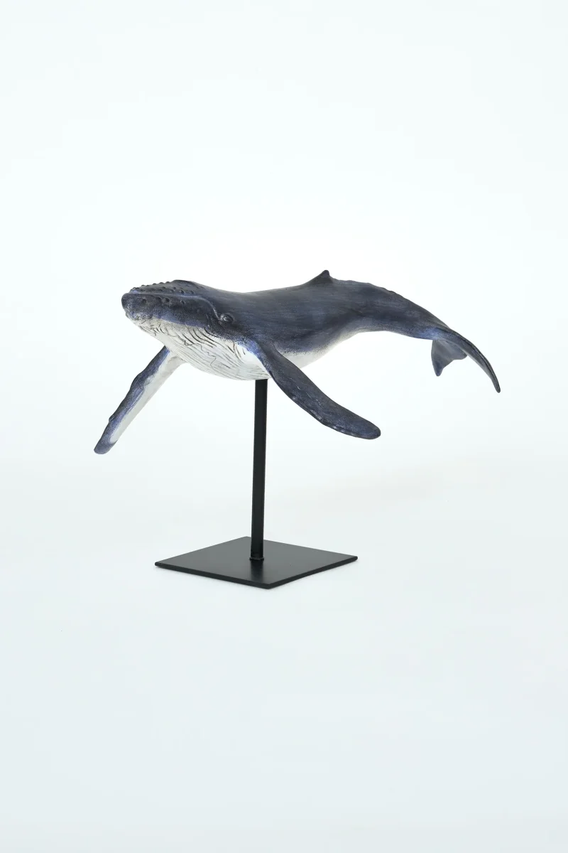 Figura decorativa de ballena realizada en poliresina con soporte metálico, inspirada en la serenidad del océano. Su acabado envejecido y su silueta elevada la convierten en una pieza ideal para aportar carácter marinero