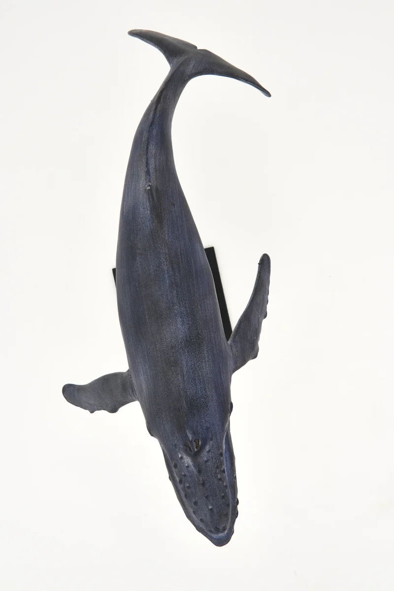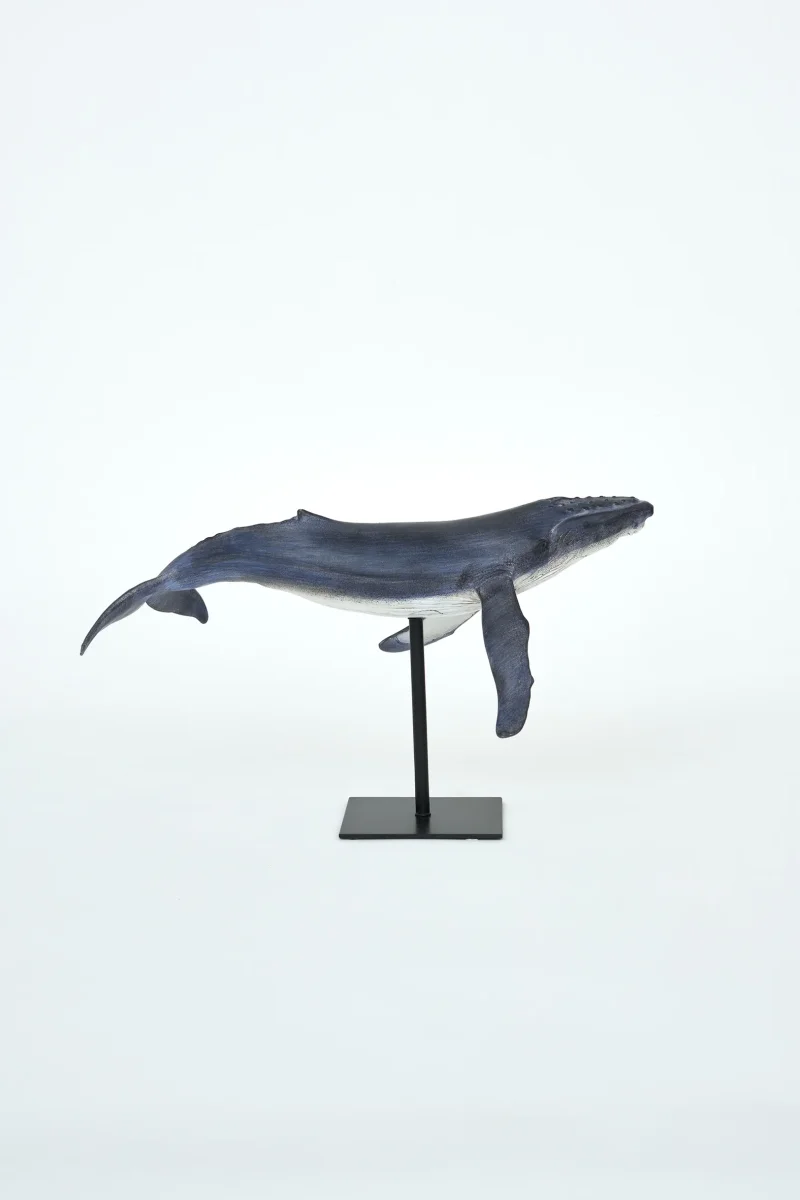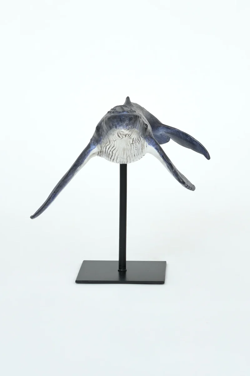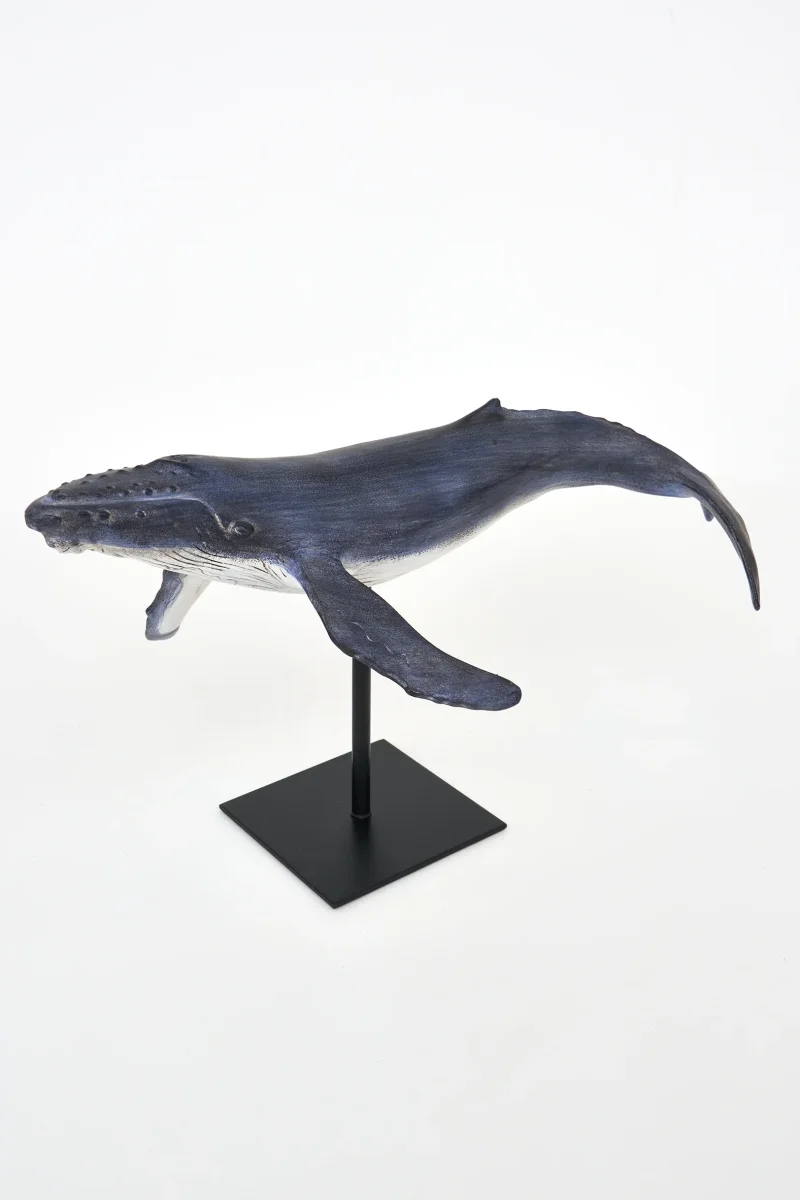 Figura decorativa de ballena realizada en poliresina con soporte metálico, inspirada en la serenidad del océano. Su acabado envejecido y su silueta elevada la convierten en una pieza ideal para aportar carácter marinero