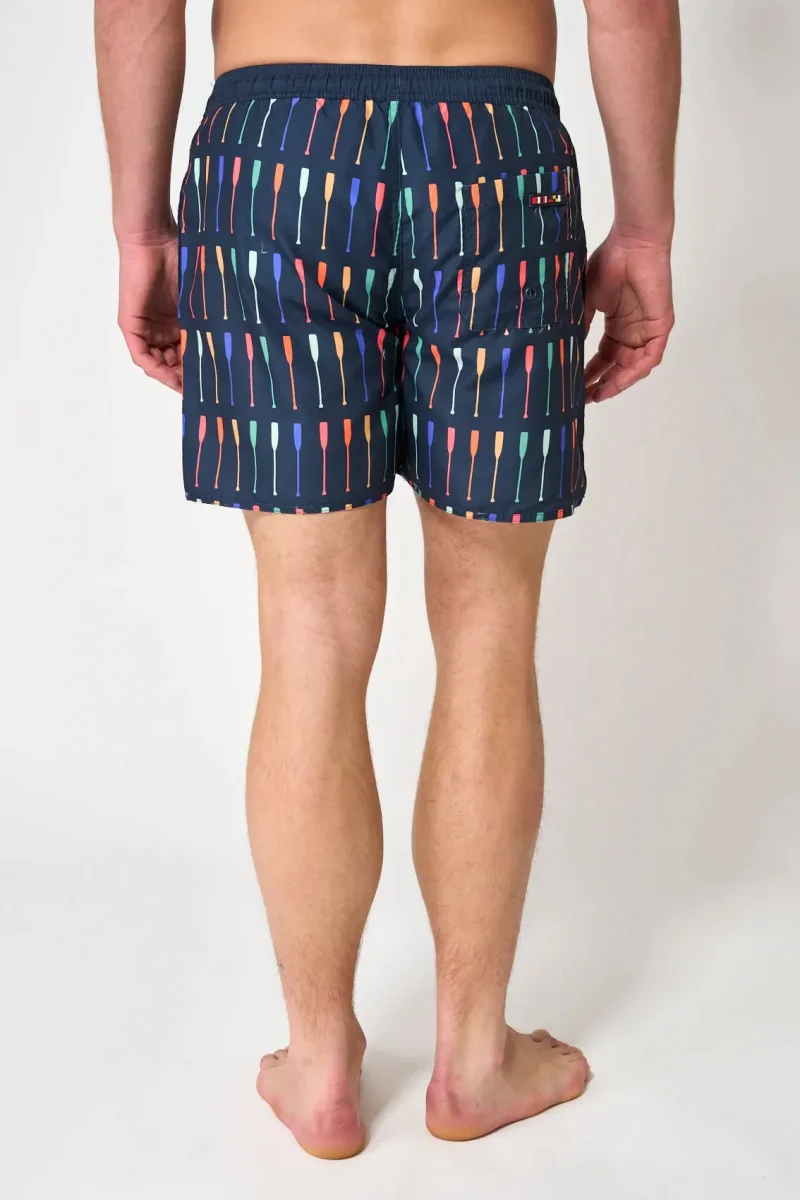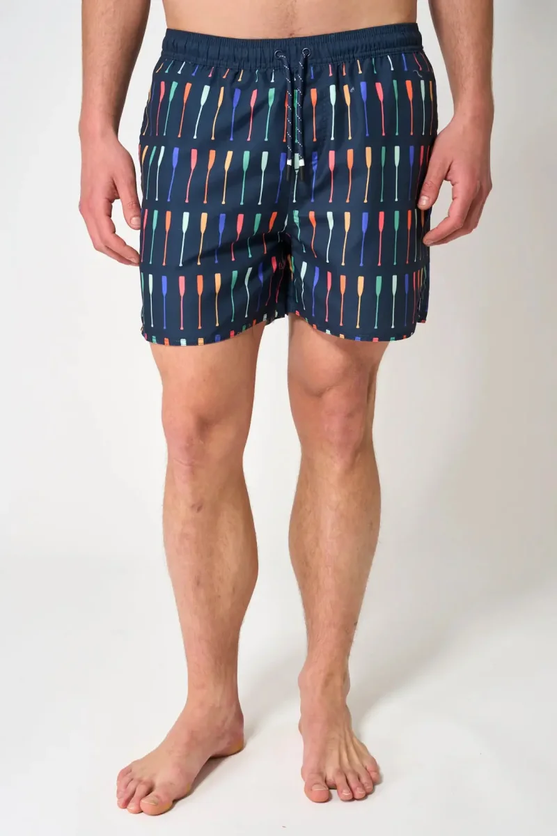 Bañador corto fabricado en poliéster con diferentes opciones de estampado. Lleva bolsillos y ajuste con cordón. Elige entre los diferentes estampados y colores y dale un aire desenfadado y, por supuesto, náutico a tus baños este verano. REF.: A2322