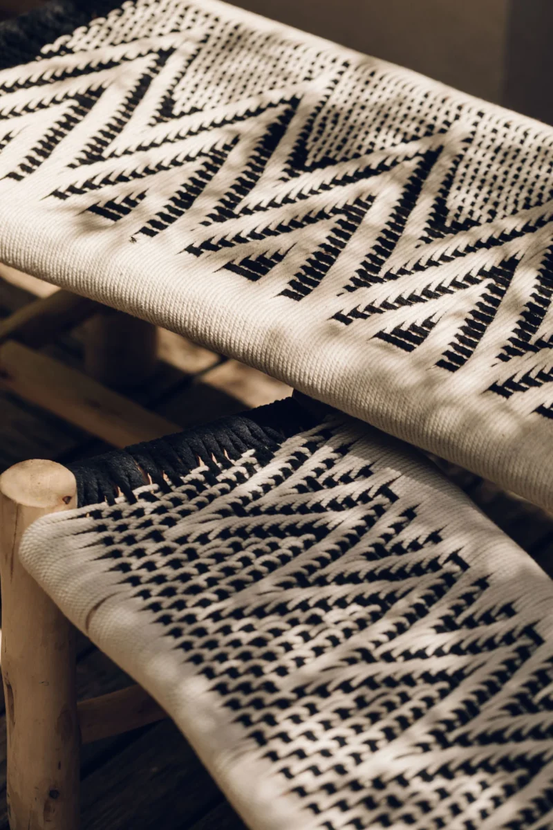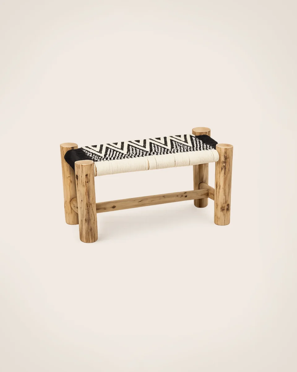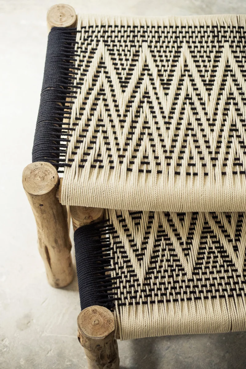 Yuka s’inspire et revisite le traditionnel banc charpoy. Sa beauté réside dans la noblesse des matières qui le composent et le soin apporté à sa fabrication artisanale. C’est surtout sa façon de déjouer les codes qui lui apporte ce charme magnétique. Parce que derrière sa silhouette épurée, presque sage, Yuka est un original… Observez comme il brouille les pistes avec son assise en corde de coton réalisée par des artisans indiens selon les méthodes de tressage traditionnelles, réinventées en vagues géométriques, à l’esthétique si contemporaine. Il se moque des frontières, dressé sur ses pieds en bois d’eucalyptus poncé pour obtenir une jolie teinte claire, aux lignes brutes comme un clin d’œil à l’artisanat d’Afrique du Nord. Il sait s’octroyer une place unique grâce à ses proportions atypiques : bout de lit ou de canapé, mais aussi en table d’appoint..