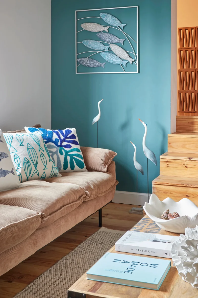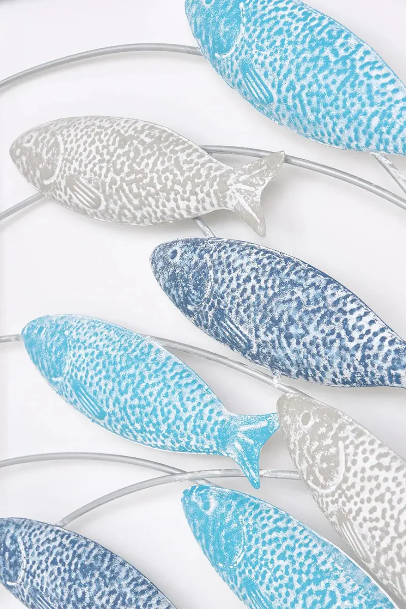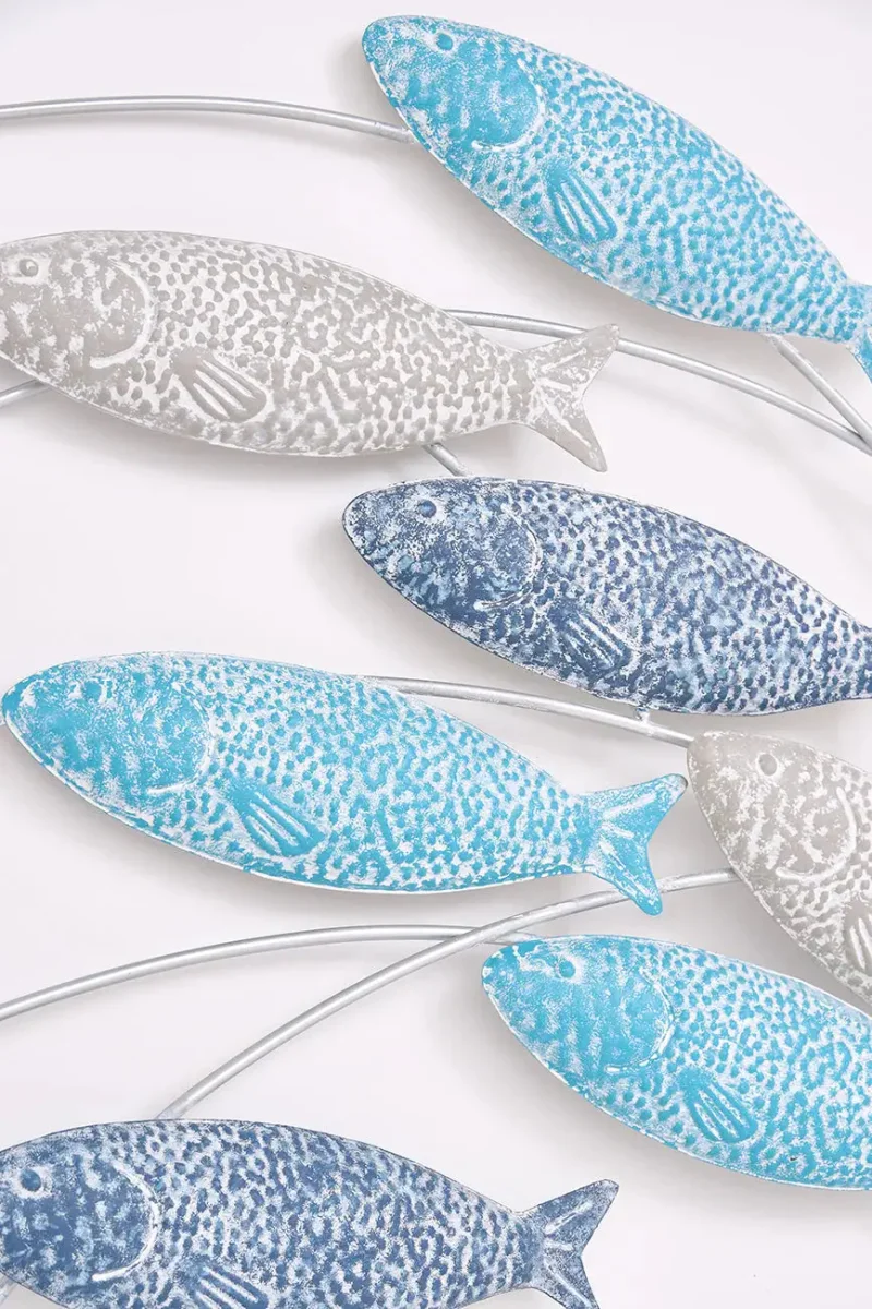 Este banco de peces de hojalata, enmarcado con metal envejecido, es una pieza decorativa única. Su acabado rústico y diseño detallado lo convierten en un complemento ideal para colgar en paredes, aportando un toque marinero y vintage a cualquier espacio.