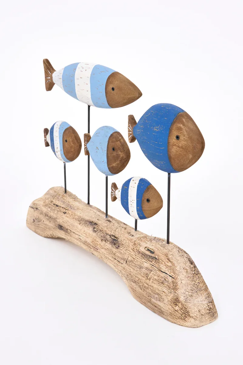 Los peces están pintados a rayas blancas y azules y en tonos azules con acabado envejecido.