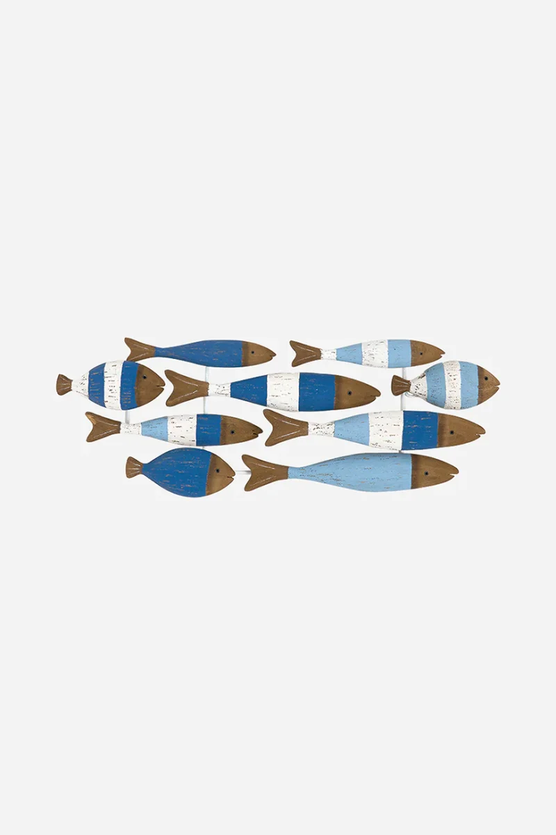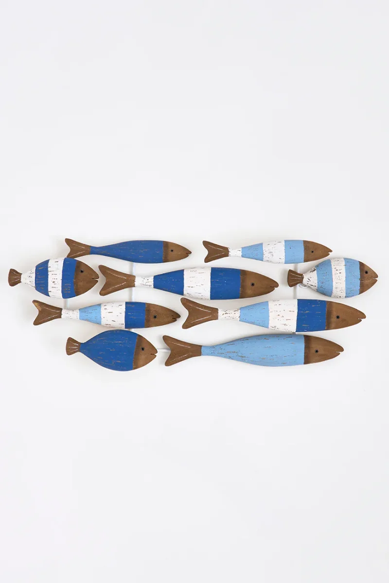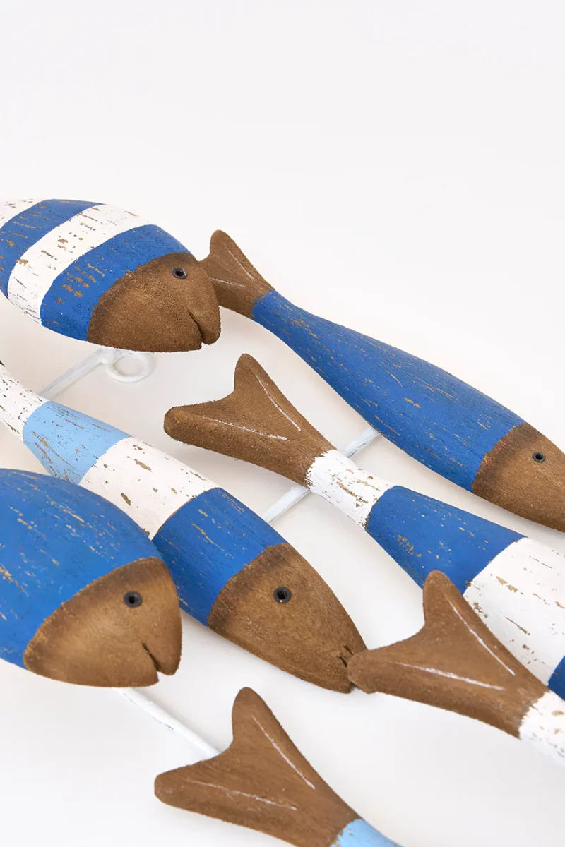 Banco de peces elaborados en madera. Los peces están pintados a rayas blancas y azules y en tonos azules con acabado envejecido. Un complemento decorativo con inspiración marinera para paredes.