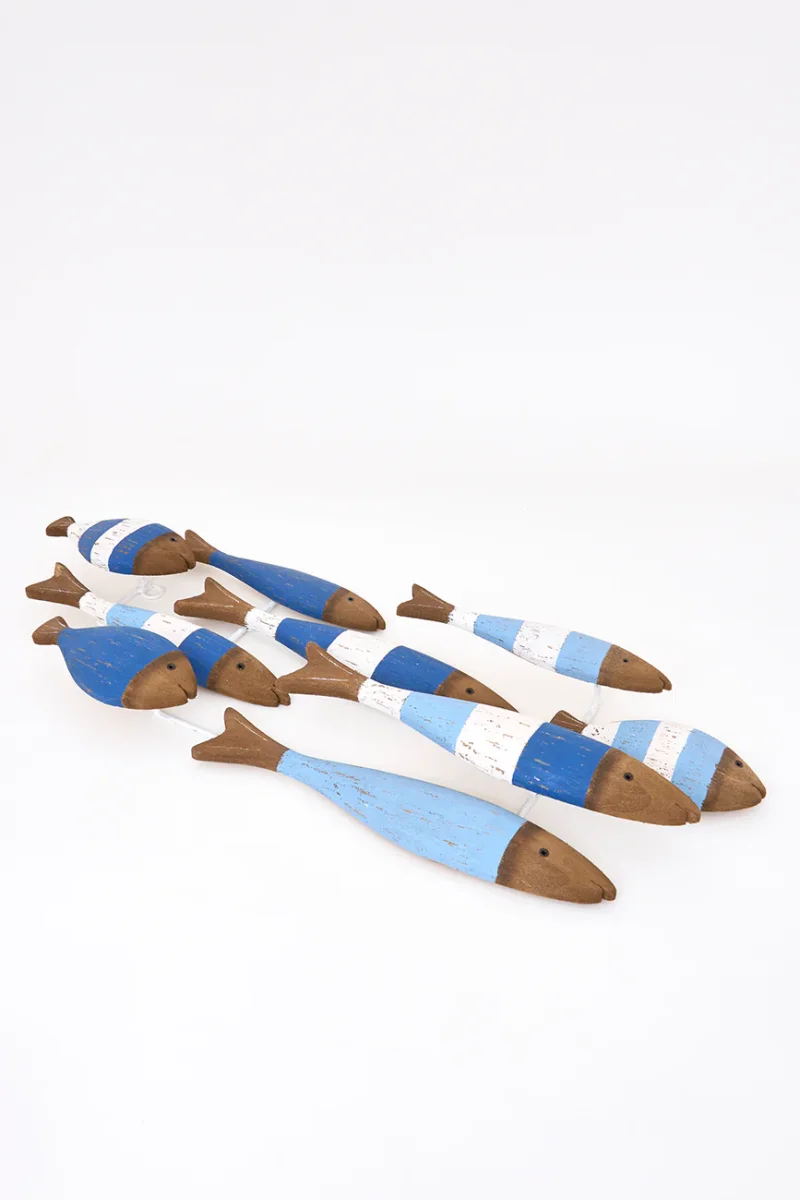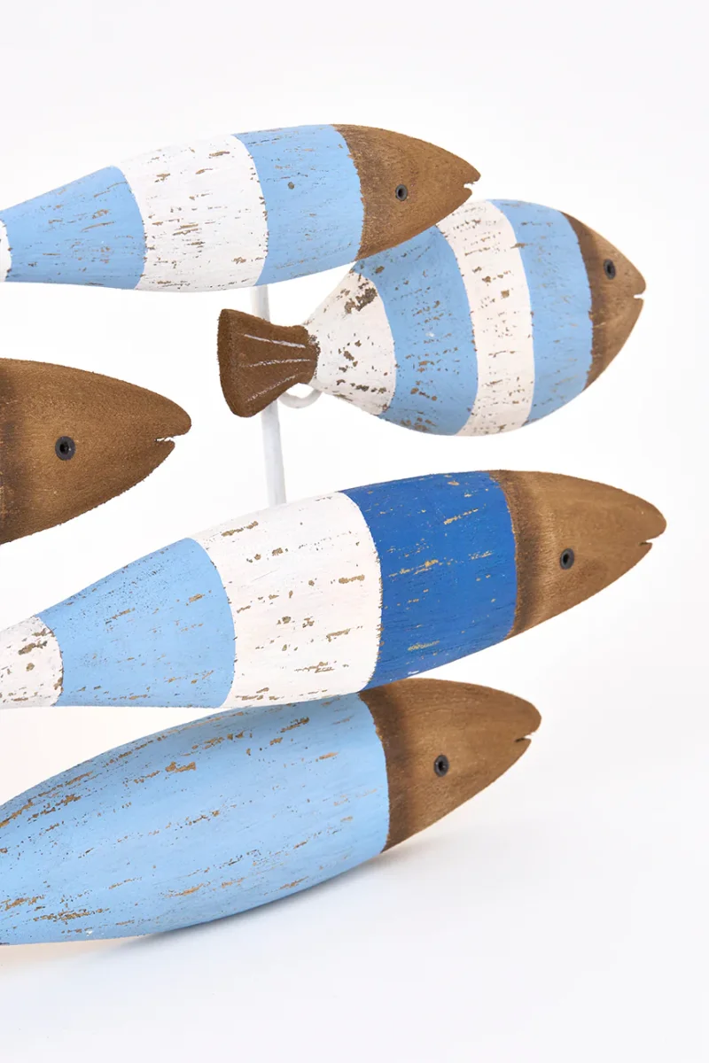 Los peces están pintados a rayas blancas y azules y en tonos azules con acabado envejecido.