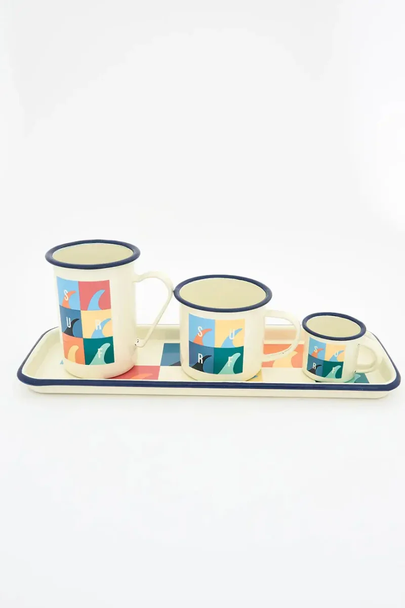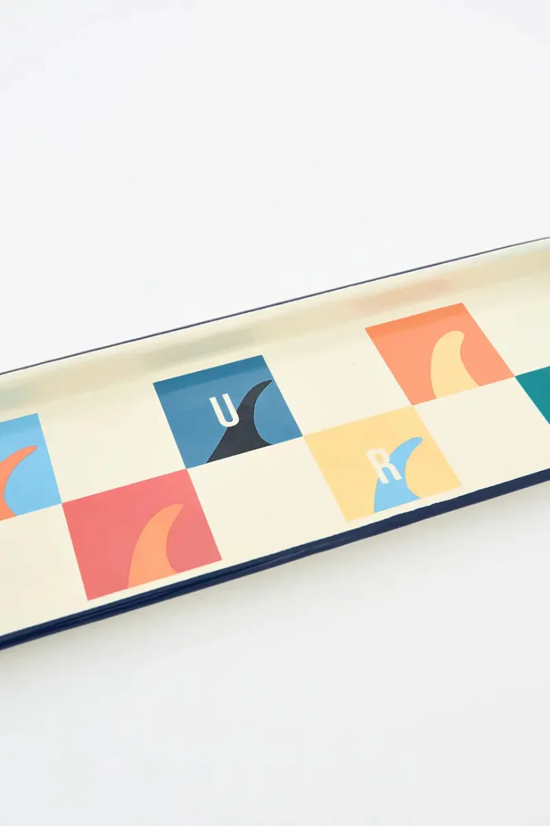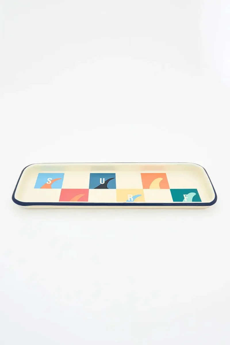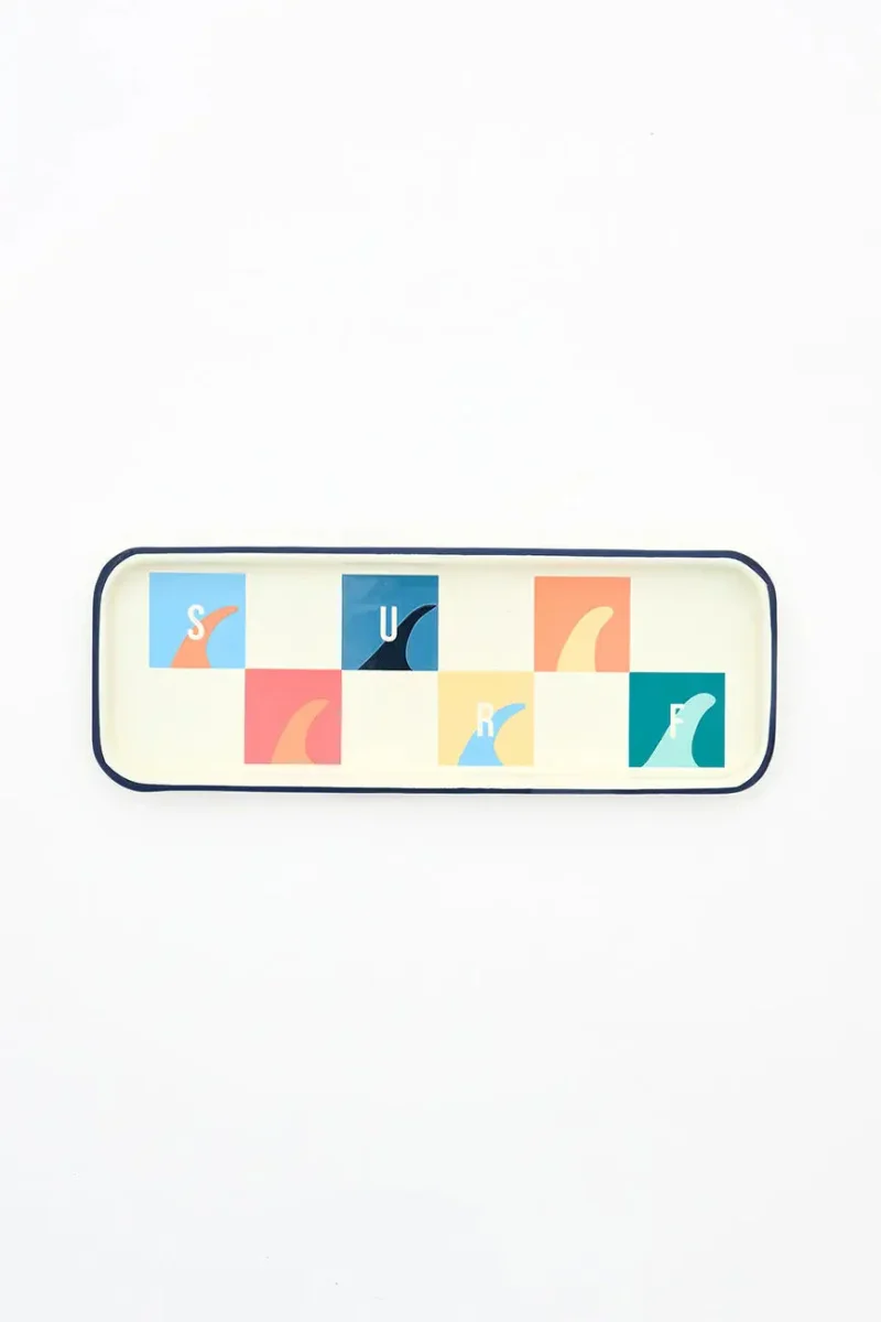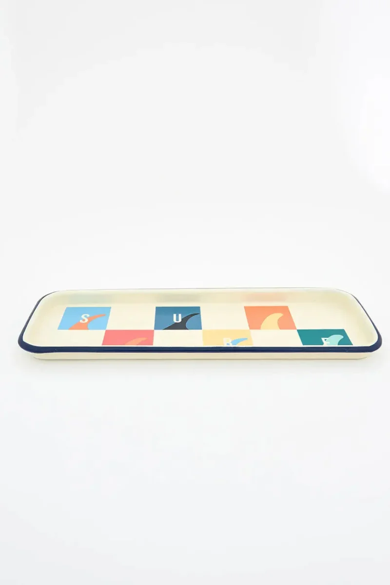 Bandeja de metal esmaltado con motivos de surf, ideal para añadir un toque original y funcional a tu hogar. Su diseño inspirado en el estilo marinero y la cultura del surf la convierte en un accesorio perfecto para mesas, cocinas o espacios con decoración costera