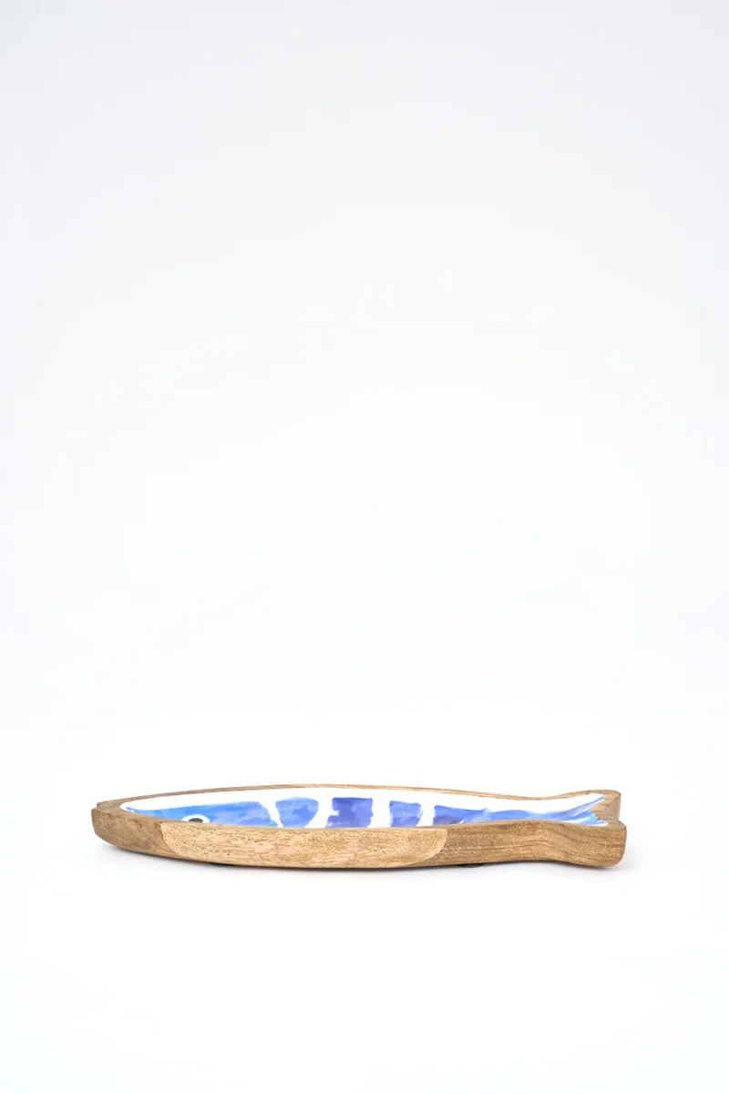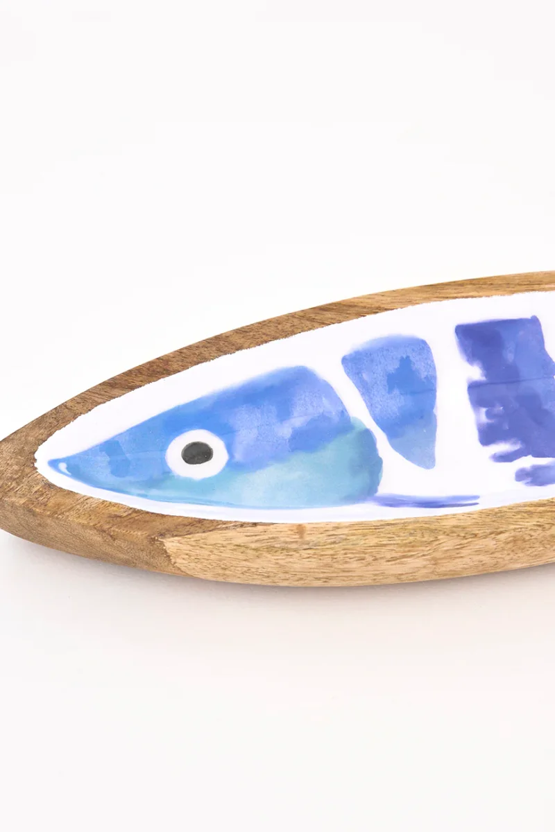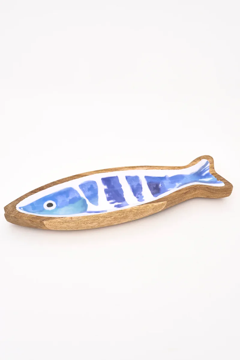 Bandeja de madera esmaltada con forma de pez y un pez pintado en el cuenco. Su diseño combina con los bols de banco de peces de la misma colección. Una pieza funcional y decorativa con inspiración marinera.