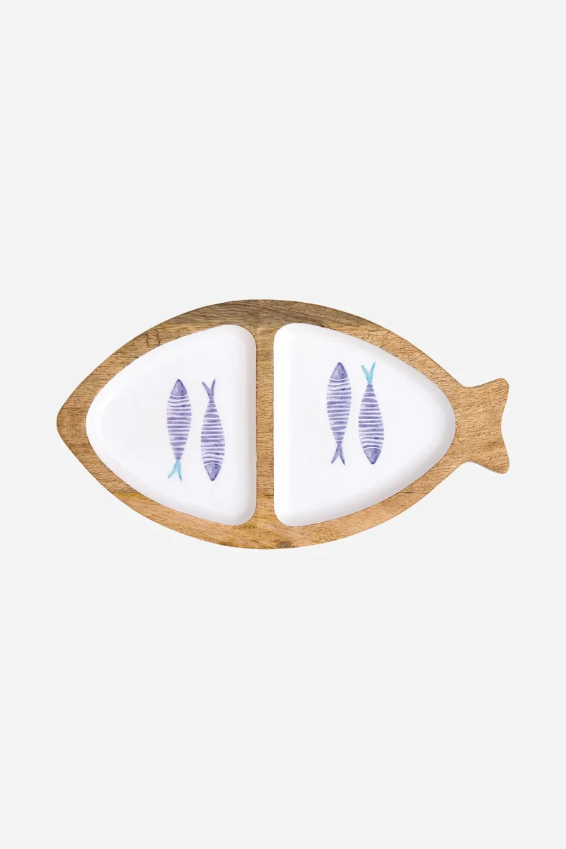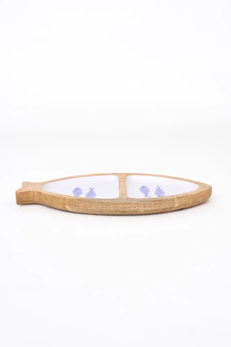 Bandeja decorativa de madera esmaltada (compox) con silueta de pez, ideal para servir o como pieza decorativa en la mesa. Su acabado esmaltado y diseño marinero aportan un toque fresco y luminoso al espacio.