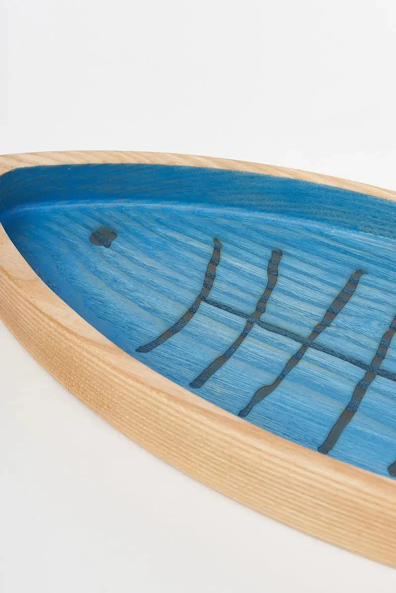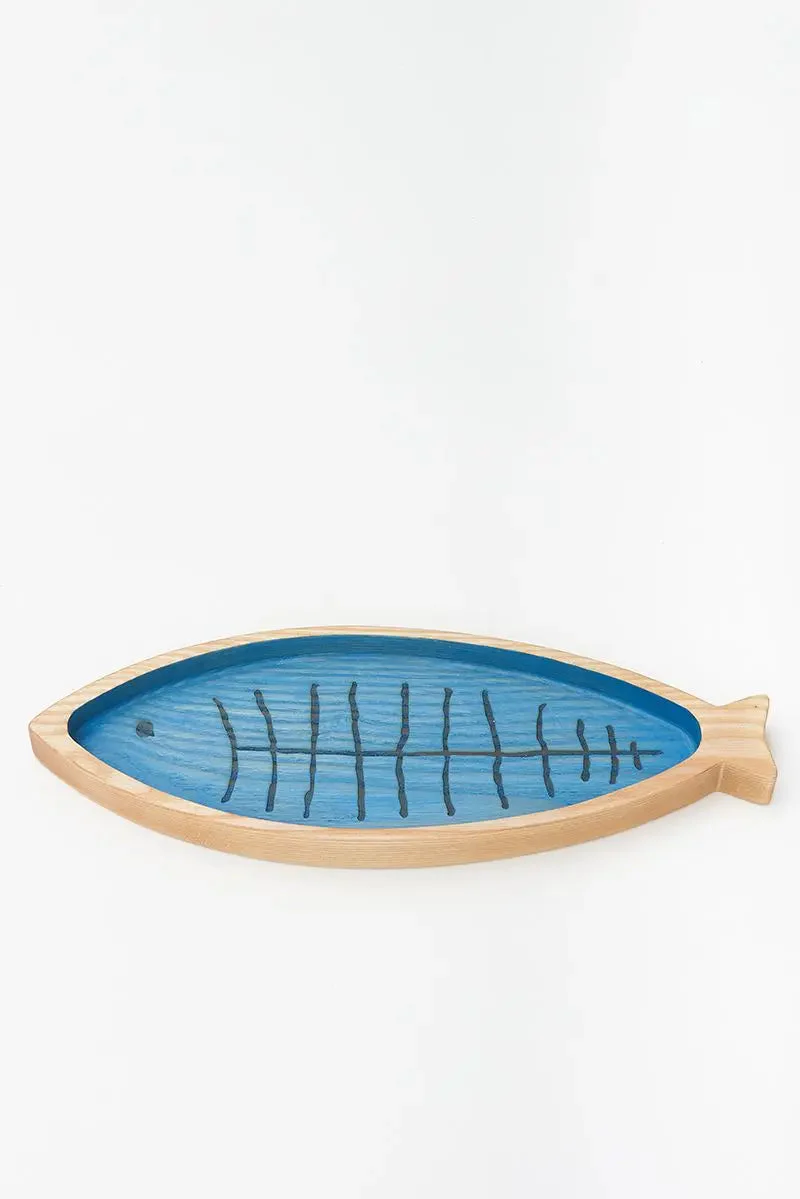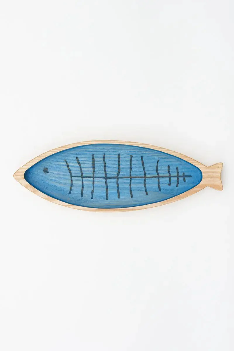 Bandeja de madera con forma de pez y con las espinas grabadas en su interior. El exterior es de madera natural y el interior está pintado en azul.