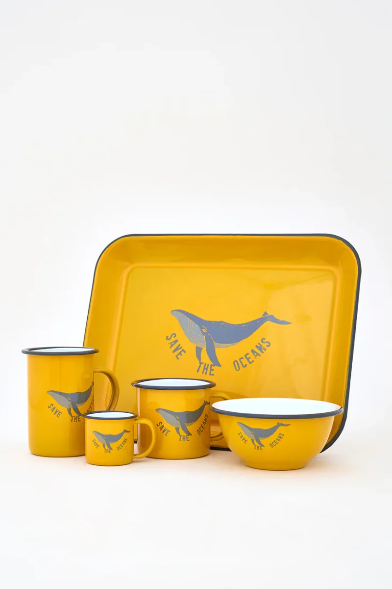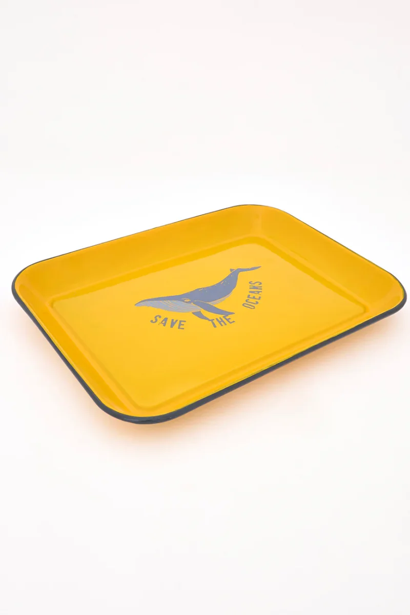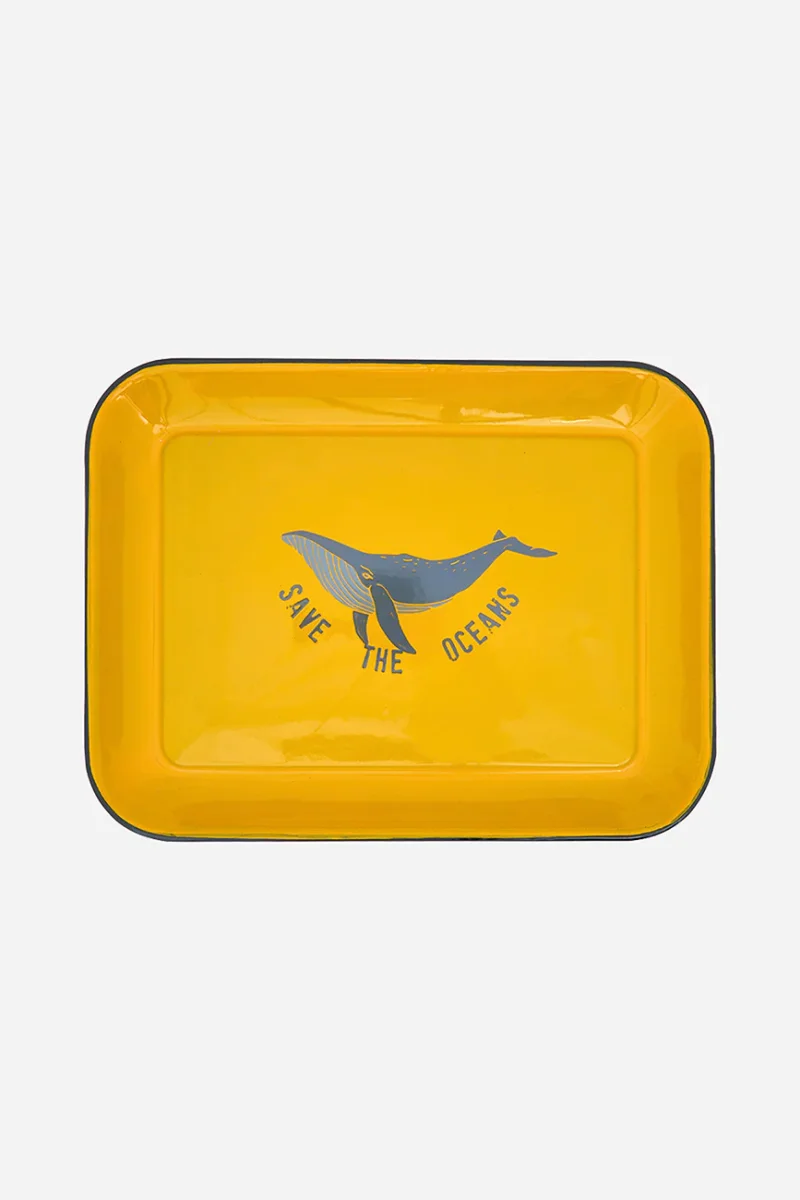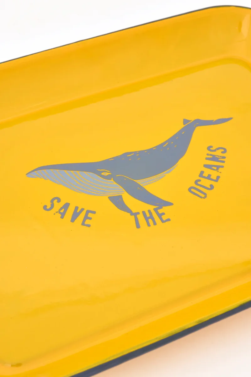 Bandeja de metal con acabado esmaltado. Decorada con una ballena serigrafiada y el texto “Save the oceans”. Un diseño decorativo que aporta carácter y conciencia marina.
