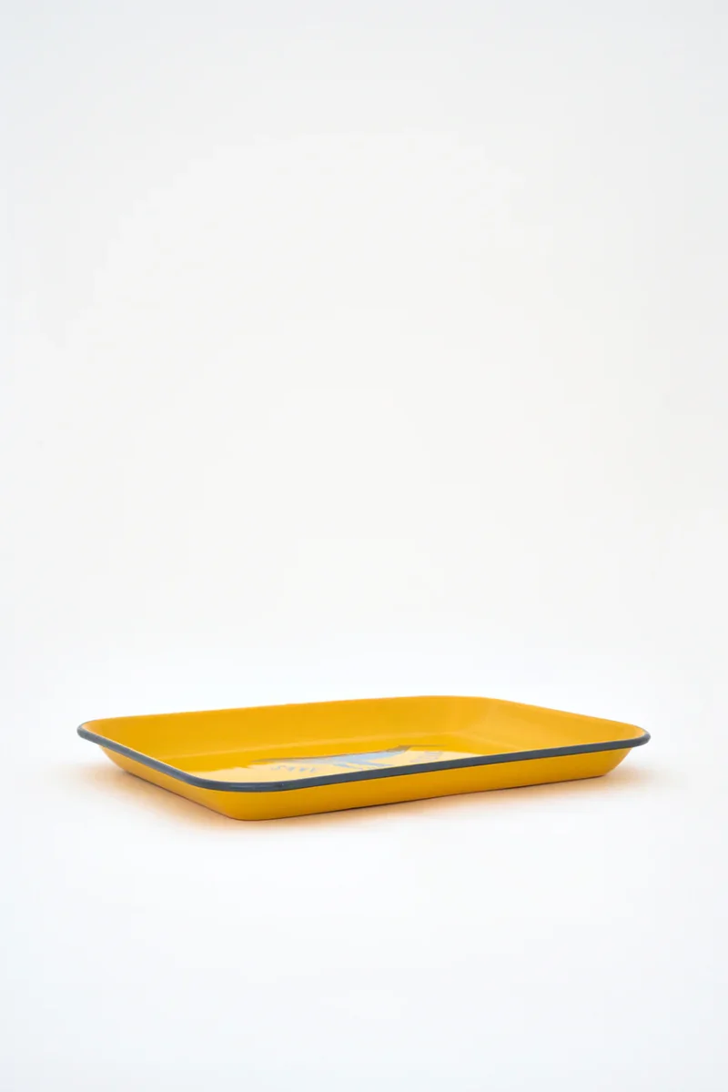 Bandeja de metal con acabado esmaltado.