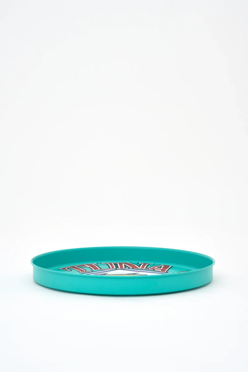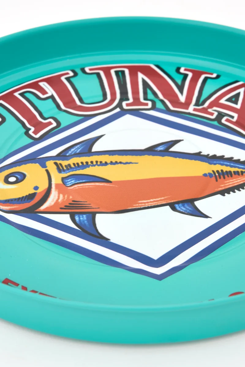 Bandeja redonda elaborada en metal y pintada en colores llamativos. Decorada con un diseño de atún como motivo central. Una pieza funcional y decorativa con carácter marino.