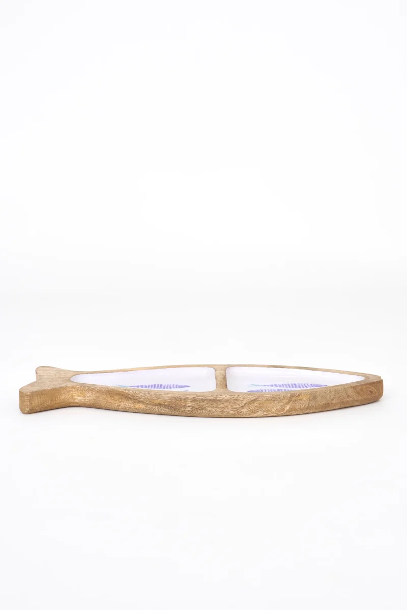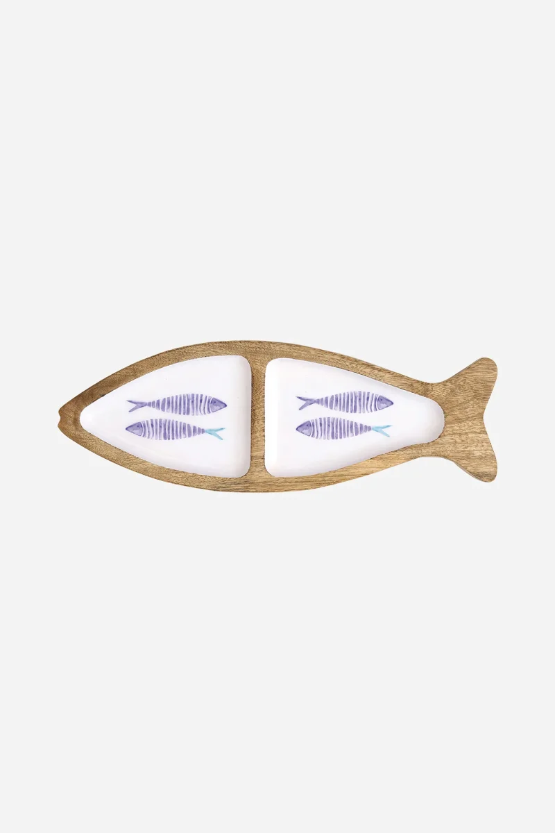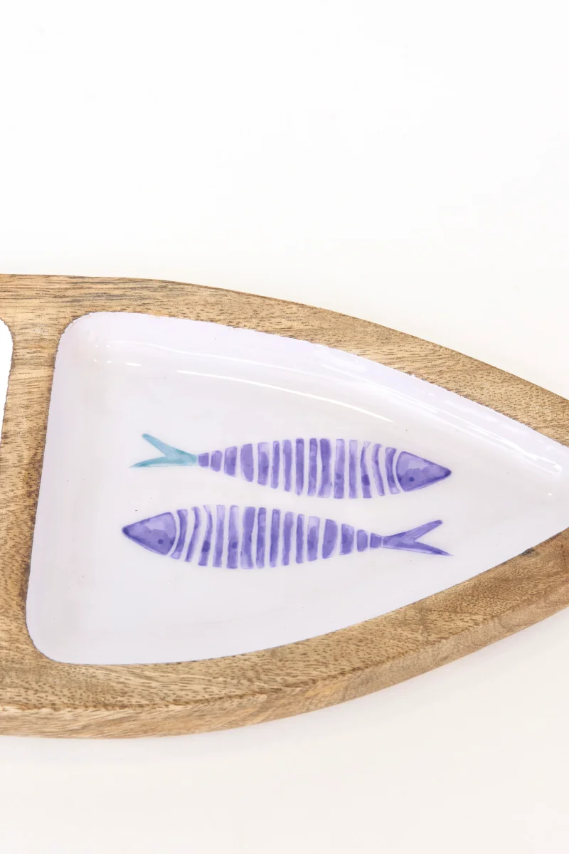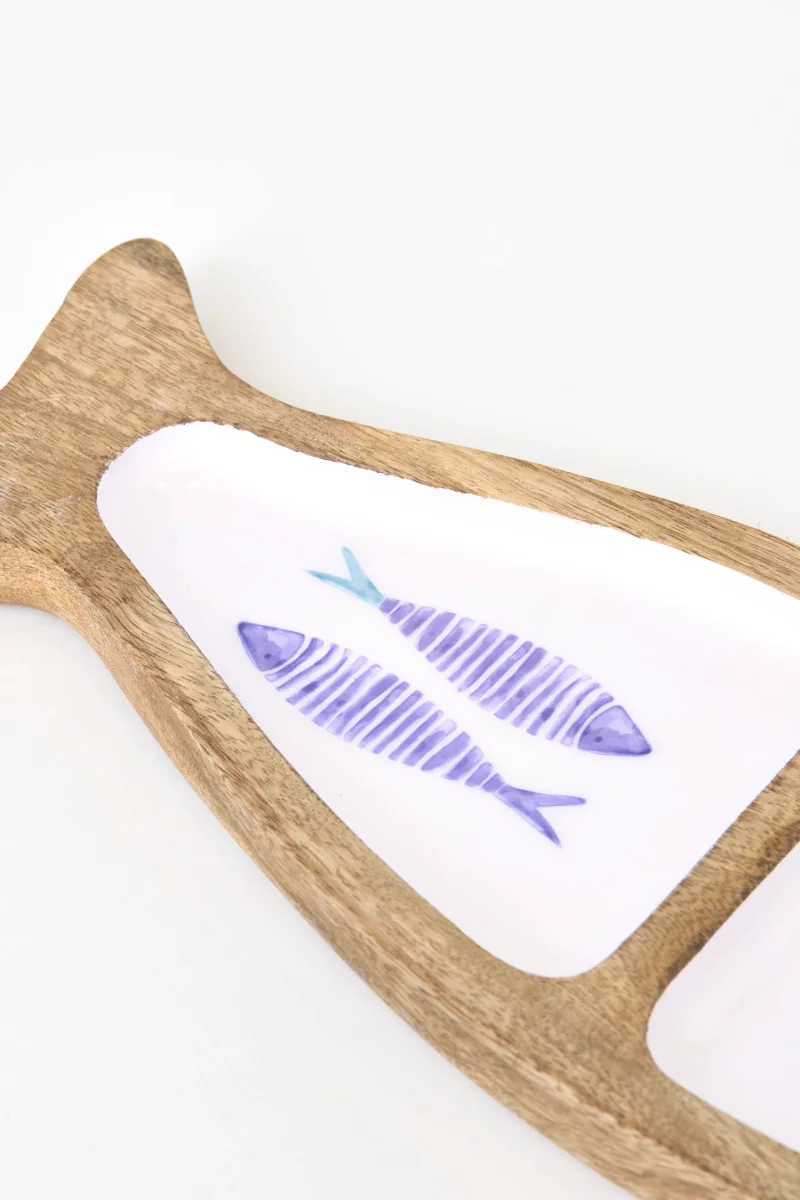 Bandeja decorativa con forma de pez y tres secciones, con ilustraciones de peces en tonos azules y borde efecto madera esmaltada. Ideal para aperitivos o como pieza decorativa de inspiración náutica