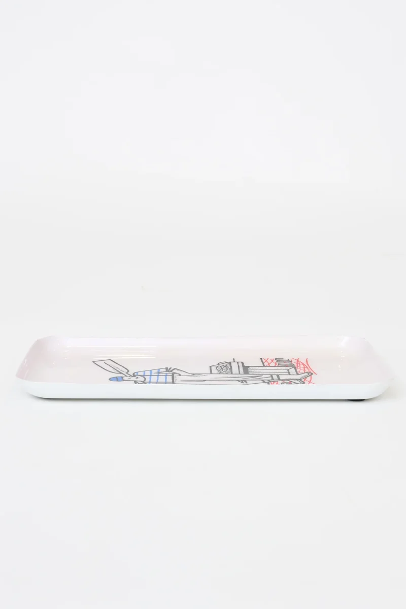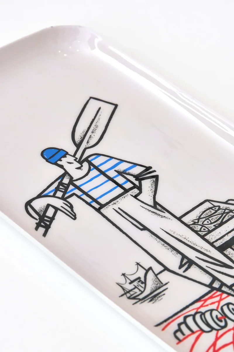 Bandeja decorativa de metal con ilustración de pescador o marinero y estilo gráfico original. Su diseño aporta un punto desenfadado y creativo, ideal como pieza ornamental o para organizar pequeños objetos.