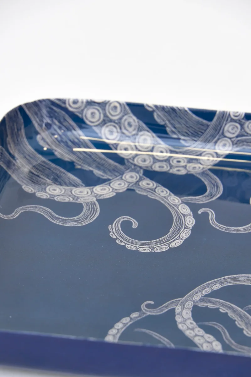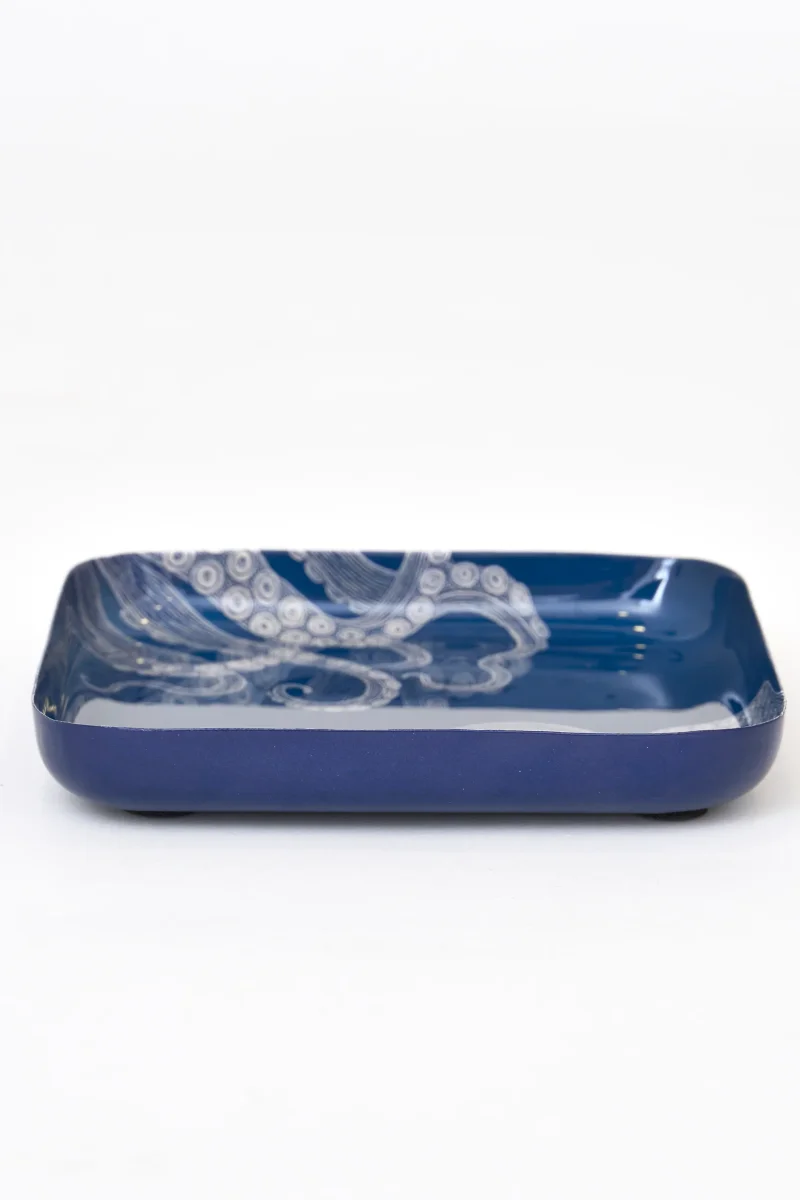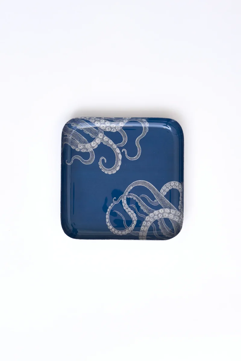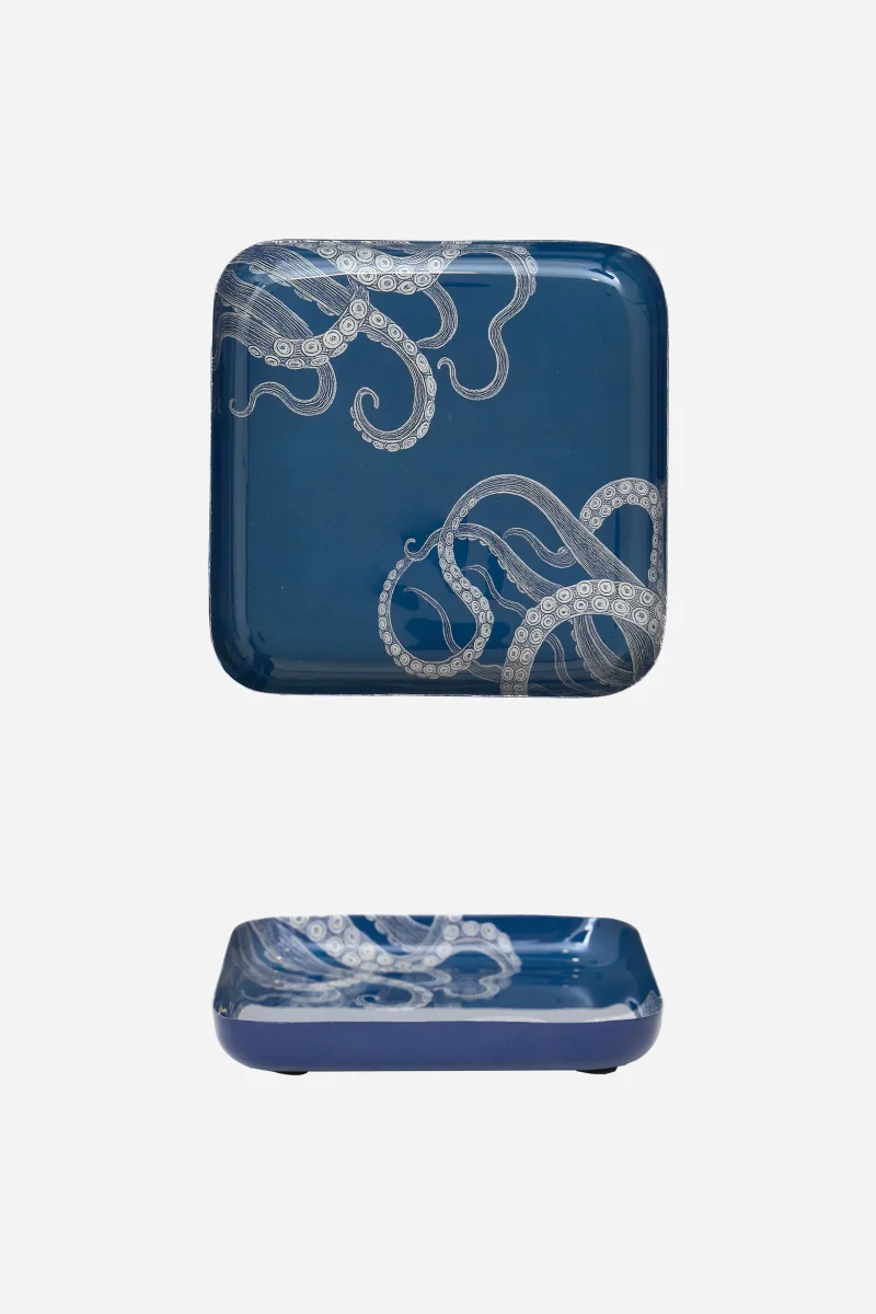 Bandeja decorativa de metal con ilustración de pulpo sobre fondo azul profundo. Su formato cuadrado y composición equilibrada la convierten en una pieza versátil, ideal como elemento ornamental o para organizar pequeños objetos.