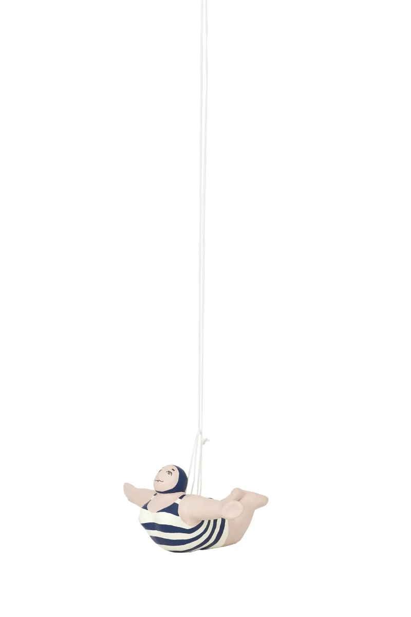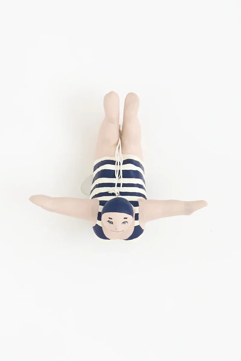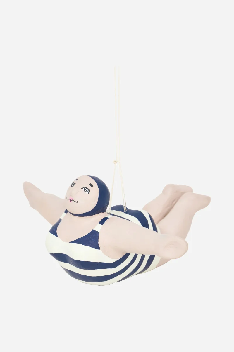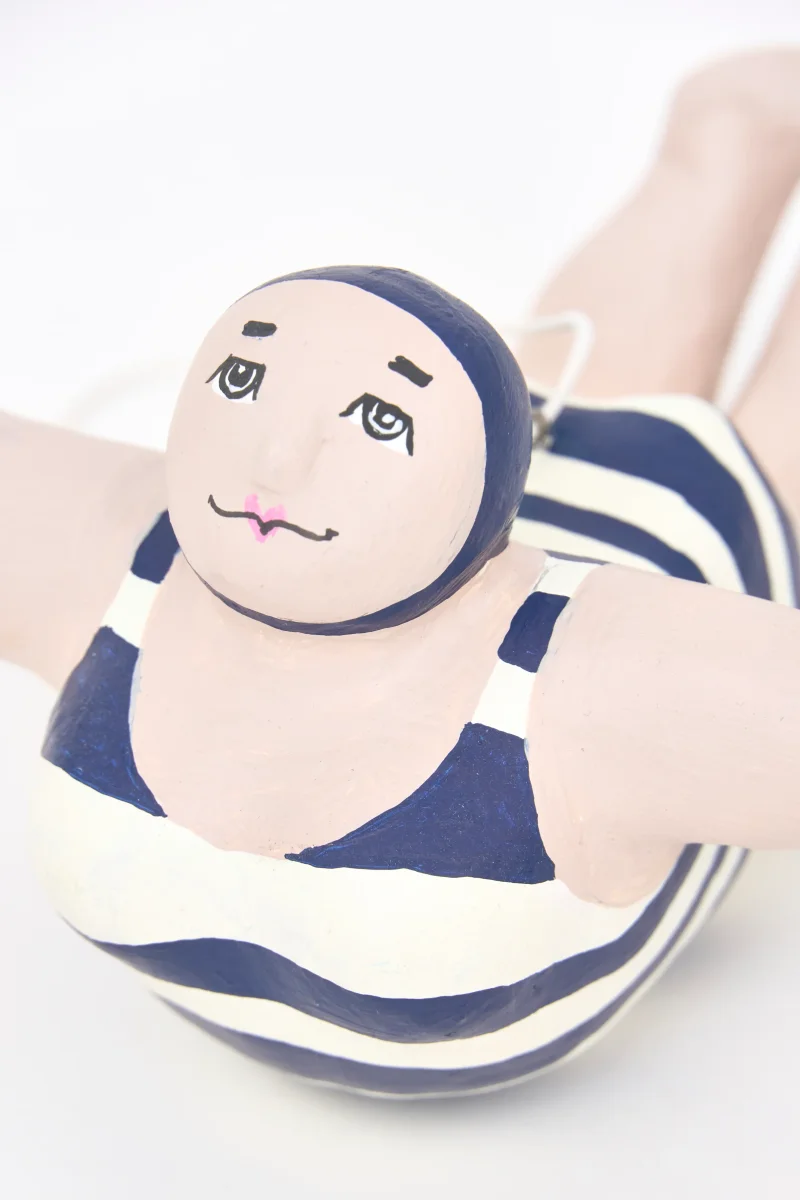 Simpática bañista decorativa elaborada en papel maché. Luce un bañador de estrellas de mar de estilo vintage. Pieza de gran tamaño diseñada para colgar como elemento decorativo.