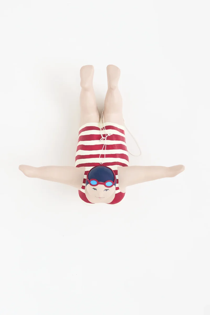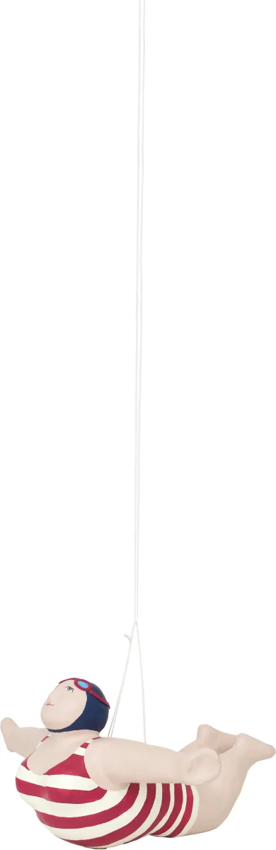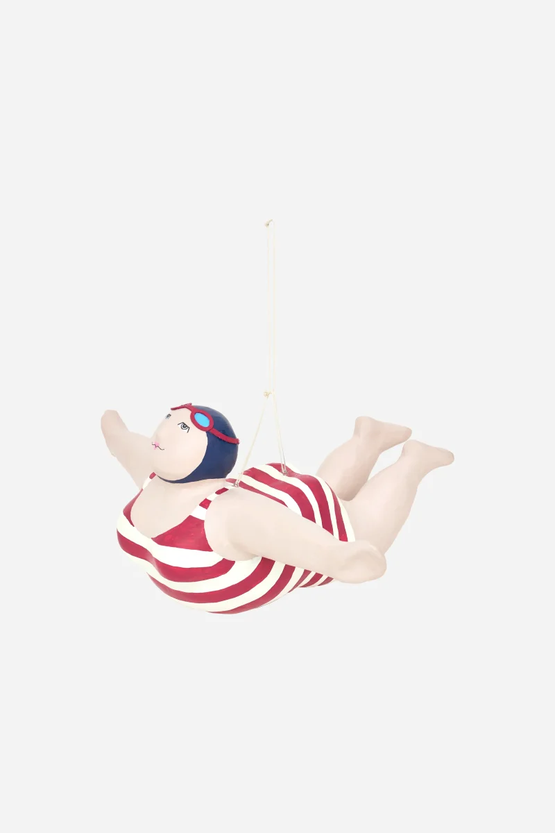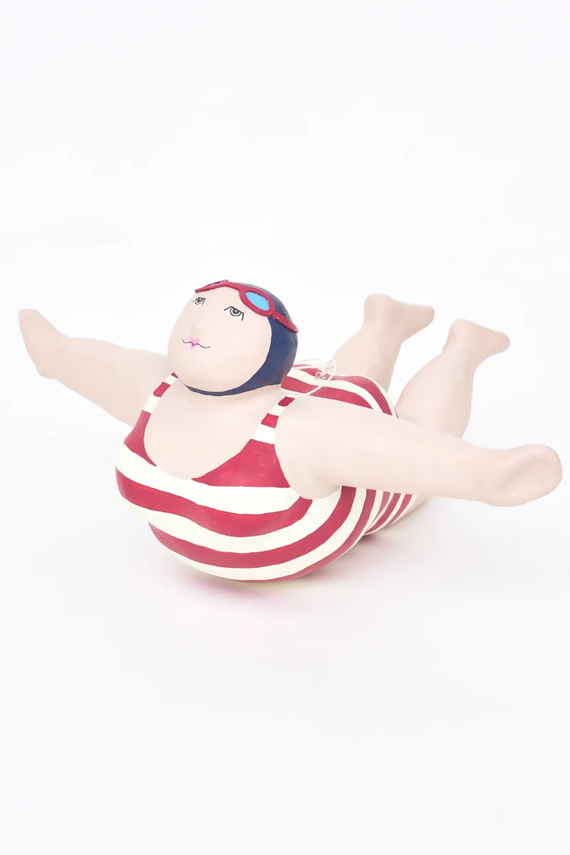 Simpática bañista decorativa elaborada en papel maché. Luce un bañador a rayas azules y rojas de estilo vintage. Pieza de gran tamaño diseñada para colgar como elemento decorativo.