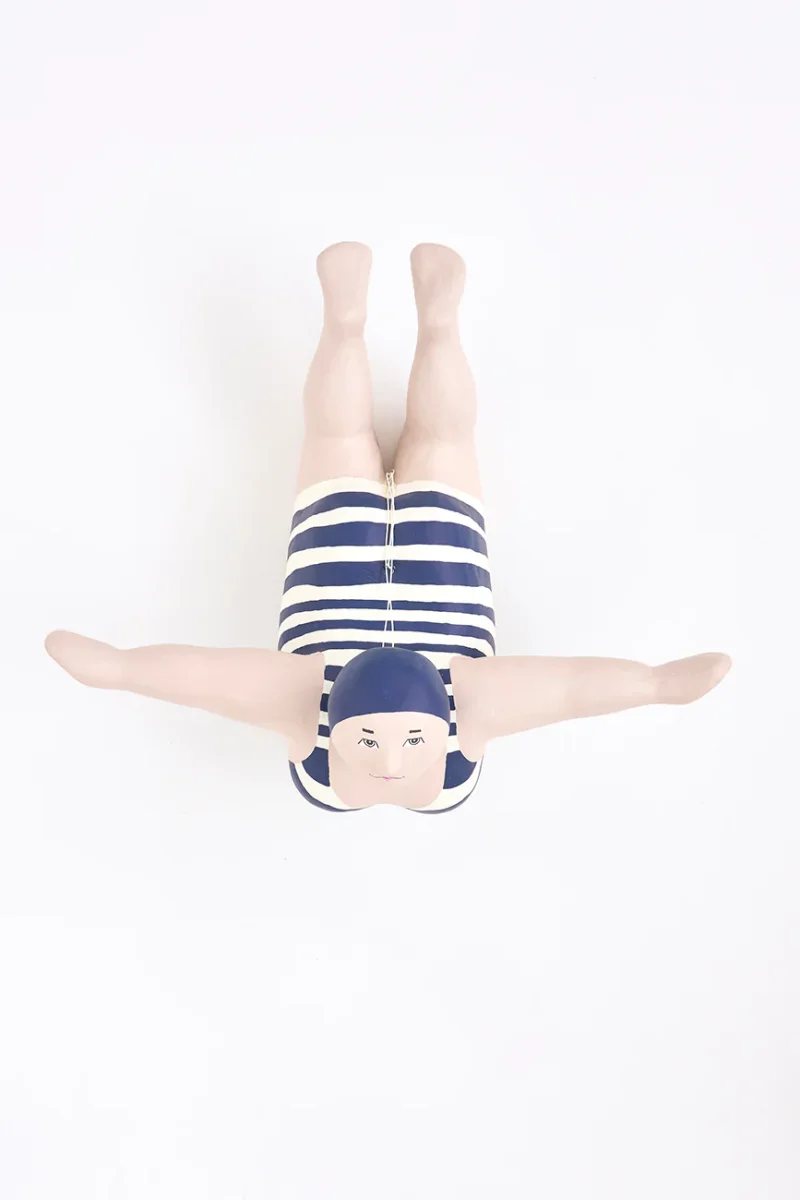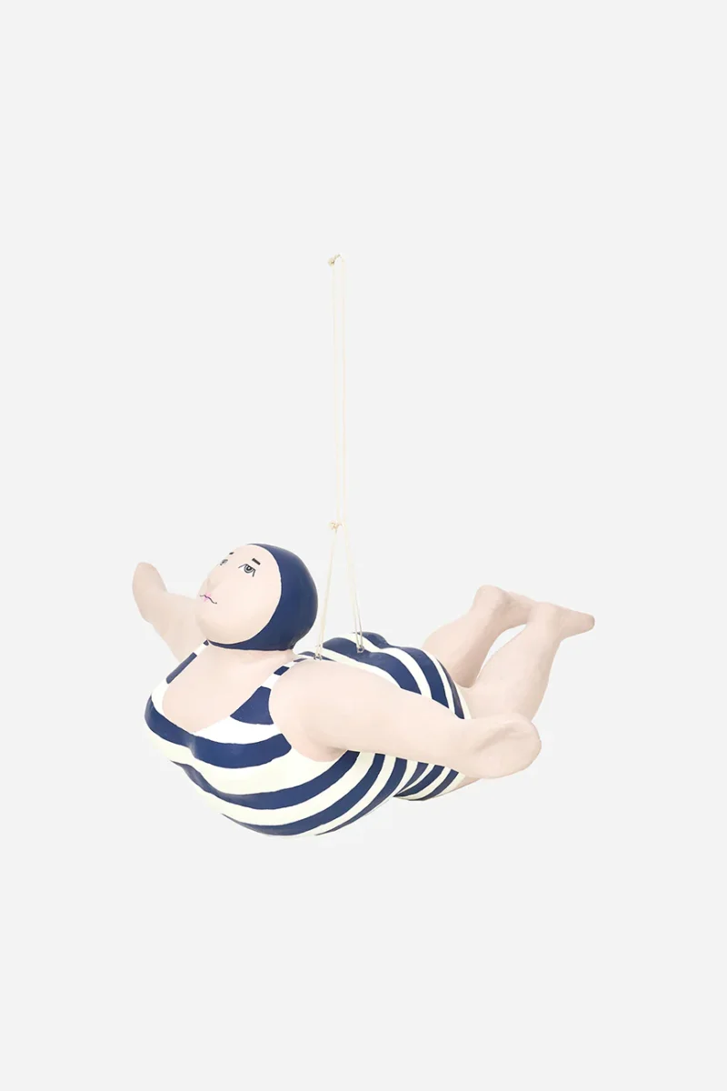 Simpática bañista decorativa elaborada en papel maché. Luce un bañador a rayas azules y blancas de estilo vintage. Pieza de gran tamaño diseñada para colgar como elemento decorativo.