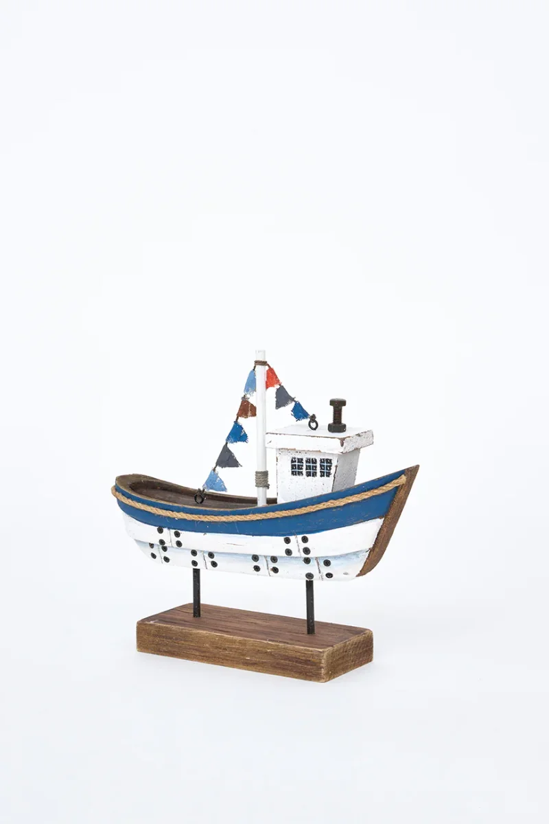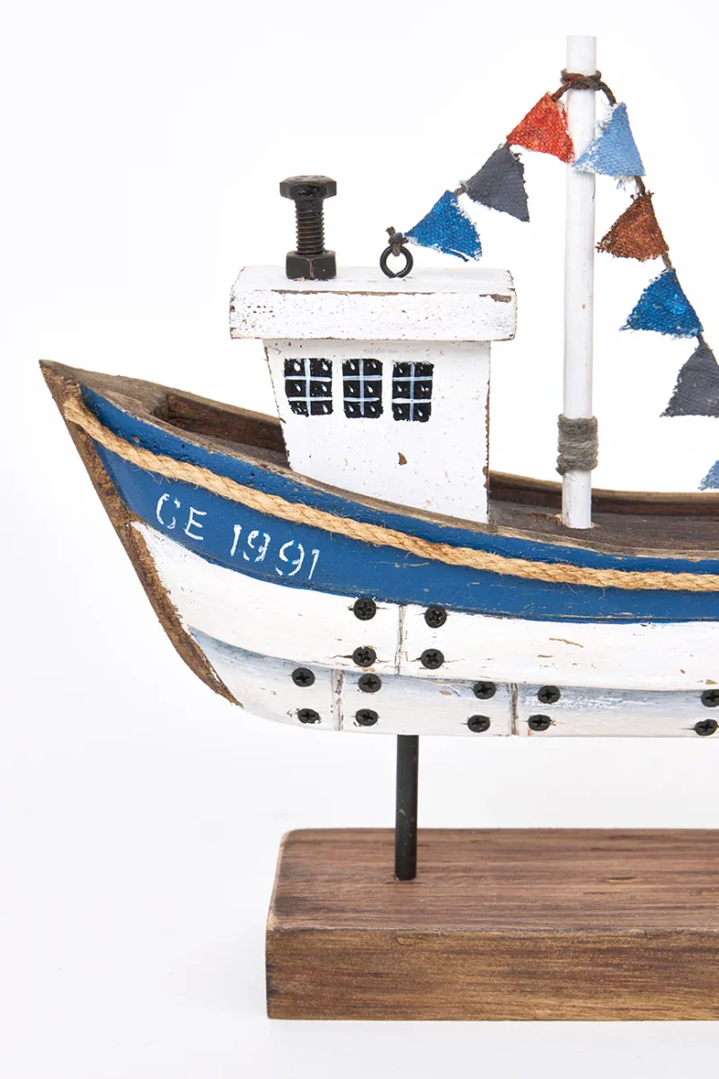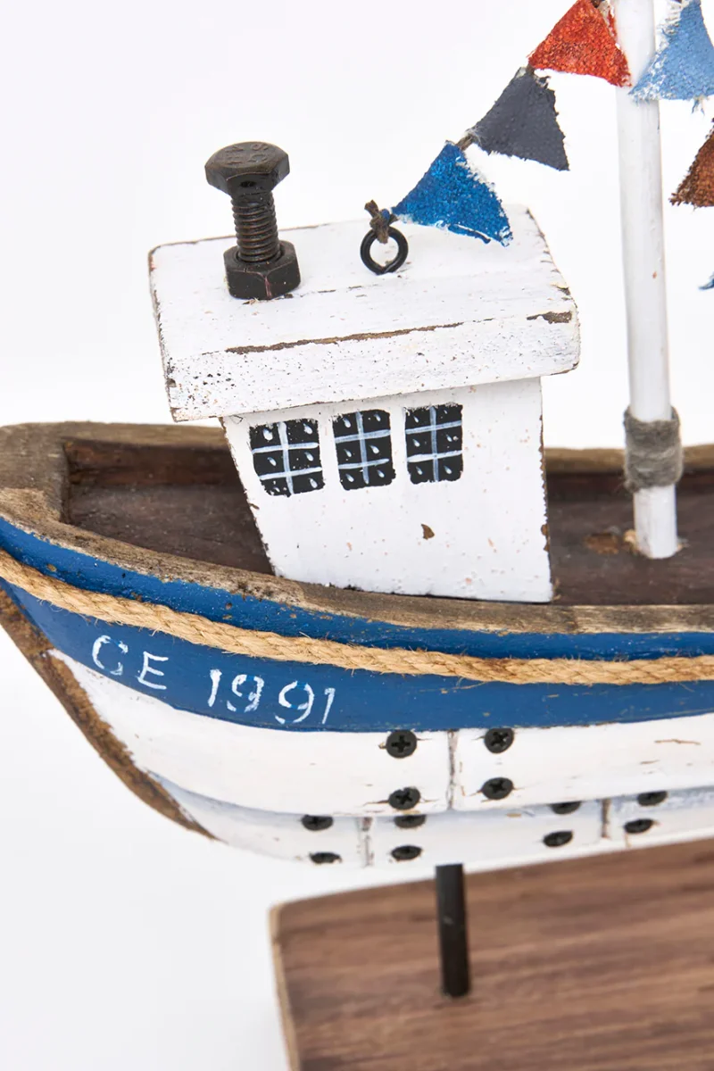 Barco decorativo de madera con base, pintado en color blanco y azul con acabado envejecido. Ideal para colocar sobre mesas o estanterías. Un complemento decorativo con aire marinero y artesanal.