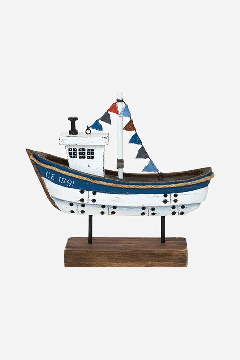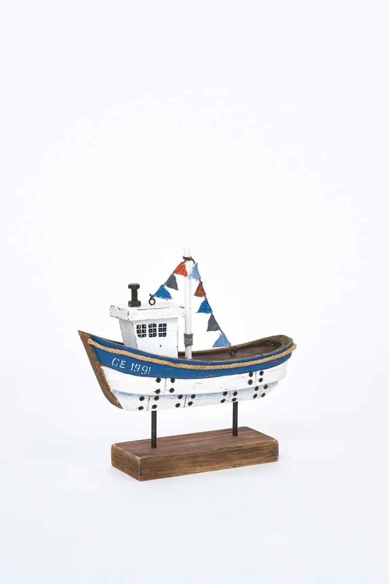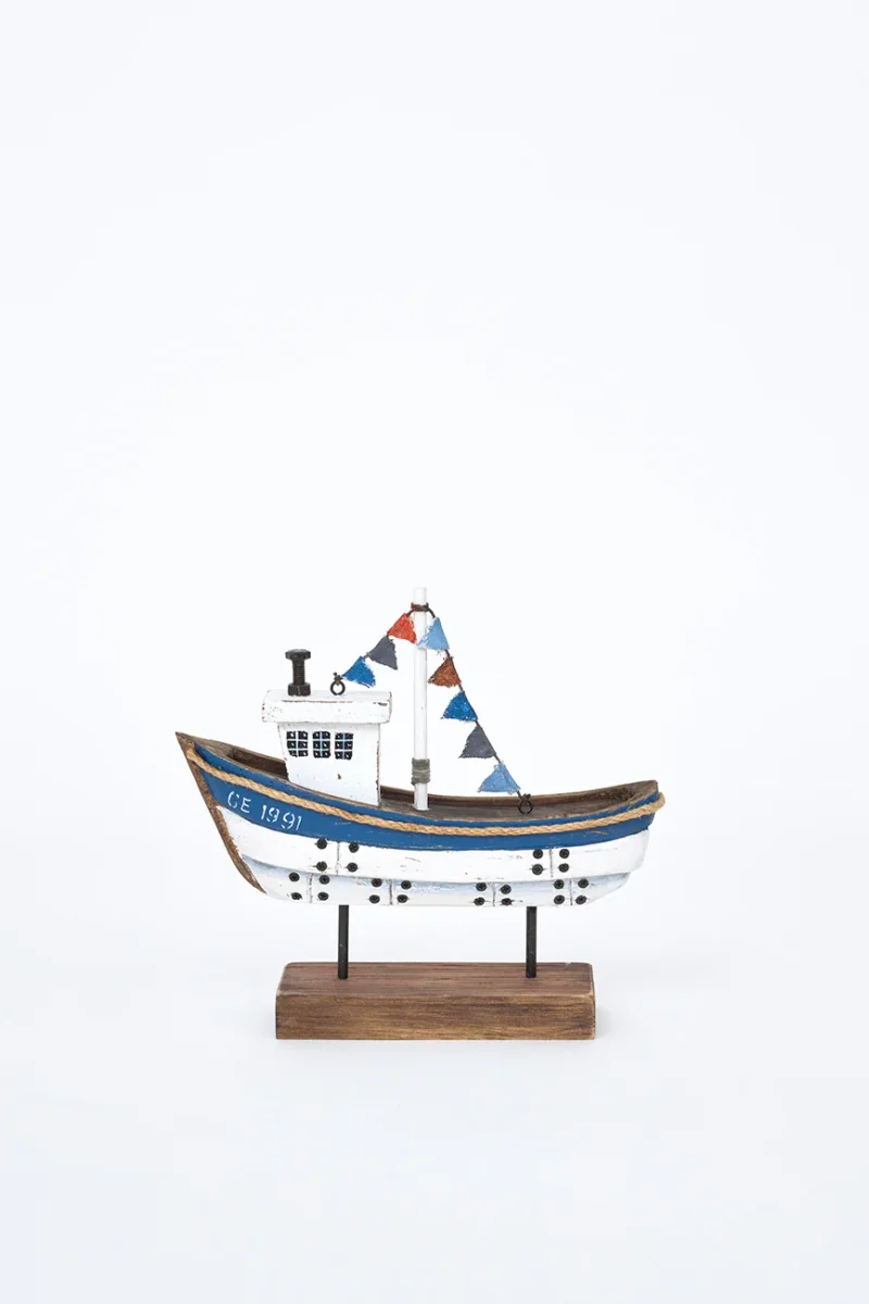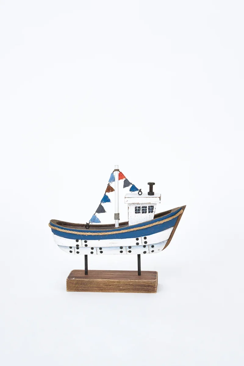 Barco decorativo de madera con base, pintado en color blanco y azul con acabado envejecido. Ideal para colocar sobre mesas o estanterías. Un complemento decorativo con aire marinero y artesanal.