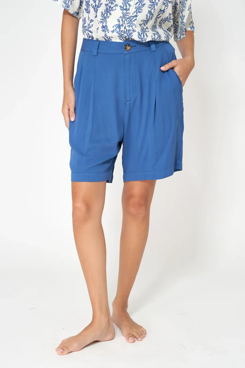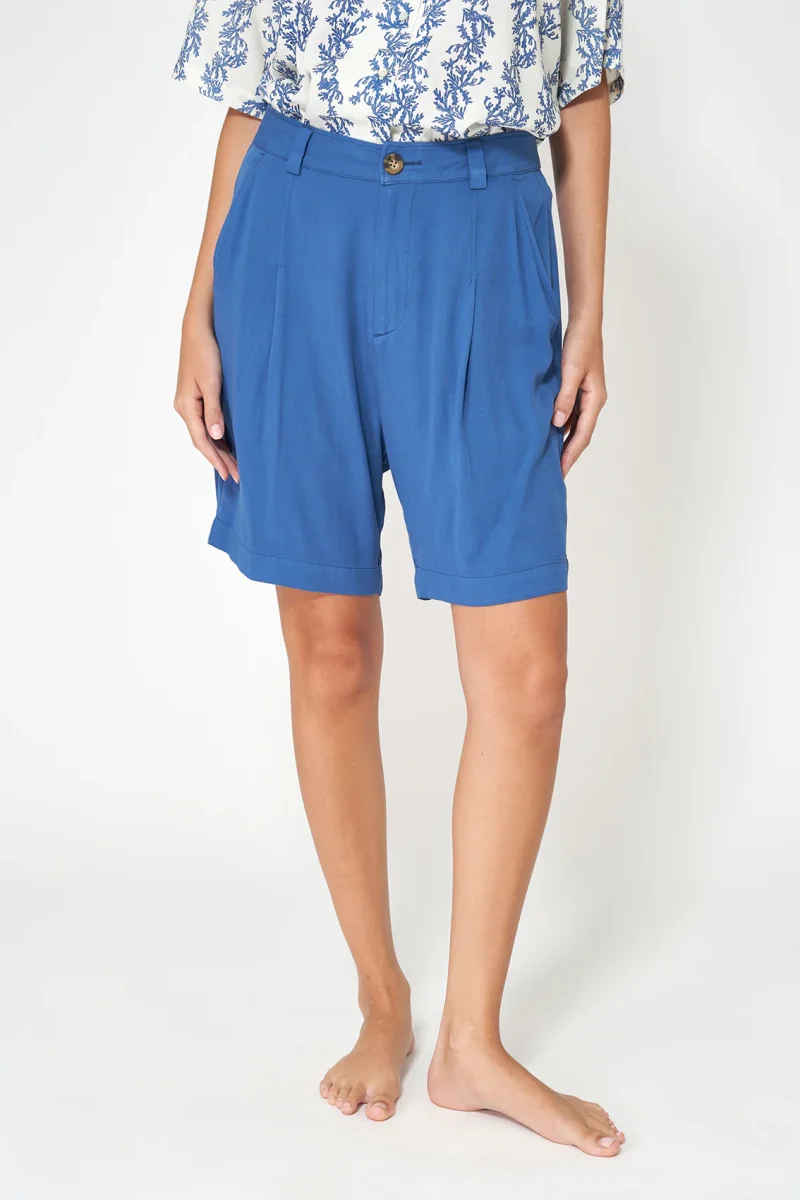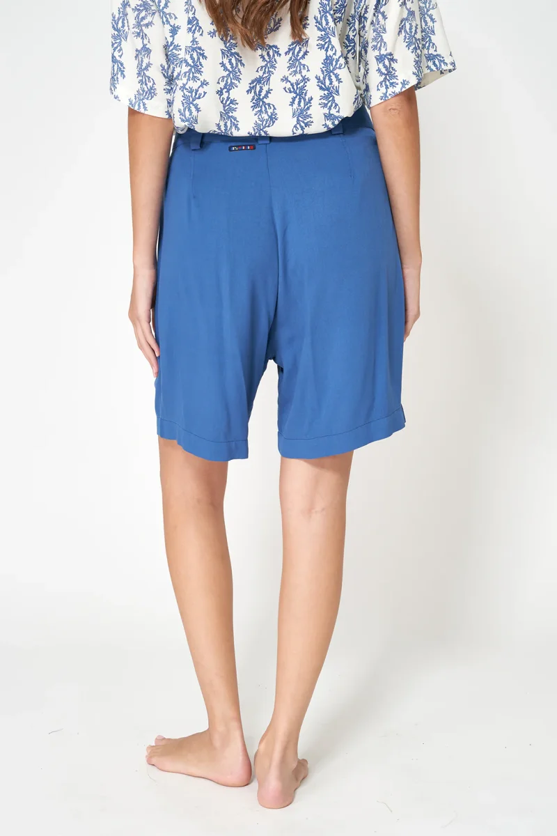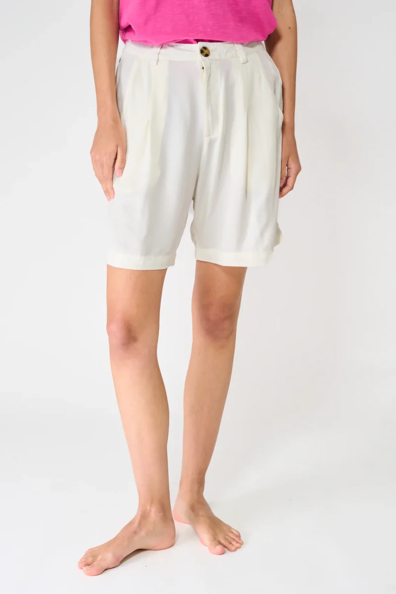 Bermuda confeccionada en sarga de viscosa Ecovero, un tejido que aporta una caída fluida, tacto suave y un acabado más pulido, resistente y con estilo.