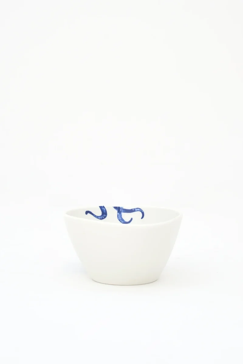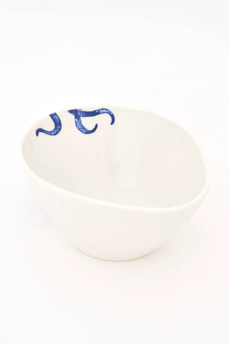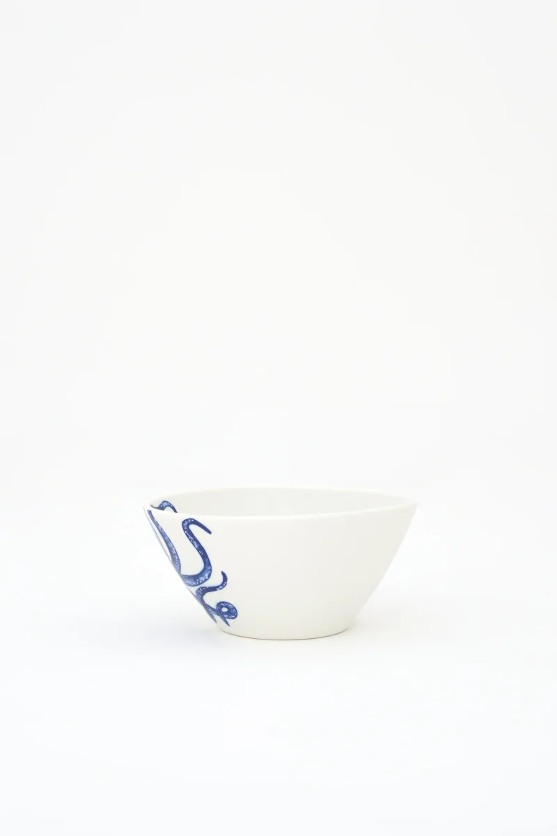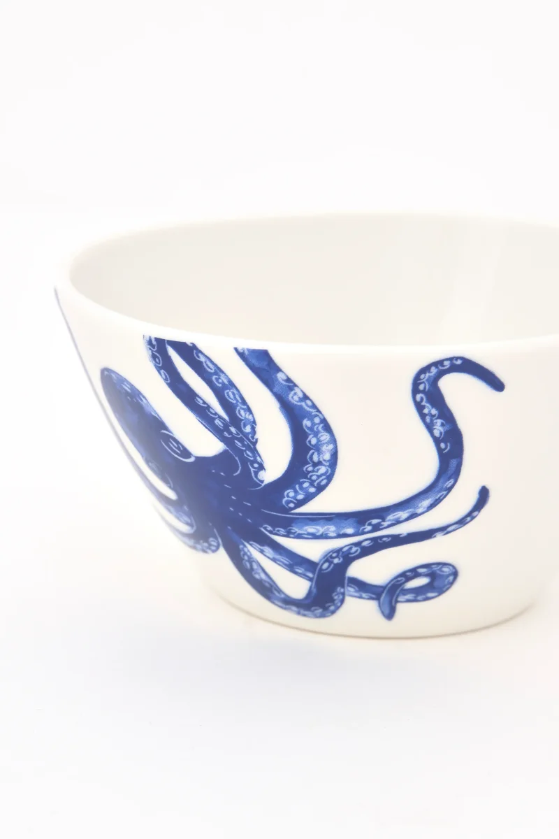 Bol decorado con un pulpo pintado en color azul en uno de sus laterales. El diseño aporta un toque distintivo y marino. Una pieza funcional para la mesa del día a día.