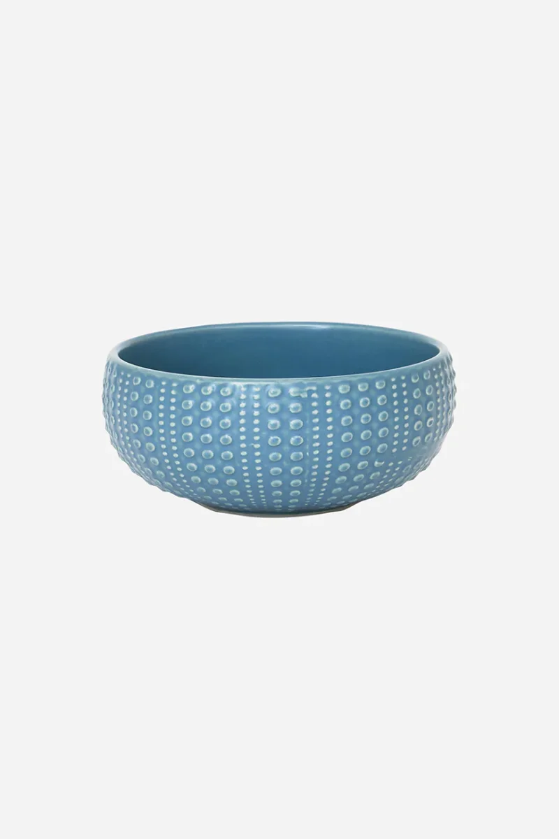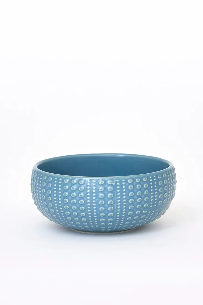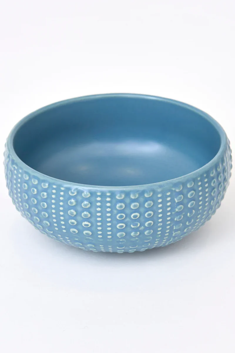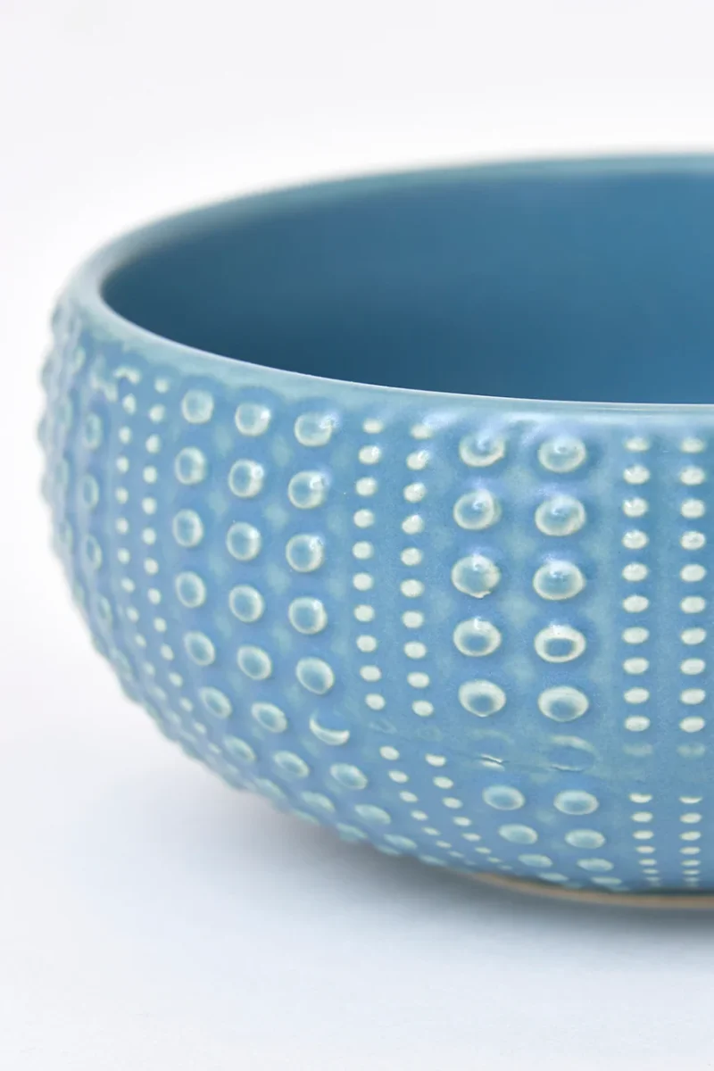 Bol de cerámica con textura exterior inspirada en la forma de un erizo de mar. Su acabado en relieve aporta un diseño original y decorativo. Una pieza funcional con sutil inspiración marina.