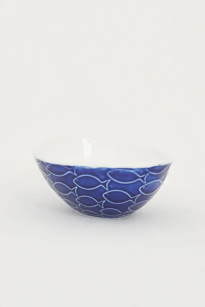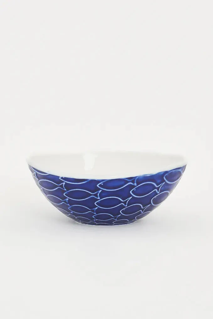 Bol de cerámica pequeño azul y blanco con peces en relieve: una pieza única