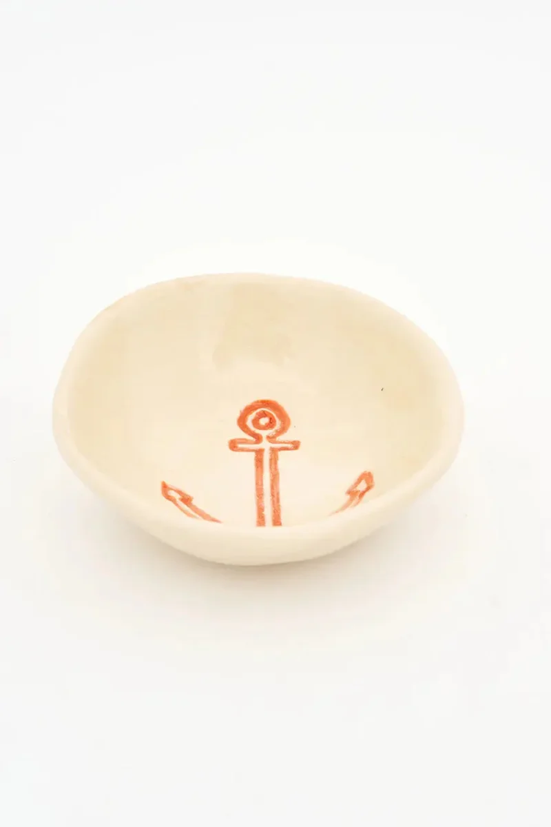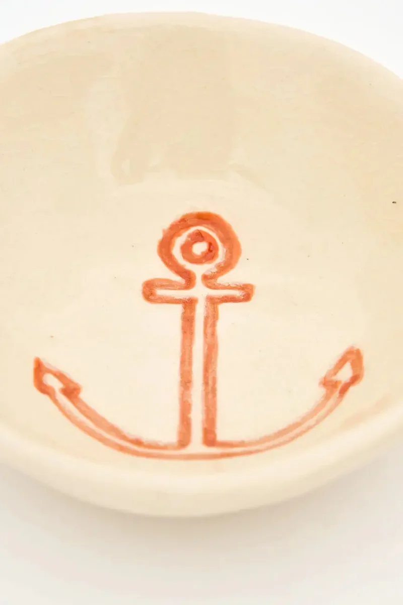 Bol de gres con detalle de un ancla en el cuenco. Precioso bol de gres con un ancla pintada con un acabado envejecido en el cuenco. Una forma discreta y bonita de aportar un toque marinero al hogar empezando desde la cocina.