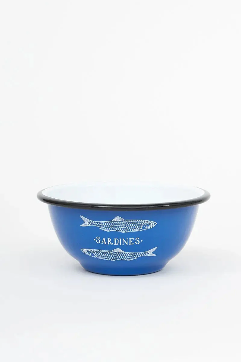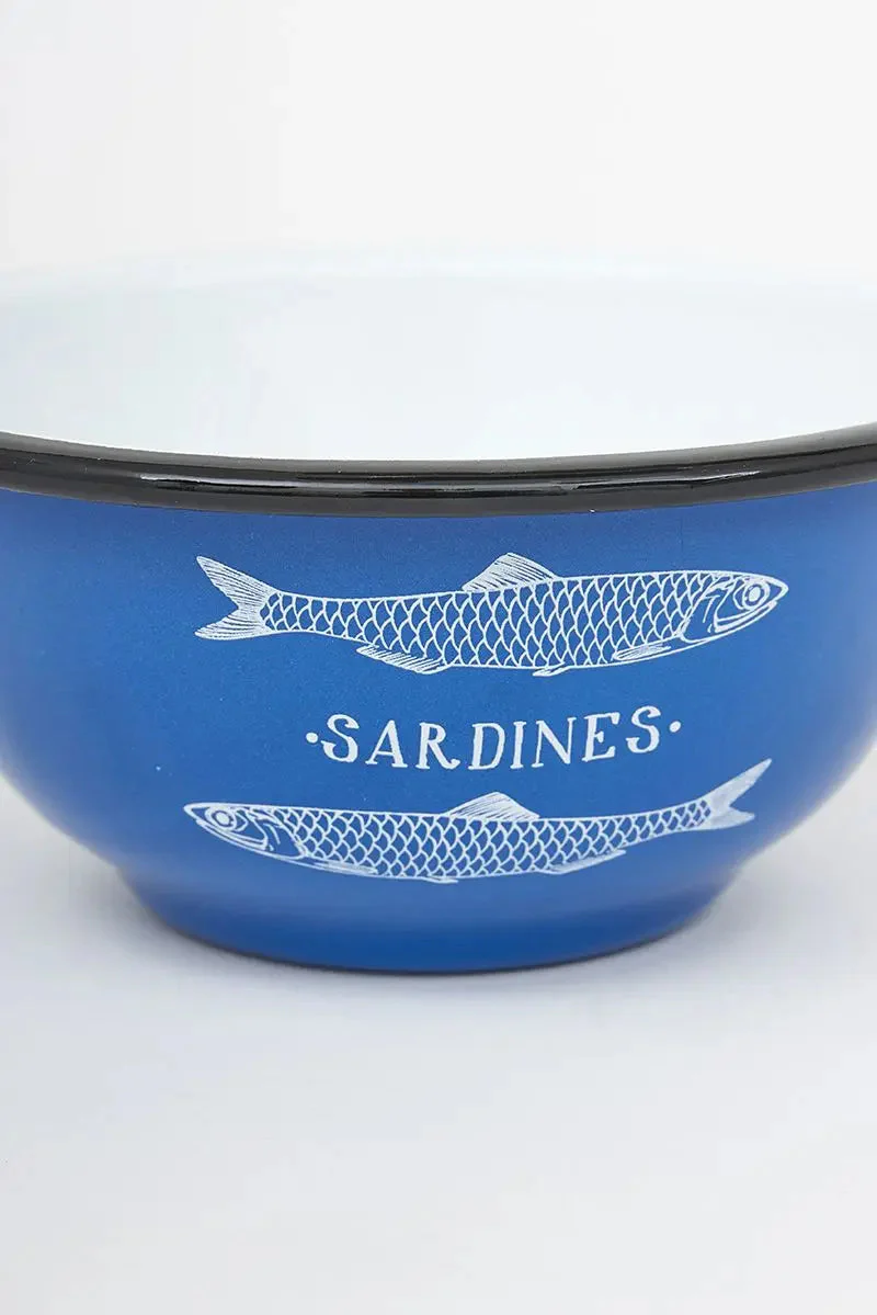 Bol de metal esmaltado en color azul. Lleva dos sardinas pintadas en color blanco con el texto ‘Sardines’. Tamaño pequeño, hay otro más grande.