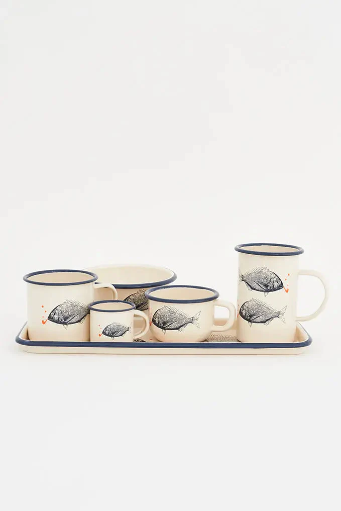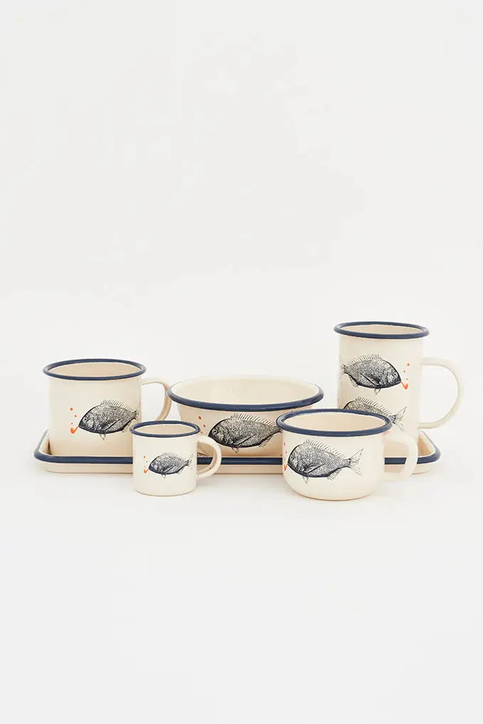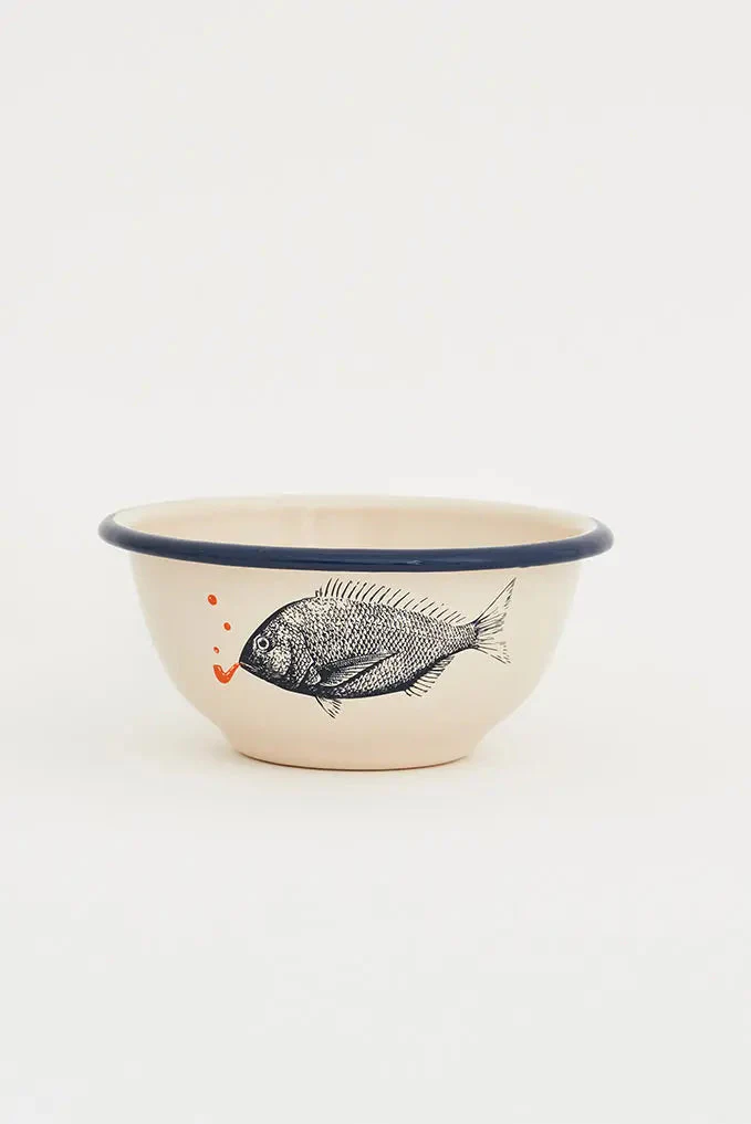 Añade un toque de sofisticación marina a tus comidas con nuestro bol en metal esmaltado, de color blanco con un elegante diseño de pez en negro. Este bol no solo es perfecto para servir tus platos favoritos, sino que también aporta un contraste decorativo único a tu mesa.