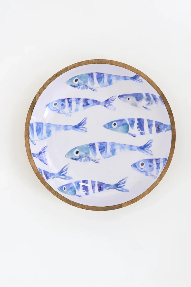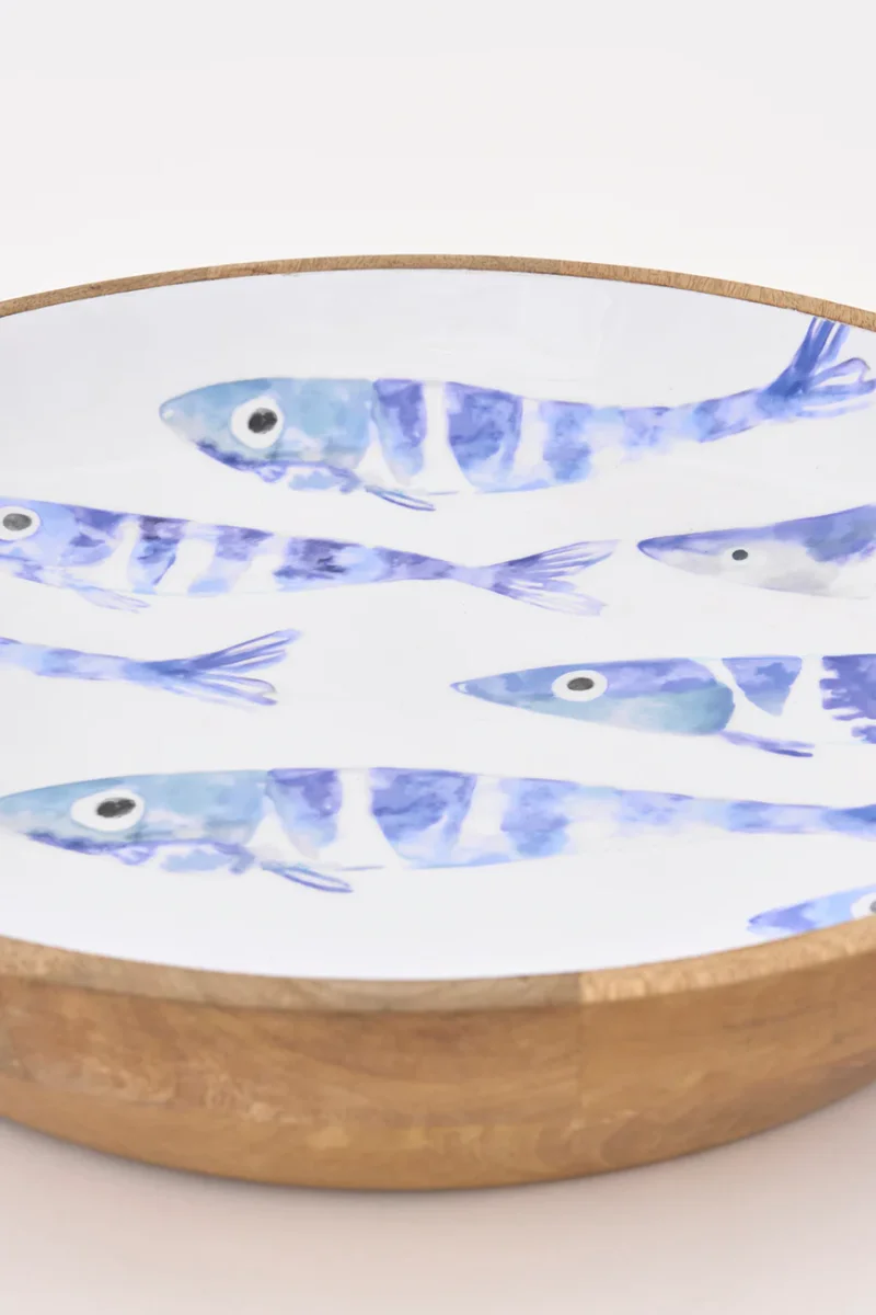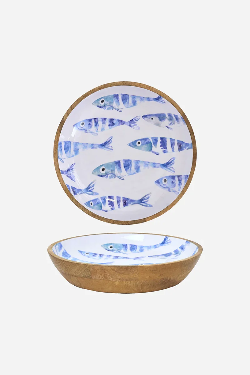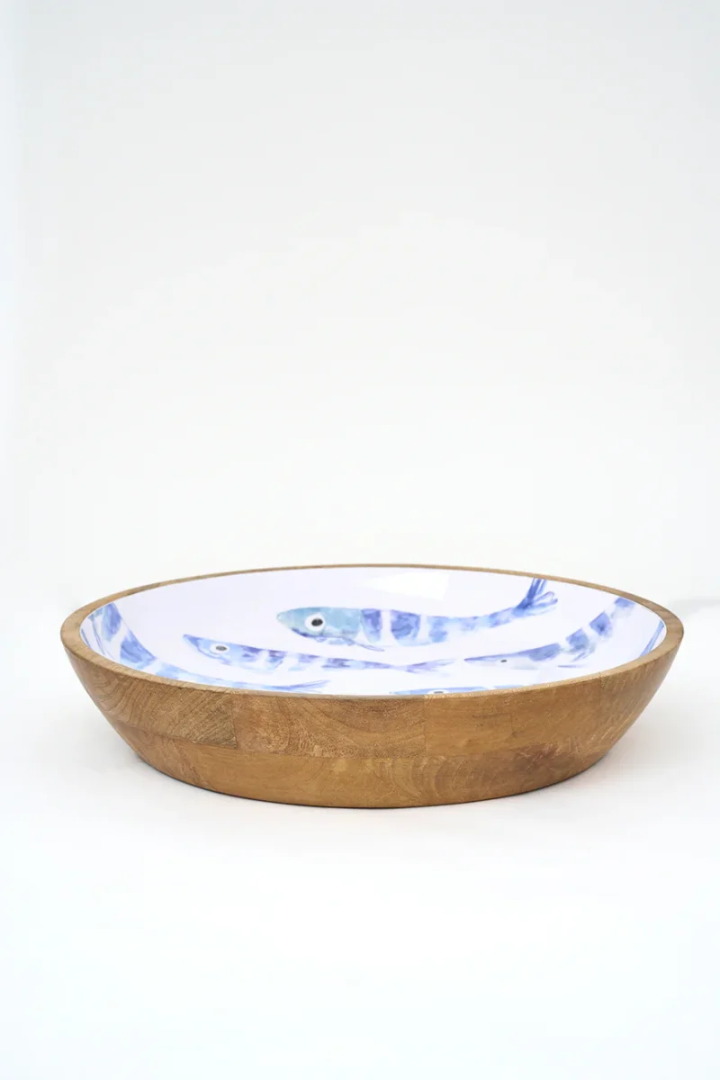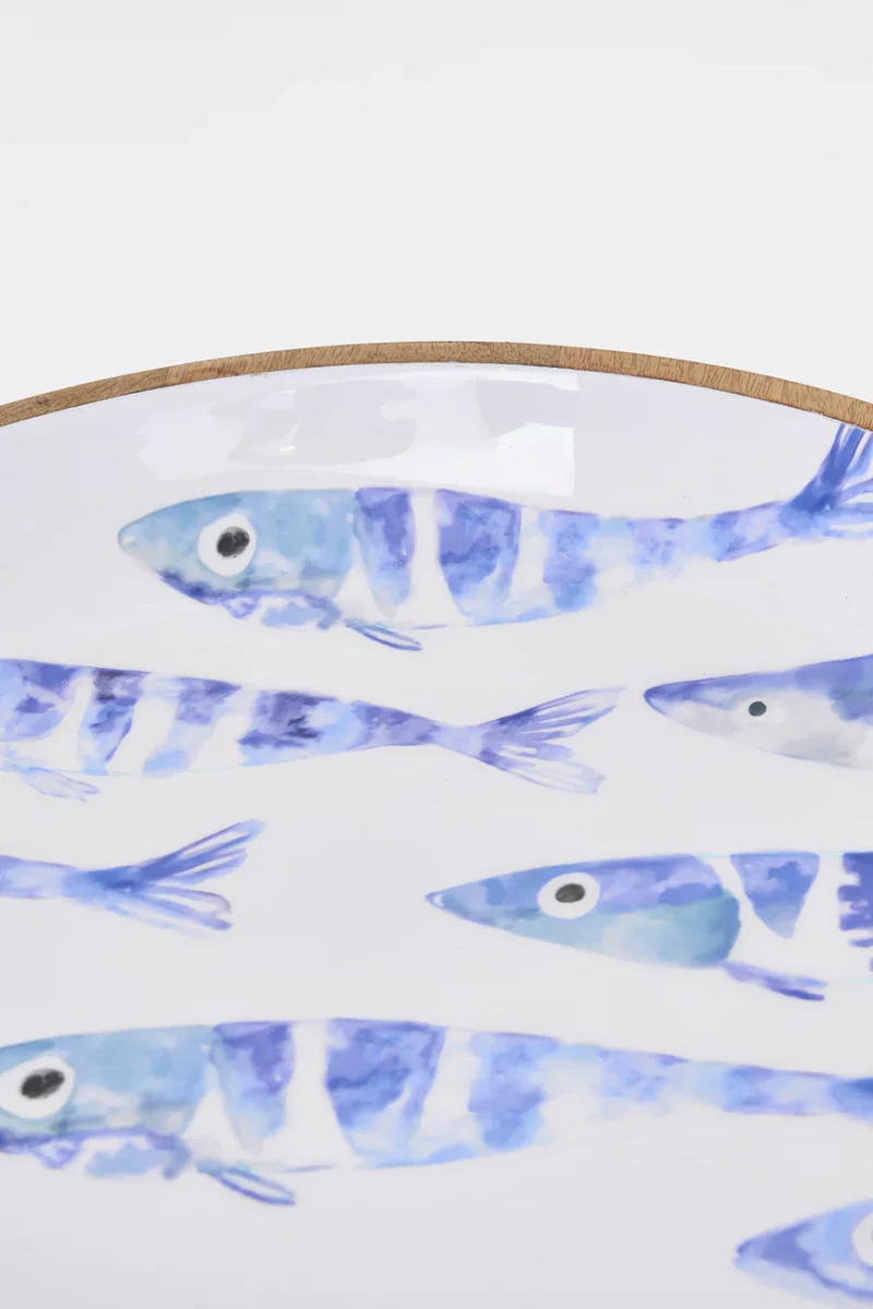 Bol grande elaborado en madera con el interior esmaltado en blanco. Presenta un delicado diseño de un banco de peces en su interior. Una pieza decorativa y funcional con inspiración marinera.