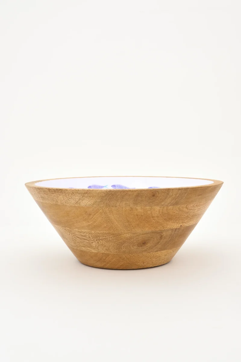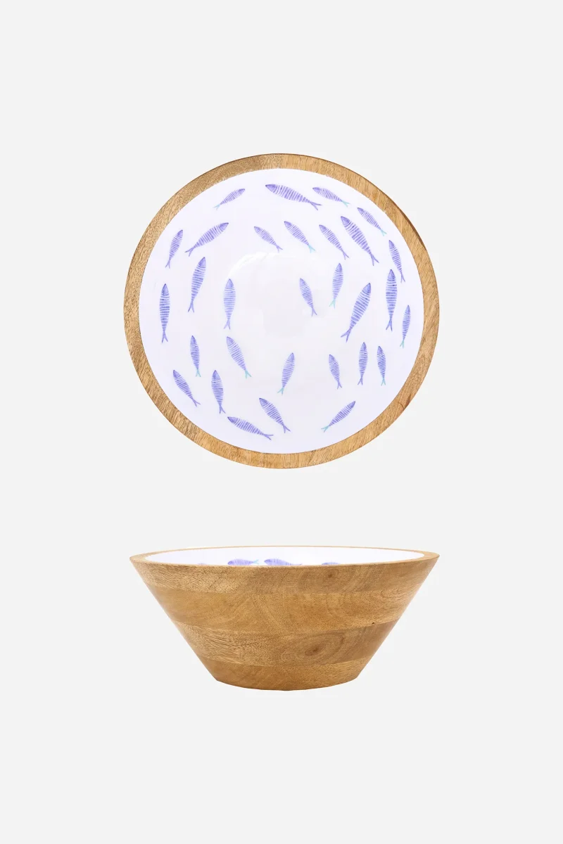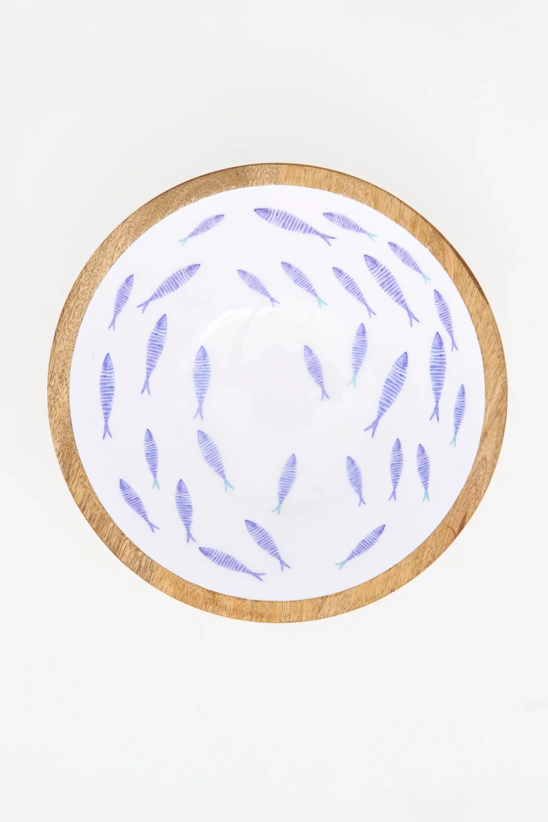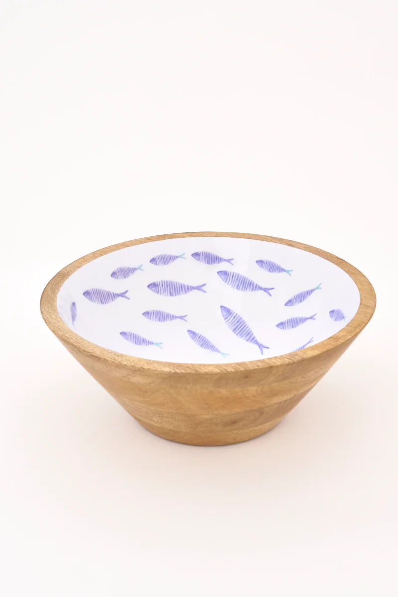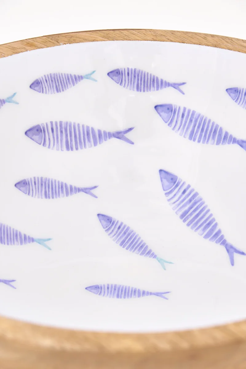 Bol decorativo de tamaño pequeño en madera esmaltada con ilustración de peces en tonos azules sobre fondo claro. Diseño de inspiración náutica con acabado artesanal