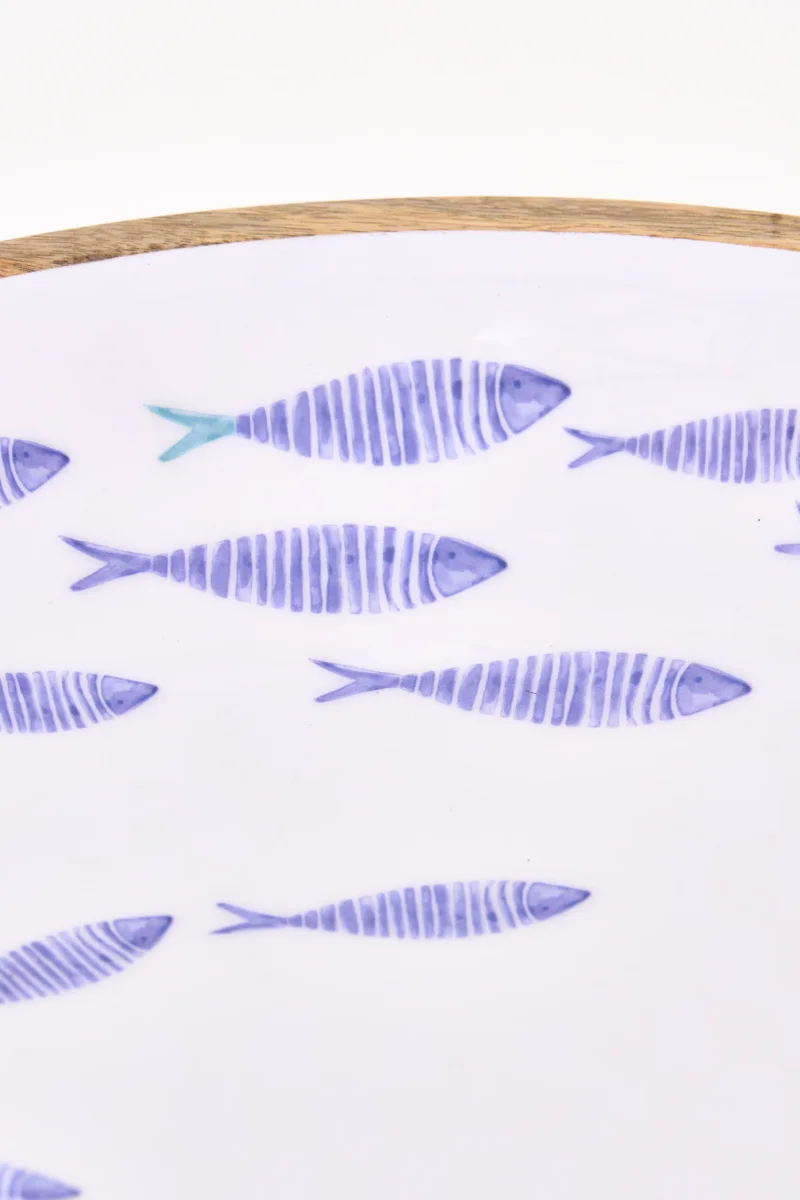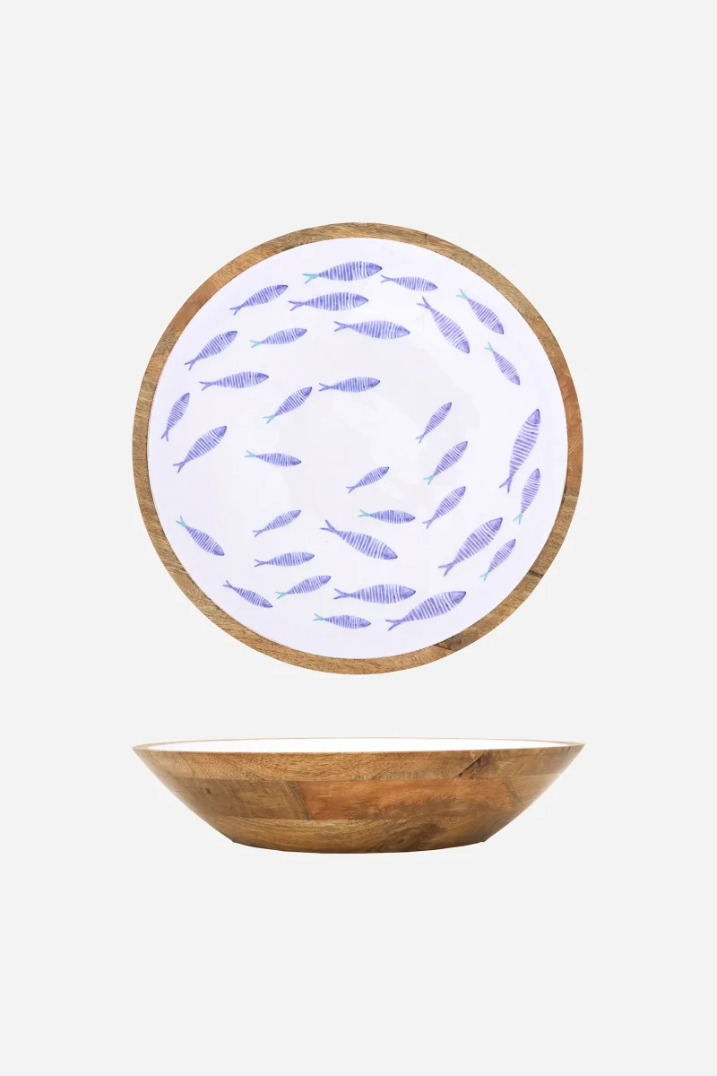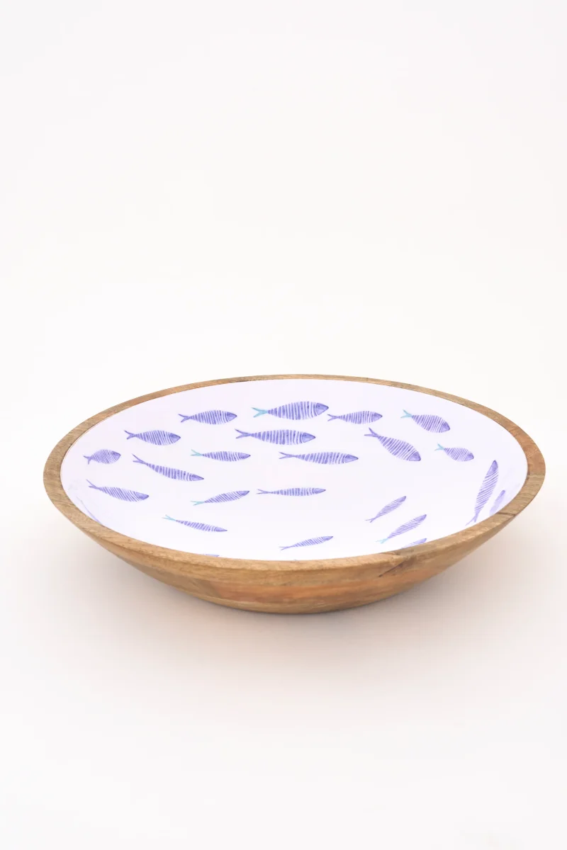 Bol decorativo detamaño medio en madera esmaltada con ilustración de peces en tonos azules sobre fondo claro. Una pieza de inspiración náutica y acabado artesanal