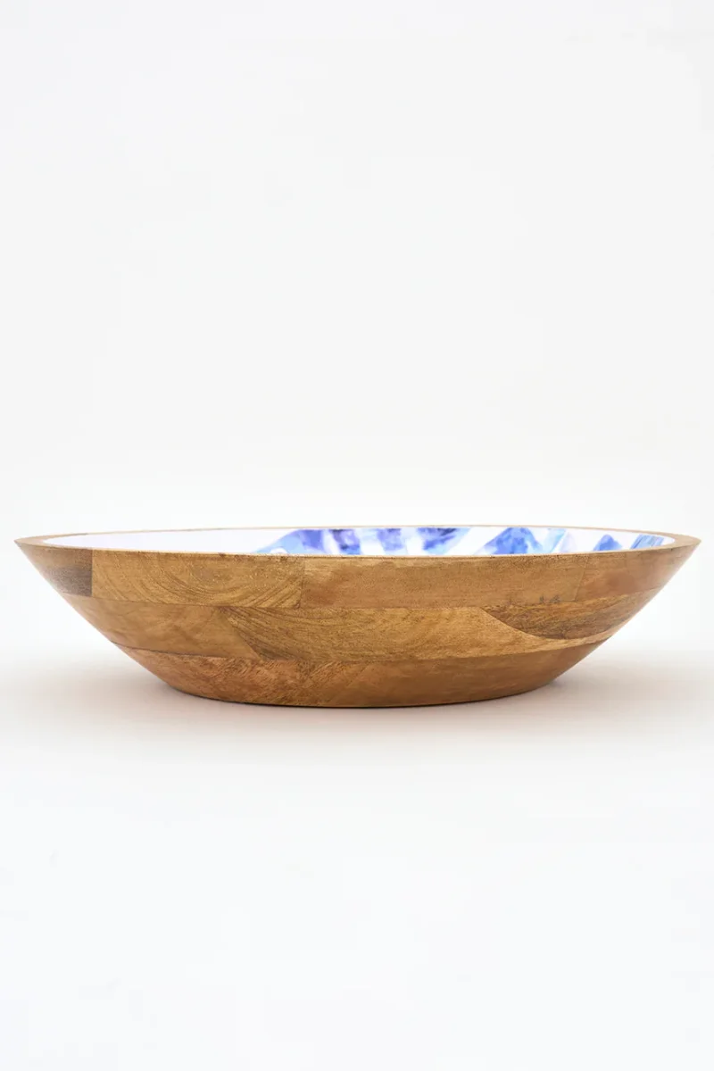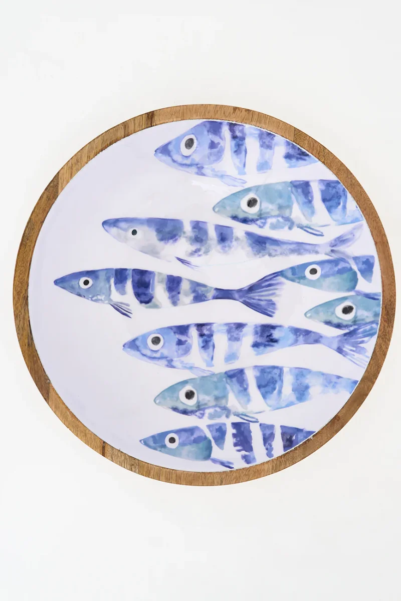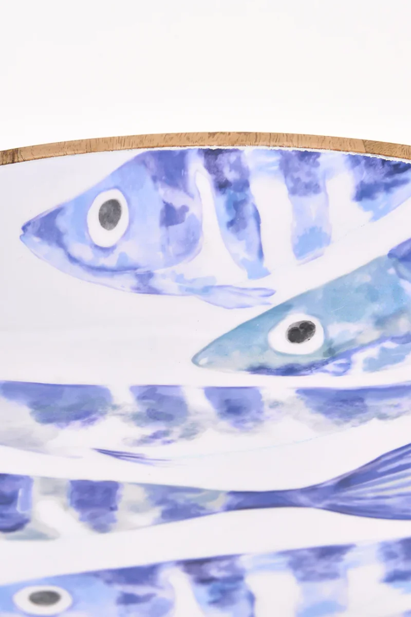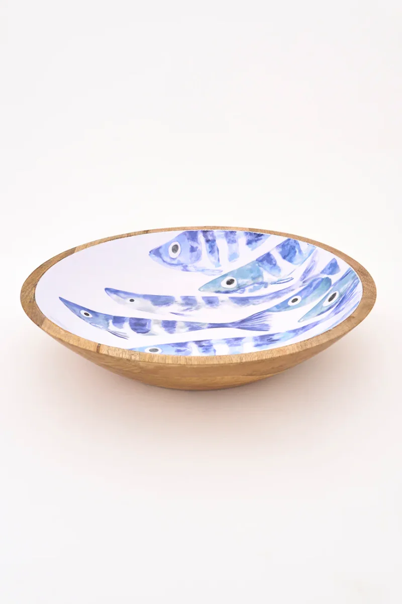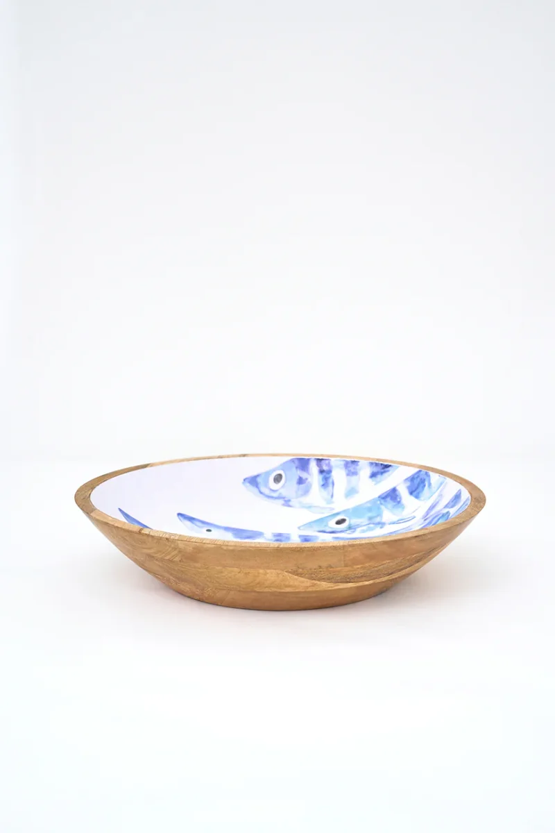 Bol mediano elaborado en madera con el interior esmaltado en blanco. Presenta un delicado diseño de un banco de peces en su interior. Una pieza decorativa y funcional con inspiración marinera.