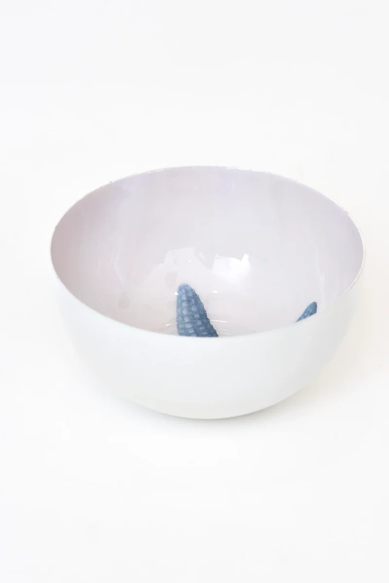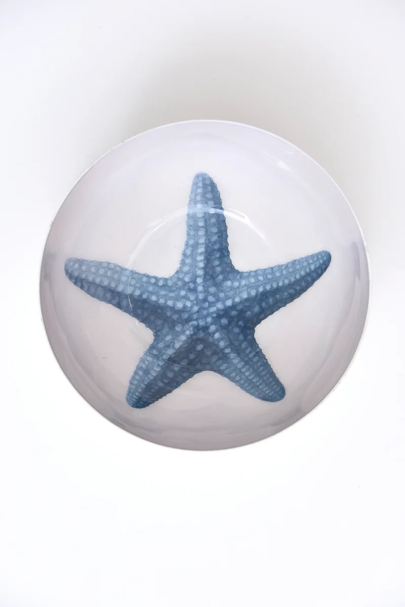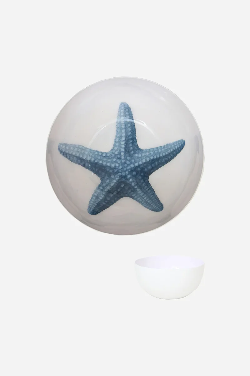 Bol decorativo de metal con estrella de mar en relieve y acabado en tono azul sobre fondo claro. Su diseño limpio y equilibrado aporta un punto visual sereno, ideal para mesas o estanterías.
