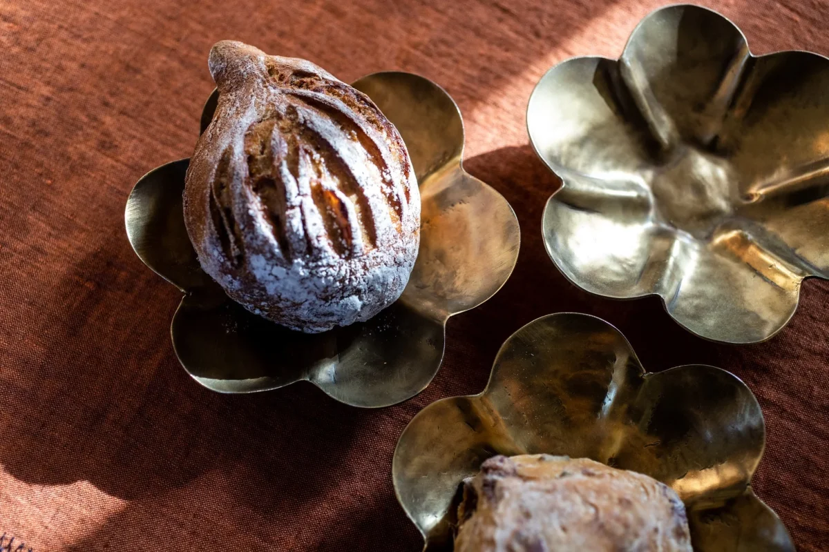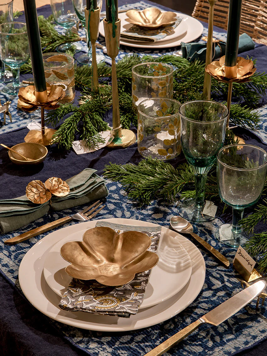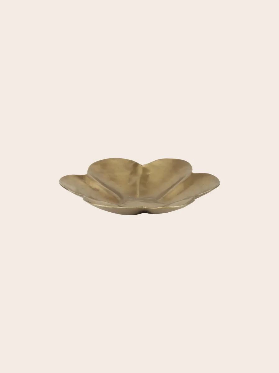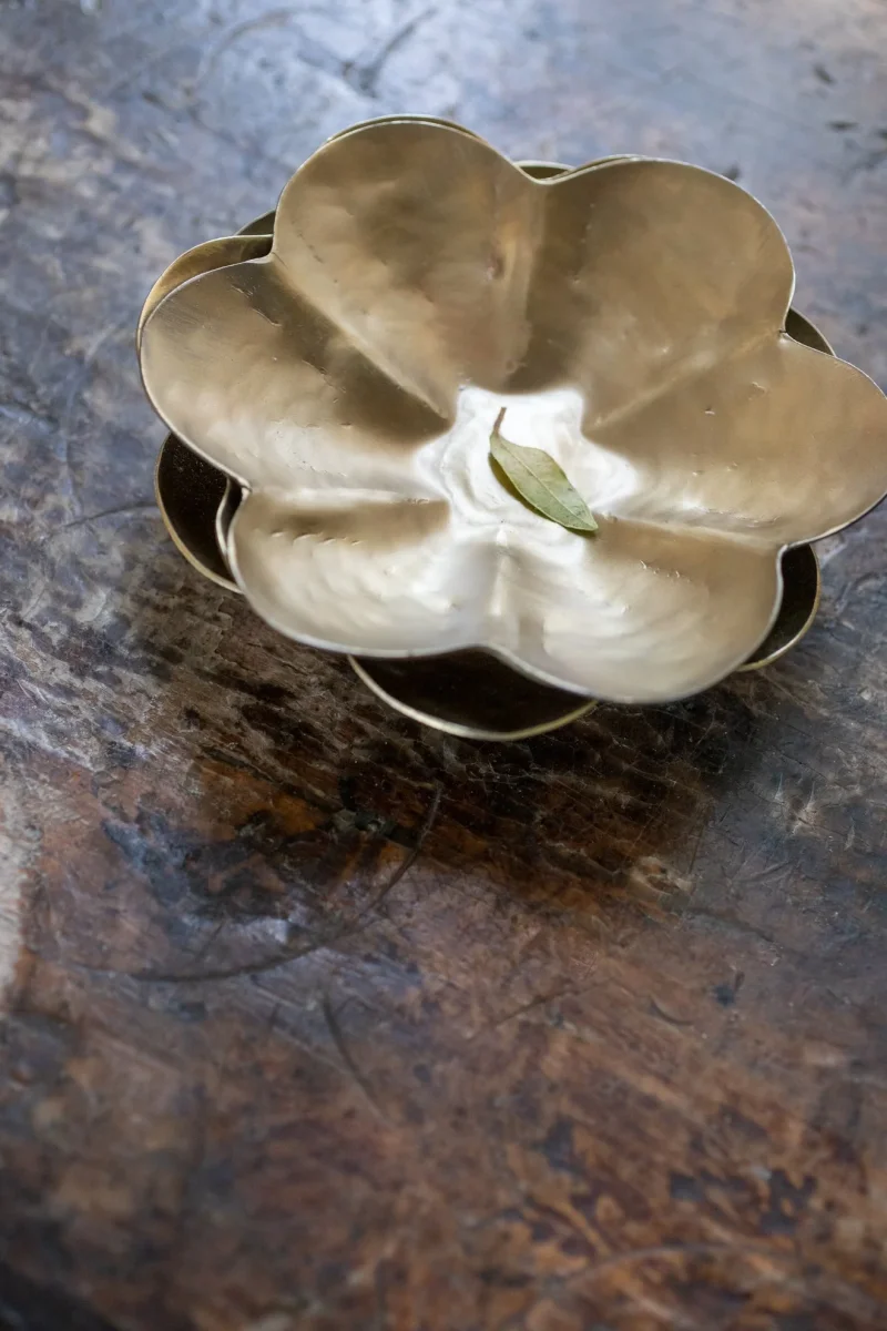 Ses pétales dorés sont tout prêts à accueillir vos clefs, votre monnaie – ou vos snacks, à l’heure de l’apéritif ! Sota , c’est une coupelle que l’on a envie de multiplier sur toutes les tables de fête, formée au marteau après avoir fait chauffer son métal pour lui donner sa silhouette souple. Une fleur qui éclot au centre des mises en place, comme le printemps dont il tire son nom en hindi.