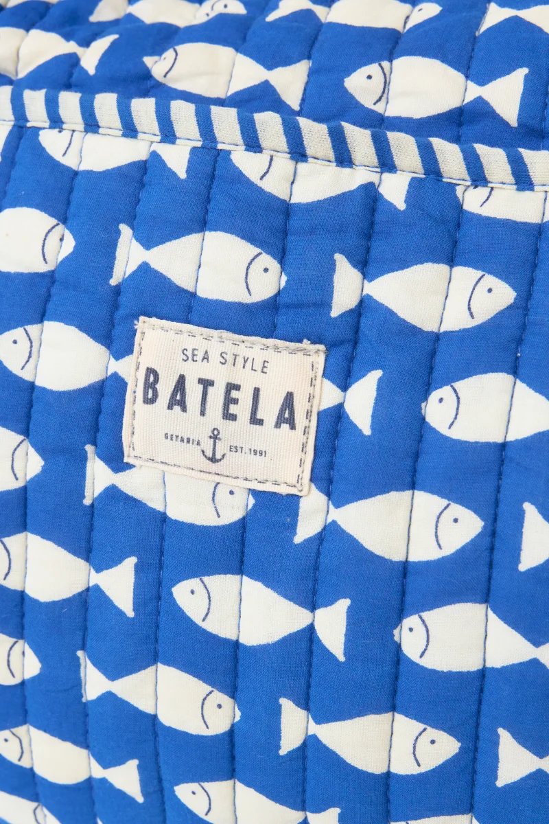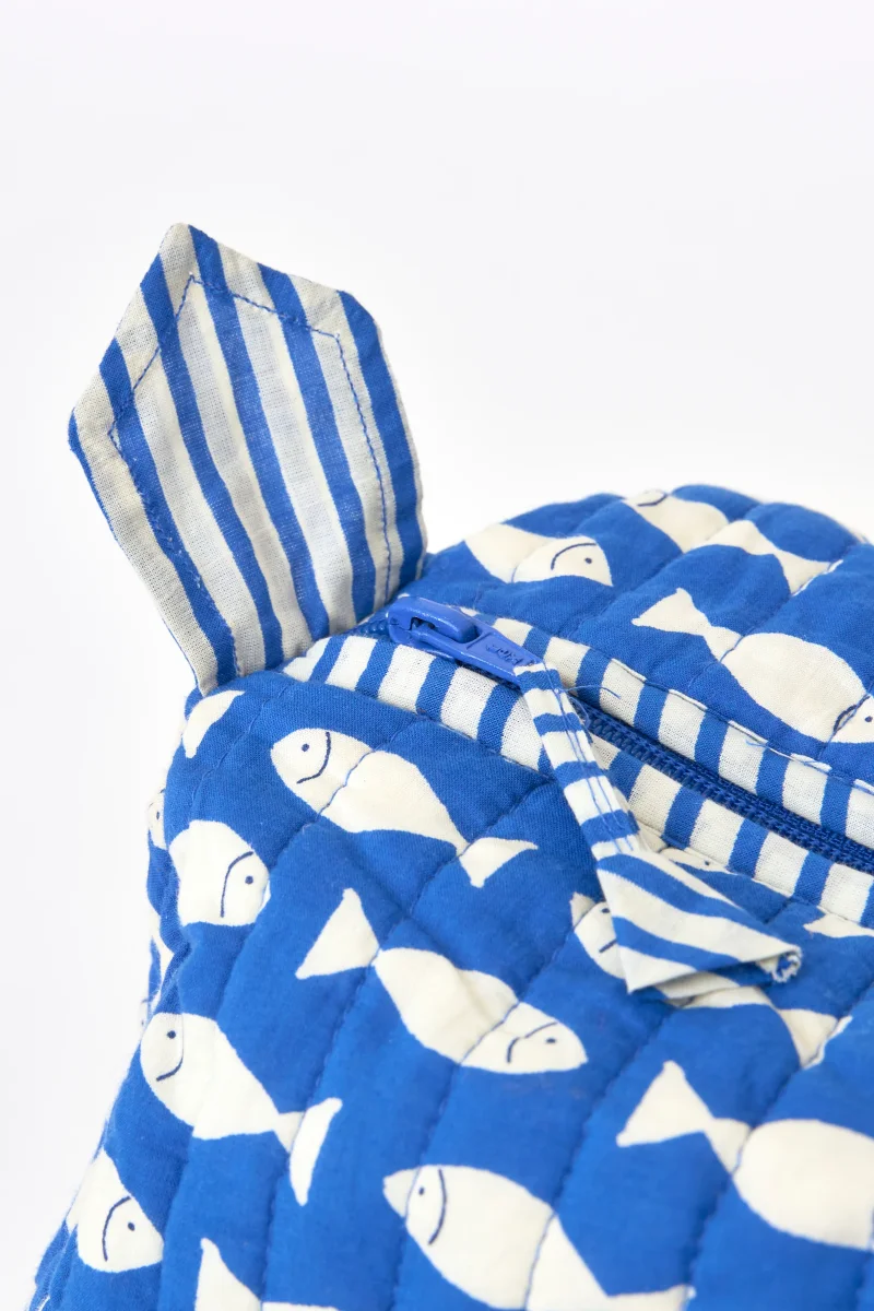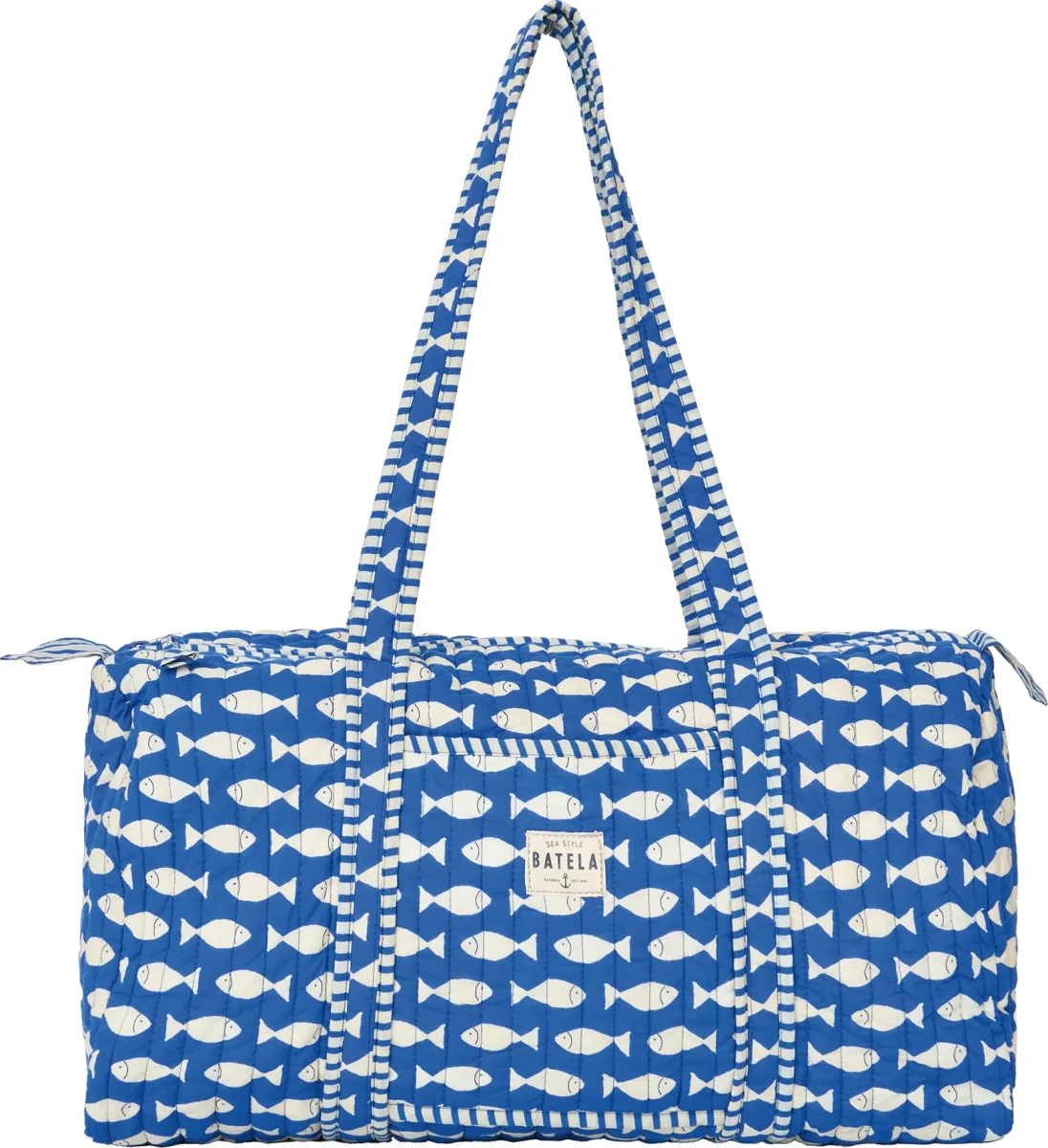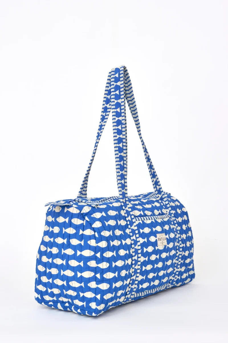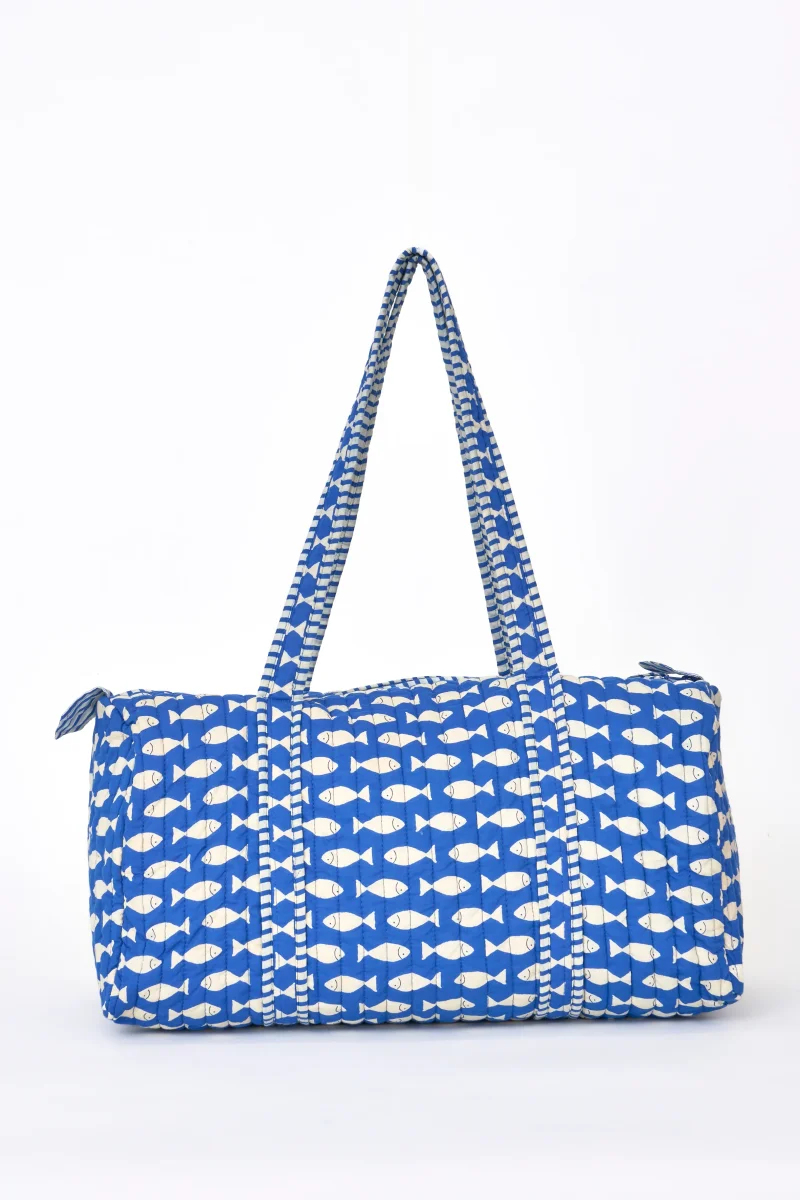 Bolsa de viaje de algodón con estampado de peces blancos sobre fondo azul marino. Un diseño práctico y resistente, con cierre de cremallera y asas largas para llevar cómodamente al hombro.