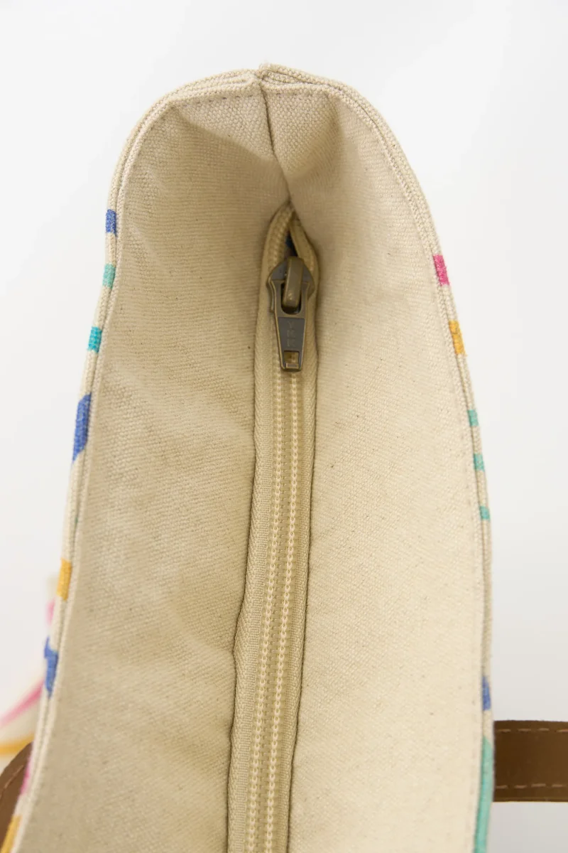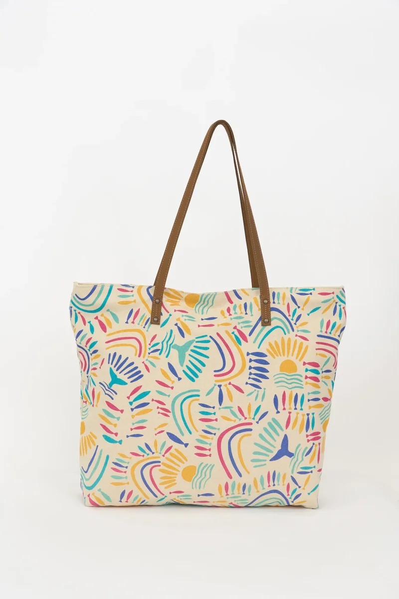 Bolsa tote grande de tela con estampado multicolor de inspiración gráfica. Un diseño amplio y funcional, ideal para el día a día, con asas resistentes y un estilo alegre que aporta color y personalidad a cualquier look.