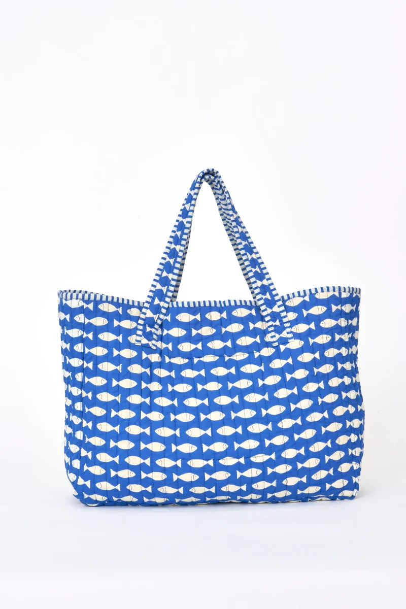 Bolsa tote de algodón con estampado de peces blancos sobre fondo azul marino. Un diseño amplio y resistente, ideal para el día a día, compras o escapadas, con asas largas que permiten llevarla cómodamente al hombro.