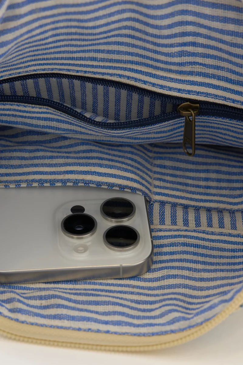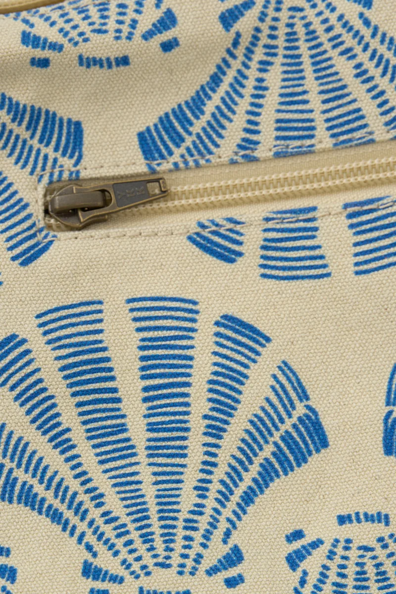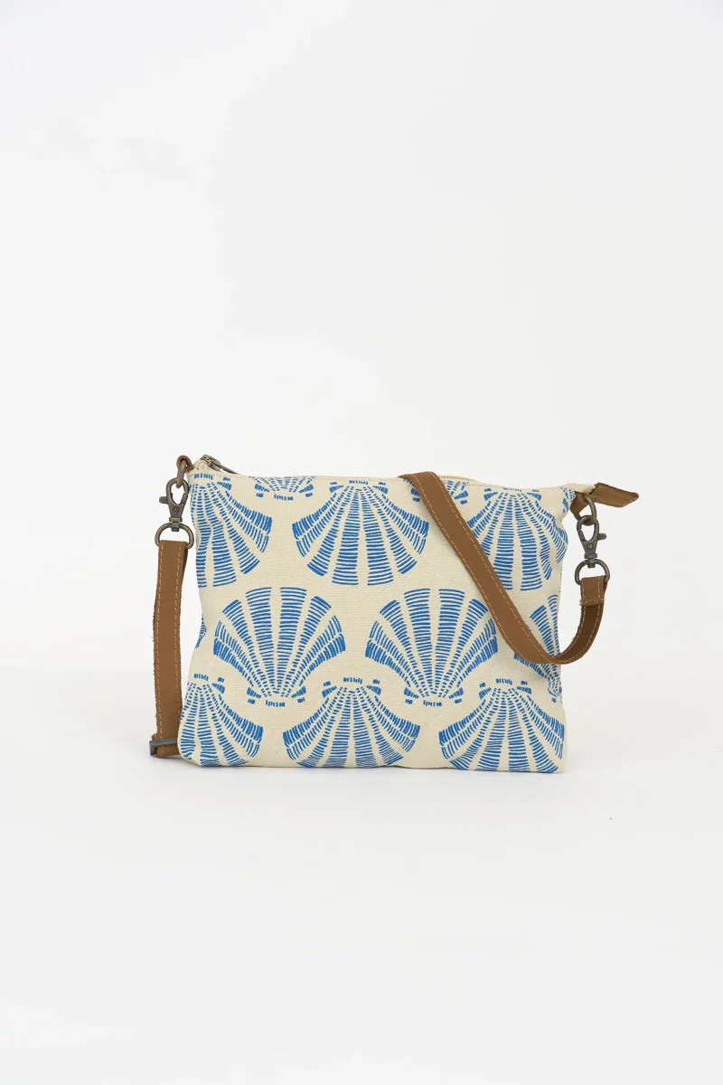 Bolso bandolera de estilo marinero con estampado de conchas en azul sobre fondo claro, ligero y cómodo para el uso diario. Diseño práctico con asa regulable y estampación a doble cara
